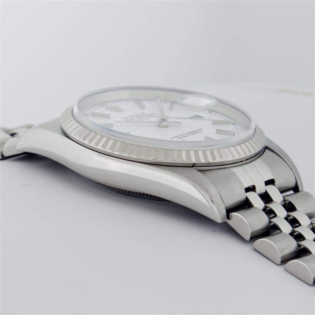 One Mens Rolex Quickset Stainless Steel Datejust Polished Bright with Satin Finish, Serviced & Electronically Tested, Rolex Stainless Steel Case: 36mm, Rolex Stainless Steel Crown, Rolex Bezel: 14K White Gold Fluted Bezel. Crystal: Sapphire With Magnified Date Window. Custom Hands: New Lumi Hands. Rolex Movement: Automatic Winding Movement Caliber 3135. Custom Dial: Refinished To White With Index Hour Markers And Square Roman Track. Date Window: 3 O'Clock Position Date Display, Quickset, Model: Quickset Datejust. Condition: G-6 Extra Fine. Rolex Bracelet: Stainless Steel Jubilee Band. Bright Polish & Satin Finish. 7.0 Inch Length, Adjustable. Standard Clasp, With Rolex Logo. This Pre Owned Watch Has Been Serviced Time Tested And Is In Excellent Condition It Is Free Of All Scratches And Dents.
