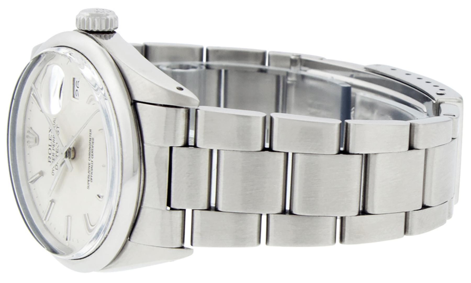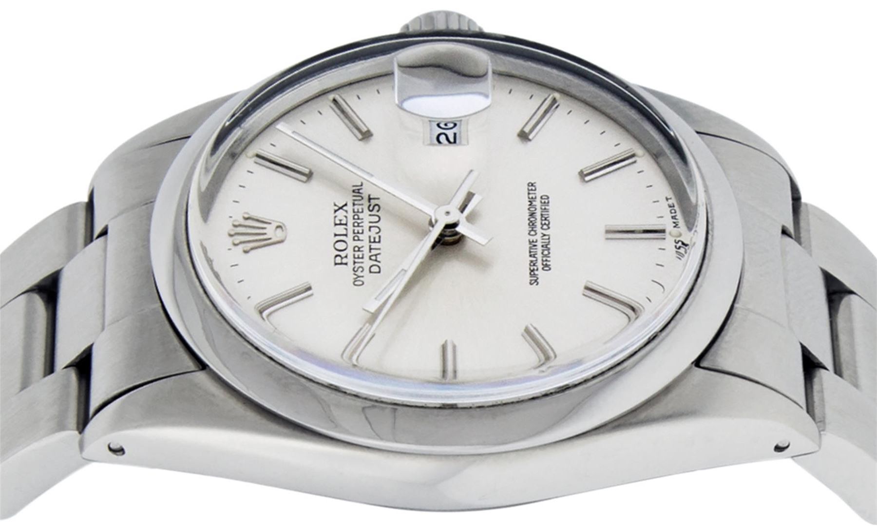 One Mens Rolex Quickset Stainless Steel Datejust Polished Bright with Satin Finish, Serviced & Electronically Tested, Rolex Stainless Steel Case: 36mm, Rolex Stainless Steel Crown, Rolex Bezel: Stainless Steel Smooth Bezel. Crystal: Sapphire With Magnified Date Window. Custom Hands: New Luminescent Hands. Rolex Movement: Automatic Winding Movement Caliber 3135. Rolex Dial: Silver Dial With Index Hour Markers Dash Track And Lumi Dots. Date Window: 3 O'Clock Position Date Display, Quickset, Model: Quickset Datejust. Condition: G-6 Extra Fine. Rolex Bracelet: Stainless Steel Oyster Band. Bright Polish & Satin Finish. 7.0 Inch Length, Adjustable. Standard Clasp, With Rolex Logo. This Pre Owned Watch Has Been Serviced Time Tested And Is In Excellent Condition It Is Free Of All Scratches And Dents.