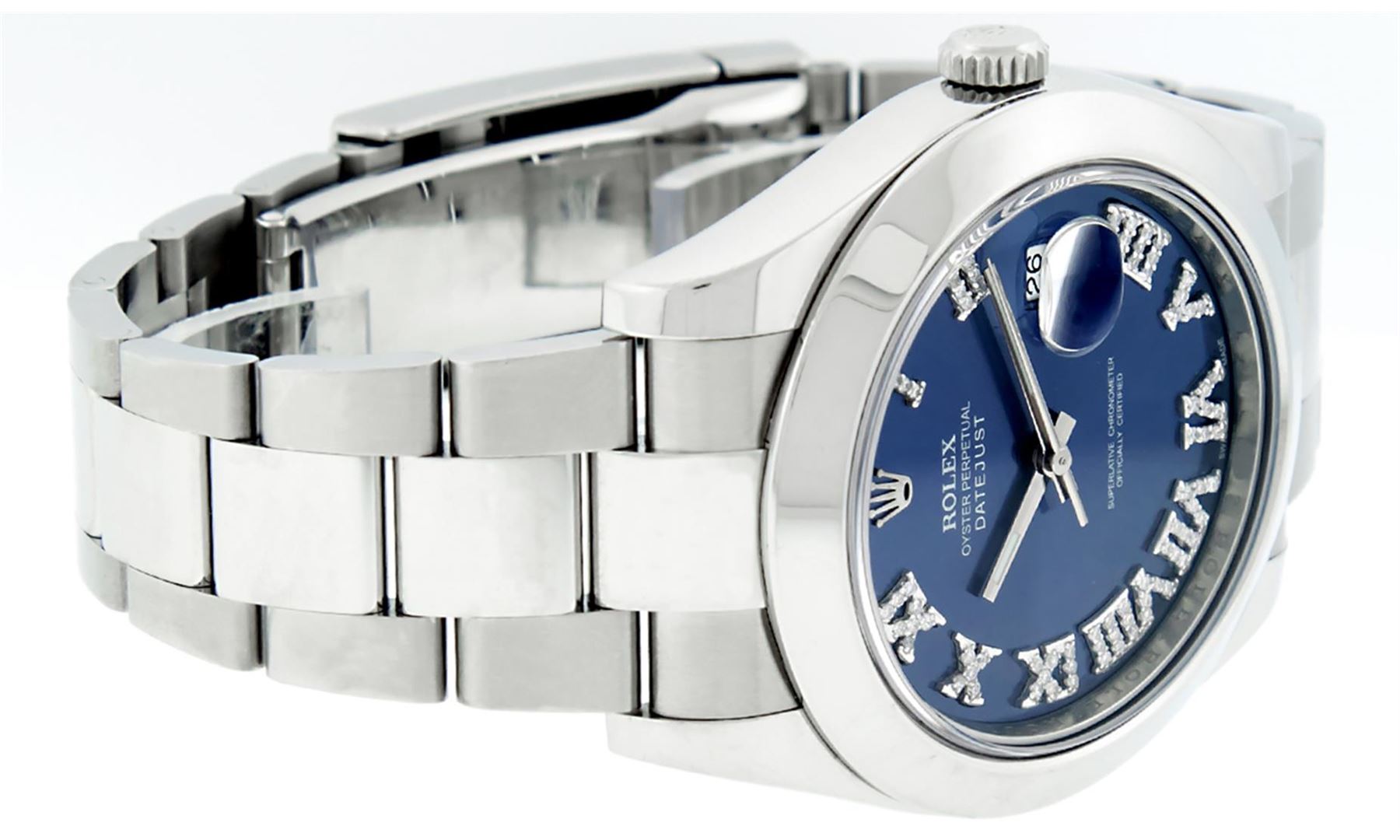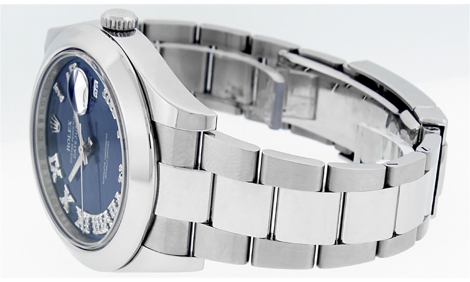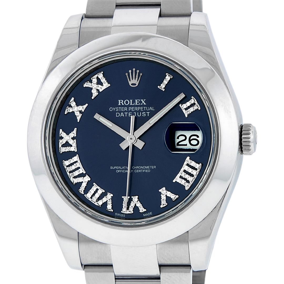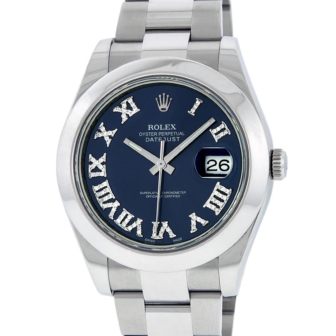 One Mens Rolex Datejust 2 Polished With Shiny Finish, Serviced & Electronically Tested, Stainless Steel Case: 41mm, Stainless Steel Crown, Bezel: Stainless Steel Smooth Bezel, Crystal: Scratch Resistant Synthetic Sapphire Cyclops Lens. Movement: Automatic Winding Movement Caliber 3136. Custom Dial: Blue Roman Diamond Dial, Diamond Color: G To H, Clarity: SI-VS. Date Window: 3 O'Clock Position Date Display, Quickset, Model: Datejust 2. Condition: G-6 Extra Fine The Watch Is In Very Good Condition Free Of All Scratches And Dents. Bracelet: Stainless Steel Oyster Band. Bright Polish & Satin Finish. 7.5 Inch Length, Adjustable. Standard Clasp, With Rolex Logo. This Watch Has Been Serviced Time Tested And Is In Excellent Condition It Is Free Of All Scratches And Dents. This Watch Comes With A Rolex Box.