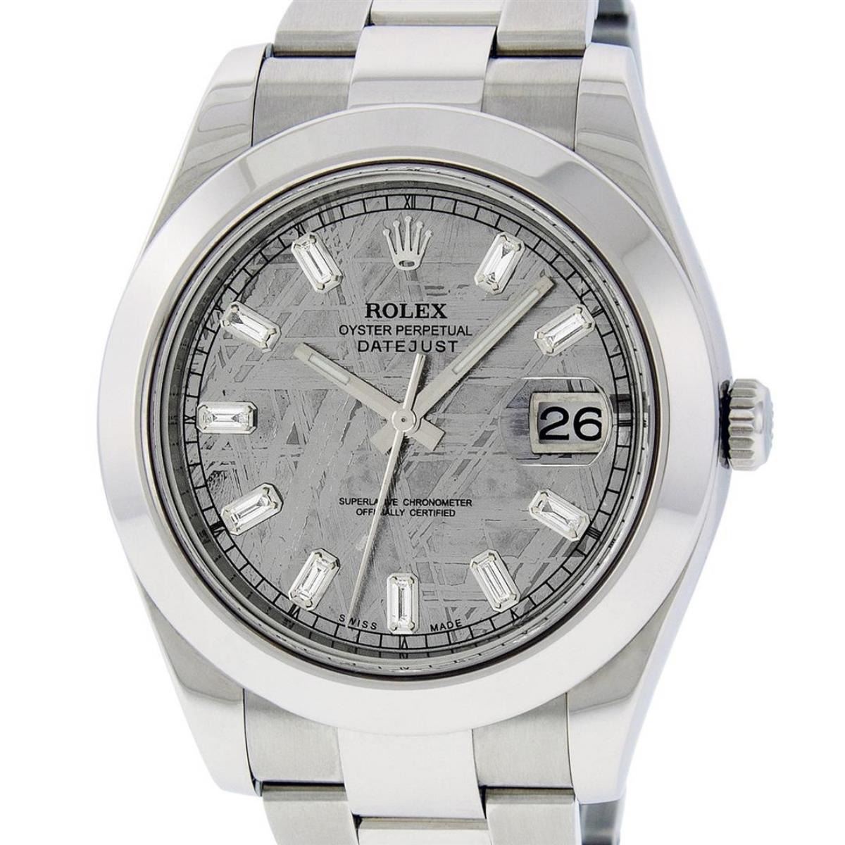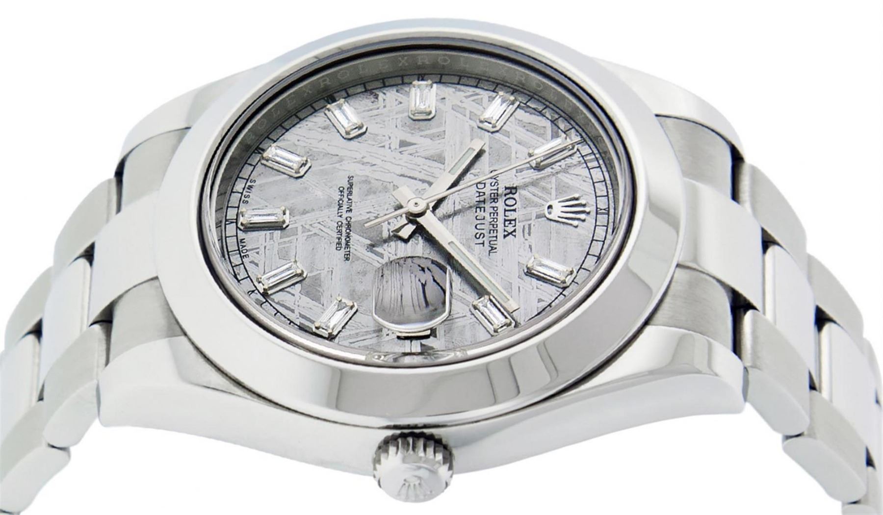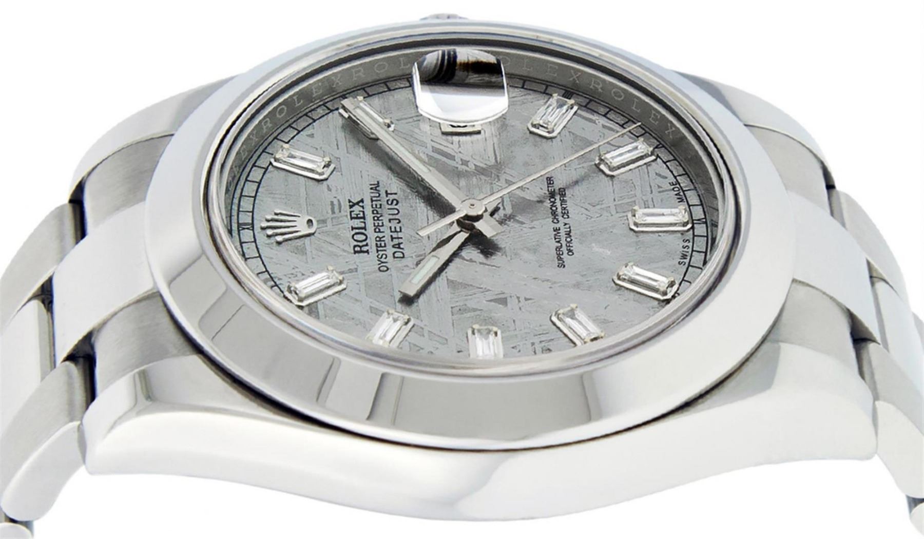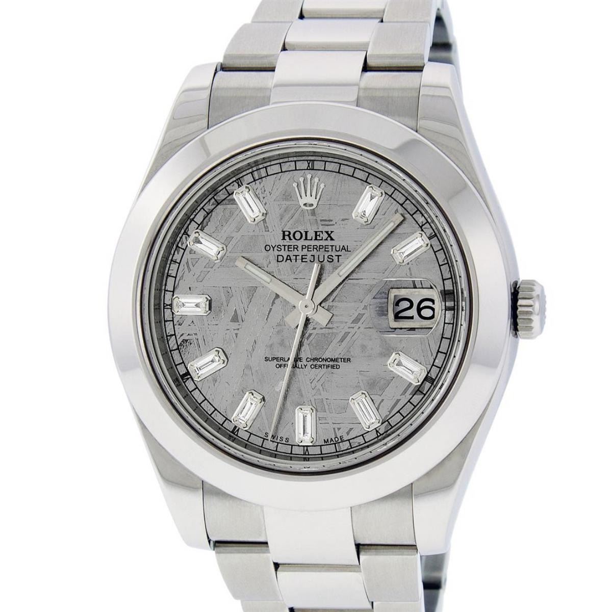 One Mens Rolex Datejust 2 Polished With Shiny Finish, Serviced & Electronically Tested, Stainless Steel Case: 41mm, Stainless Steel Crown, Bezel: Stainless Steel Smooth Bezel, Crystal: Scratch Resistant Synthetic Sapphire Cyclops Lens. Movement: Automatic Winding Movement Caliber 3136. Custom Dial: Meteorite Baguette Diamond Dial, Diamond Count: 10 Diamonds On Dial, Diamond Color: G To H, Clarity: SI-VS. Date Window: 3 O'Clock Position Date Display, Quickset, Model: Datejust 2. Condition: G-6 Extra Fine The Watch Is In Very Good Condition Free Of All Scratches And Dents. Bracelet: Stainless Steel Oyster Band. Bright Polish & Satin Finish. 7.5 Inch Length, Adjustable. Standard Clasp, With Rolex Logo. This Watch Has Been Serviced Time Tested And Is In Excellent Condition It Is Free Of All Scratches And Dents. This Watch Comes With A Rolex Box and Watch Winder.