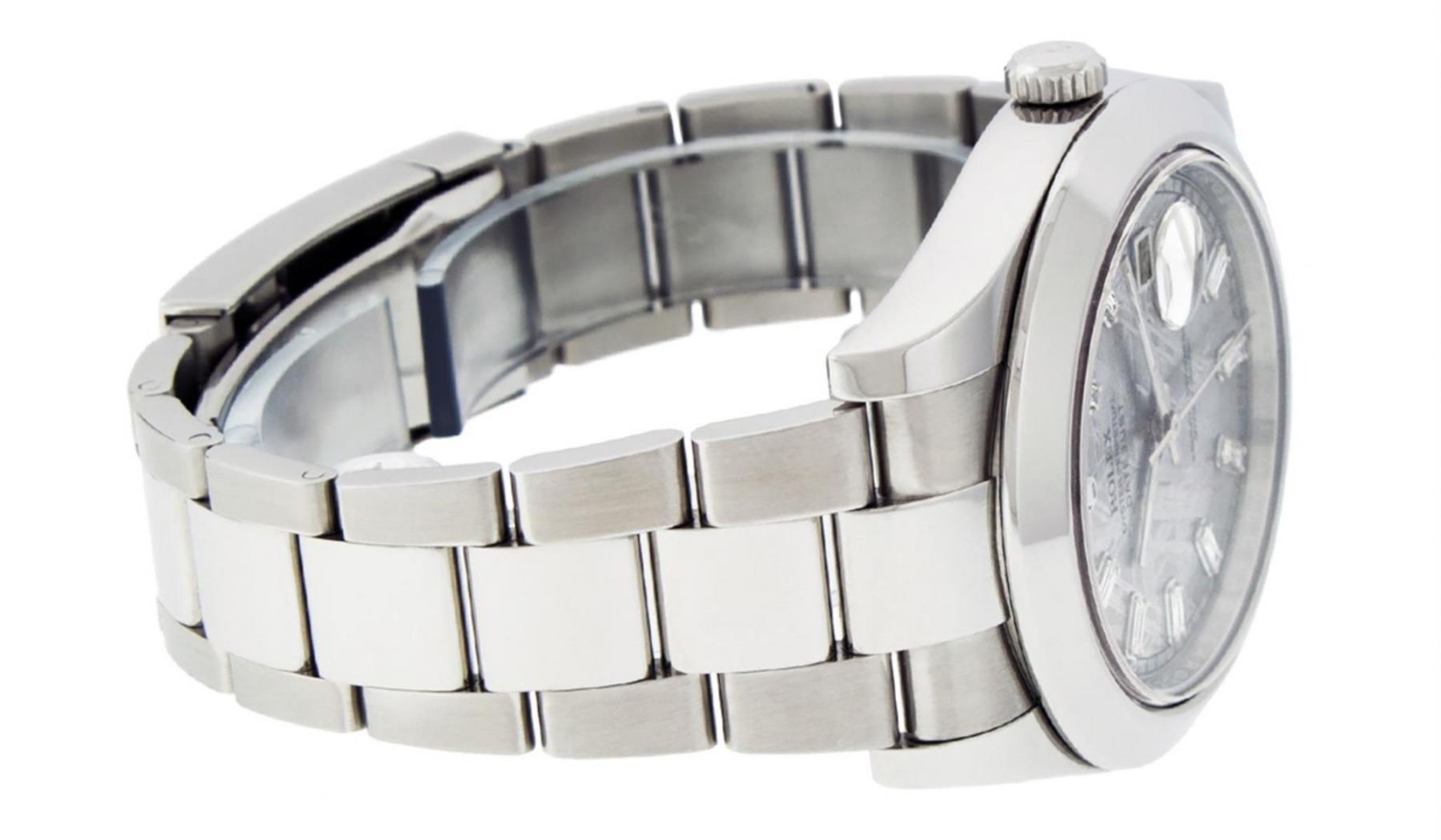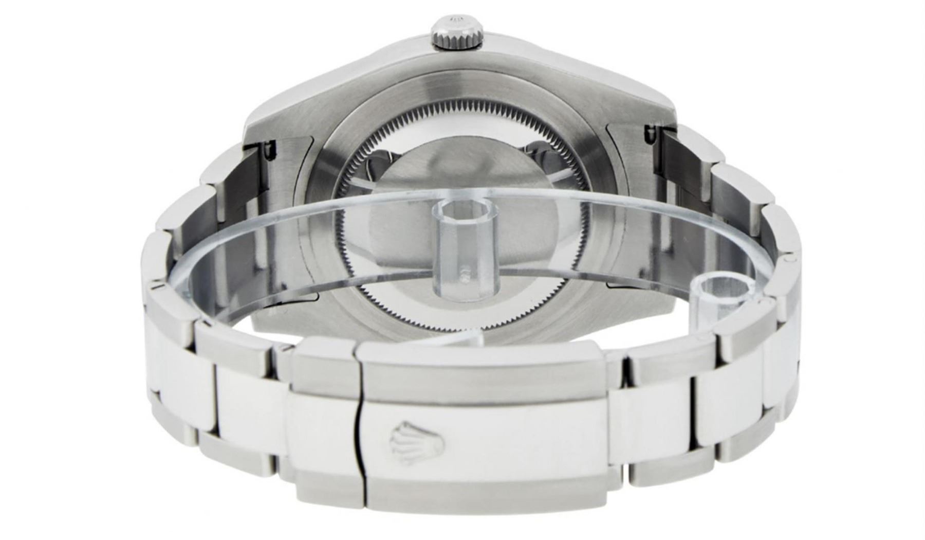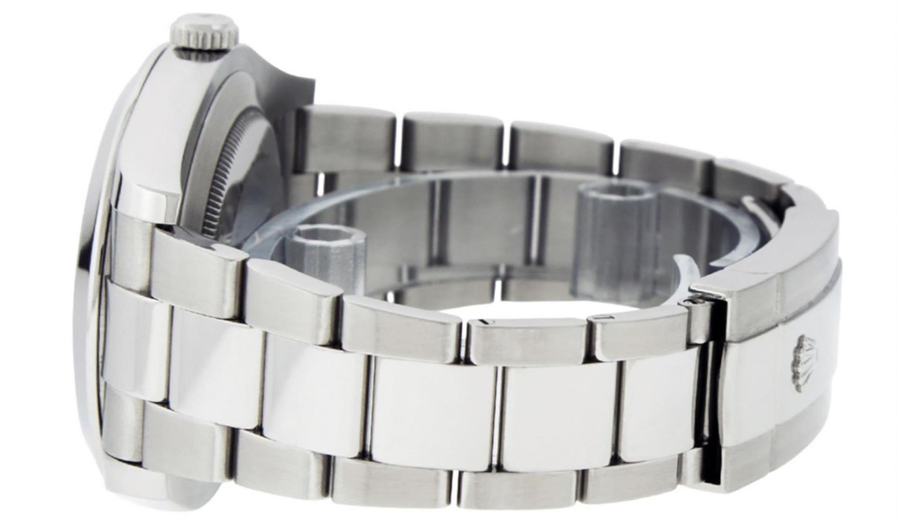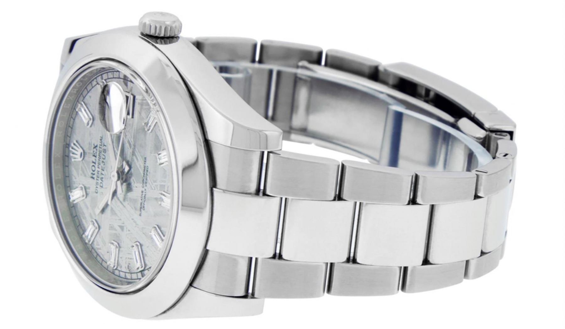 One Mens Rolex Datejust 2 Polished With Shiny Finish, Serviced & Electronically Tested, Stainless Steel Case: 41mm, Stainless Steel Crown, Bezel: Stainless Steel Smooth Bezel, Crystal: Scratch Resistant Synthetic Sapphire Cyclops Lens. Movement: Automatic Winding Movement Caliber 3136. Custom Dial: Meteorite Baguette Diamond Dial, Diamond Count: 10 Diamonds On Dial, Diamond Color: G To H, Clarity: SI-VS. Date Window: 3 O'Clock Position Date Display, Quickset, Model: Datejust 2. Condition: G-6 Extra Fine The Watch Is In Very Good Condition Free Of All Scratches And Dents. Bracelet: Stainless Steel Oyster Band. Bright Polish & Satin Finish. 7.5 Inch Length, Adjustable. Standard Clasp, With Rolex Logo. This Watch Has Been Serviced Time Tested And Is In Excellent Condition It Is Free Of All Scratches And Dents. This Watch Comes With A Rolex Box and Watch Winder.