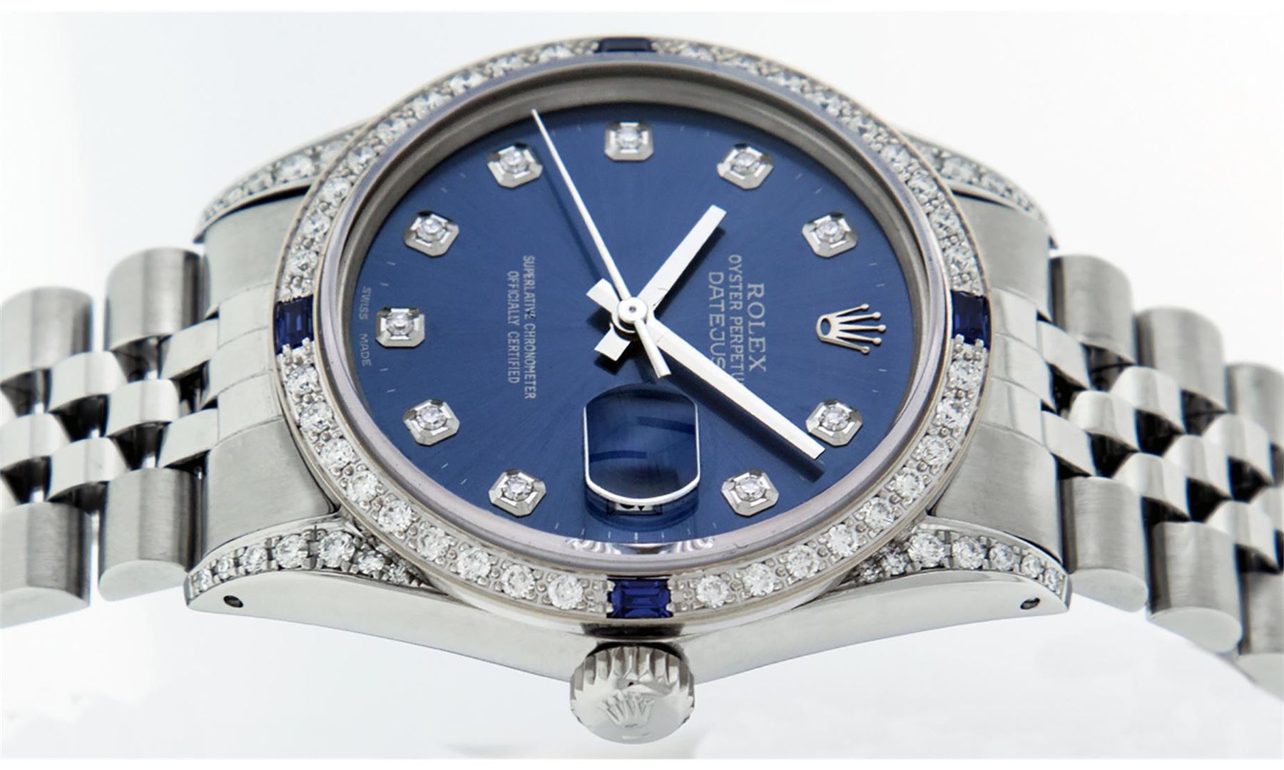 One Mens Rolex Datejust Polished Bright with Satin Finish, Serviced & Electronically Tested, Stainless Steel Case: 36mm, Custom Diamond Lugs: 28 Diamonds In Lugs, Color: G to H, Clarity: SI-VS. Stainless Steel Crown, Custom Bezel: 18K White Gold Diamond + Sapphire Beadset, Diamond Count: 36 Diamonds + 4 Sapphires, Total Weight 1.00 Carat, Clarity: SI-VS, Color: G to H. Custom Crystal: New Scratch Resistant Synthetic Sapphire Cyclops Lens. Custom Hands: New Luminescent Hands. Movement: Automatic Winding Movement. Custom Dial: Blue Diamond Dial With Dash Track, Stone Count: 10 Diamonds, Diamond Color: G To H In Color, Clarity: SI-VS. Date Window: 3 O'Clock Position Date Display, Quickset, Model: Datejust Condition: G-6 Extra Fine. Bracelet: Stainless Steel Jubilee Band. Bright Polish & Satin Finish. 7.0 Inch Length, Adjustable. Standard Clasp, With Rolex Logo. This Watch Has Been Serviced And Polished And Its Free Of All Dents And Scratches.