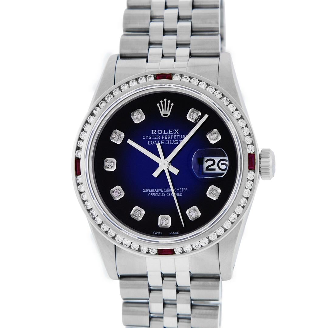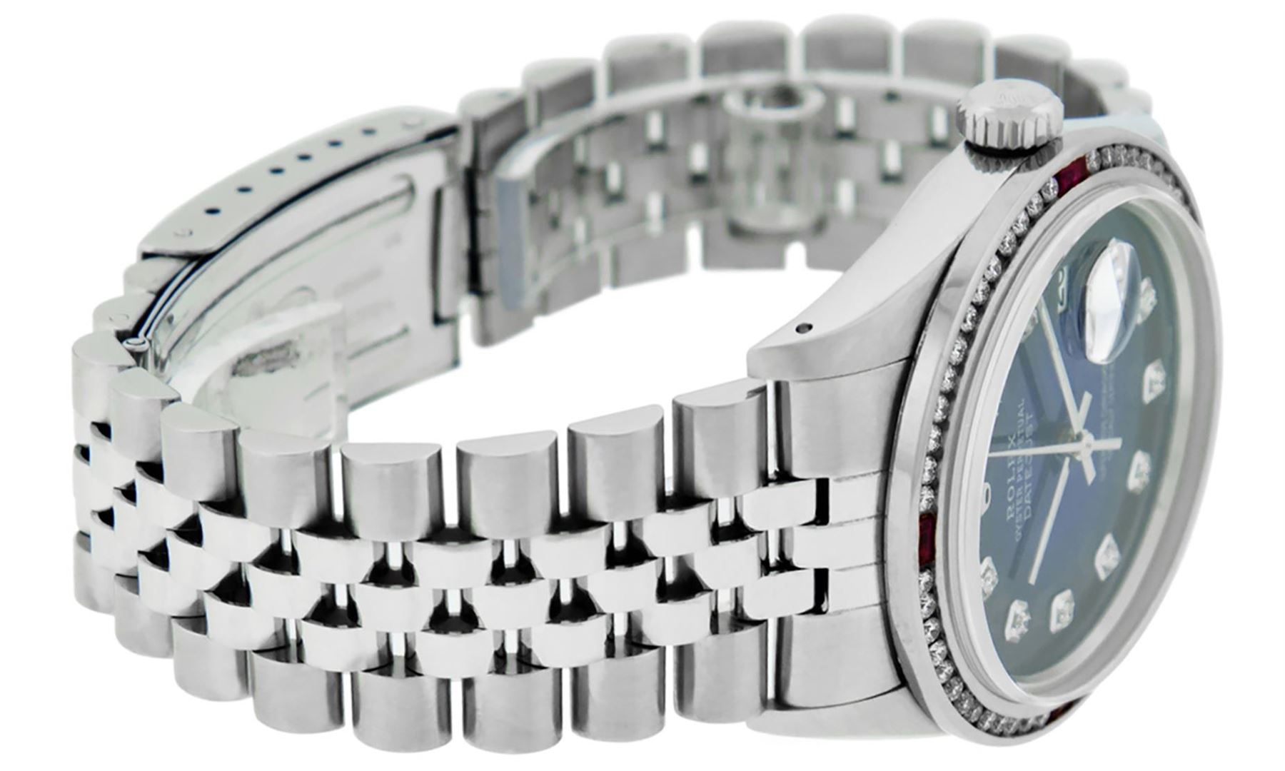 One Mens Stainless Steel Rolex Datejust Polished Bright with Satin Finish, This Watch Has Been Serviced & Electronically Tested, Stainless Steel Case: 36mm, Stainless Steel Crown, Custom Bezel: New 18K White Gold Ruby Channel Set Diamond Bezel, Diamond + Gem Count: 52 Diamonds + 4 Rubies, Total Weight 1.30 Carat, Clarity: SI-VS, Color: G to H. Custom Crystal: New Synthetic Sapphire Cyclops Lens. Custom Hands: New Luminescent Hands. Movement: Automatic Winding Movement Caliber 3035. Custom Dial: Blue Vignette Diamond Dial, Diamond Count: 10 Diamonds in Dial, Diamond Color: G To H In Color, Clarity: SI-VS. Date Window: 3 O'Clock Position Date Display, Quickset, Model: Datejust, Condition: G-6 Extra Fine. Bracelet: Stainless Steel Jubilee. Bracelet: 7.0 Inch Length, Adjustable. Standard Clasp, With Rolex Logo. This Watch Has Been Serviced Time Tested And Is In Excellent Condition It Is Free Of All Scratches And Dents.