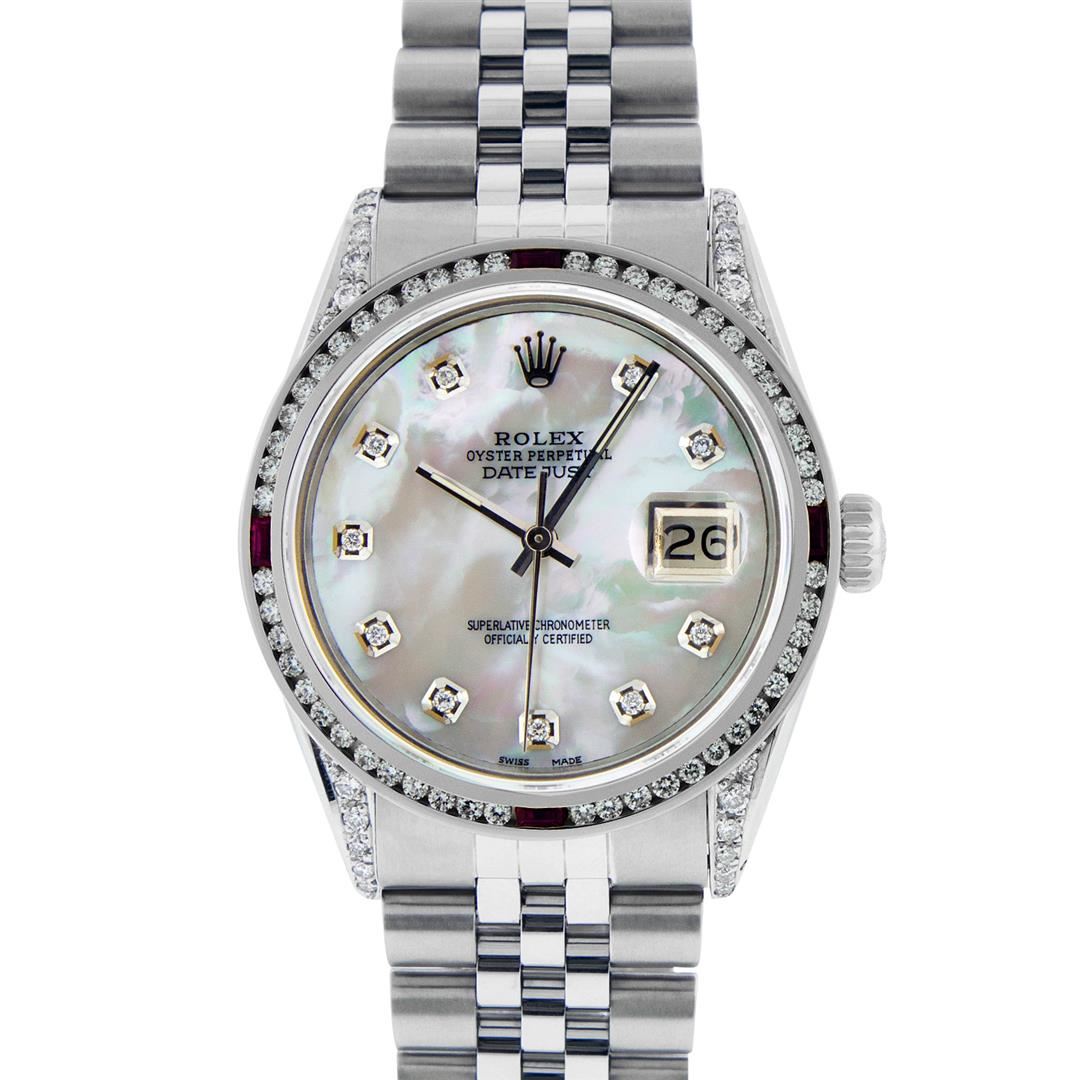 One Mens Rolex Datejust Polished Bright with Satin Finish, Serviced & Electronically Tested, Stainless Steel Case: 36mm, Custom Diamond Lugs: 28 Diamonds In Lugs, Color: G to H, Clarity: SI-VS. Stainless Steel Crown, Custom Bezel: New 18K White Gold Ruby Channel Set Diamond Bezel, Diamond + Gem Count: 52 Diamonds + 4 Rubies, Total Weight 1.30 Carat, Clarity: SI-VS, Color: G to H. Custom Crystal: New Synthetic Sapphire Cyclops Lens. Custom Hands: New Luminescent Hands. Movement: Automatic Winding Movement Caliber 3035. Custom Dial: Mother Of Pearl Diamond Dial, Diamond Count: 10 Diamonds In Dial, Diamond Color: G To H In Color, Clarity: SI-VS. Date Window: 3 O'Clock Position Date Display, Quickset, Model: Datejust Condition: G-6 Extra Fine. Bracelet: Stainless Steel Jubilee Band. Bright Polish & Satin Finish. 7.0 Inch Length, Adjustable. Standard Clasp, With Rolex Logo. This Watch Has Been Serviced And Polished And Its Free Of All Dents And Scratches.