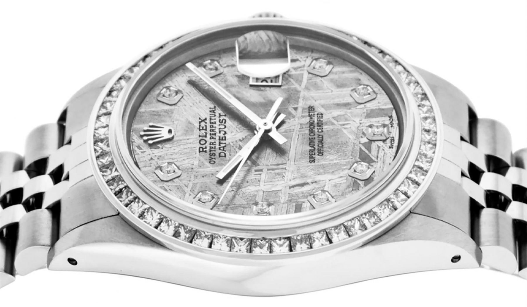 One Mens Stainless Steel Rolex Datejust Polished Bright with Satin Finish, Fully Serviced & Electronically Tested, Stainless Steel Case: 36mm, Stainless Steel Crown, Custom Bezel: New 14K White Gold 2.75 Carat Princess Cut Diamond Bezel, Diamond Count: 53 Diamonds, Total Weight 2.75 Carat, Clarity: SI-VS, Color: G to H. Custom Crystal: New Scratch Resistant Synthetic Sapphire Cyclops Lens. Custom Hands: New Luminecent Hands. Movement: Automatic Winding Movement Caliber 3035. Custom Dial: Meteorite Diamond Dial, 10 Diamonds in Dial, G To H In Color, Clarity: SI-VS. Date Window: 3 O'Clock Position Date Display, Quickset, Model: Datejust 36mm, Condition: G-6 Extra Fine. Bracelet: Rolex Stainless Steel Jubilee Band. Bright Polish & Satin Finish. 7.0 Inch Length, Adjustable. Standard Clasp, With Rolex Logo. Watch Has Been Serviced And Polished It Is Free Of All Scratches And Dents.