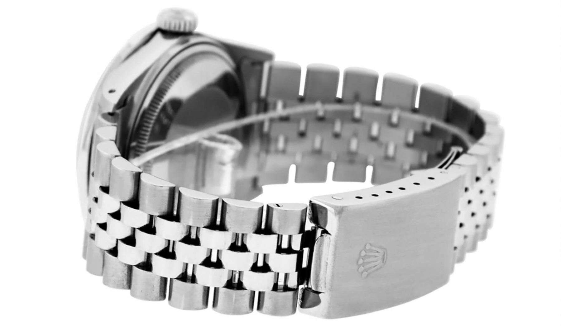 One Mens Stainless Steel Rolex Datejust Polished Bright with Satin Finish, Fully Serviced & Electronically Tested, Stainless Steel Case: 36mm, Stainless Steel Crown, Custom Bezel: New 14K White Gold 2.75 Carat Princess Cut Diamond Bezel, Diamond Count: 53 Diamonds, Total Weight 2.75 Carat, Clarity: SI-VS, Color: G to H. Custom Crystal: New Scratch Resistant Synthetic Sapphire Cyclops Lens. Custom Hands: New Luminecent Hands. Movement: Automatic Winding Movement Caliber 3035. Custom Dial: Meteorite Diamond Dial, 10 Diamonds in Dial, G To H In Color, Clarity: SI-VS. Date Window: 3 O'Clock Position Date Display, Quickset, Model: Datejust 36mm, Condition: G-6 Extra Fine. Bracelet: Rolex Stainless Steel Jubilee Band. Bright Polish & Satin Finish. 7.0 Inch Length, Adjustable. Standard Clasp, With Rolex Logo. Watch Has Been Serviced And Polished It Is Free Of All Scratches And Dents.