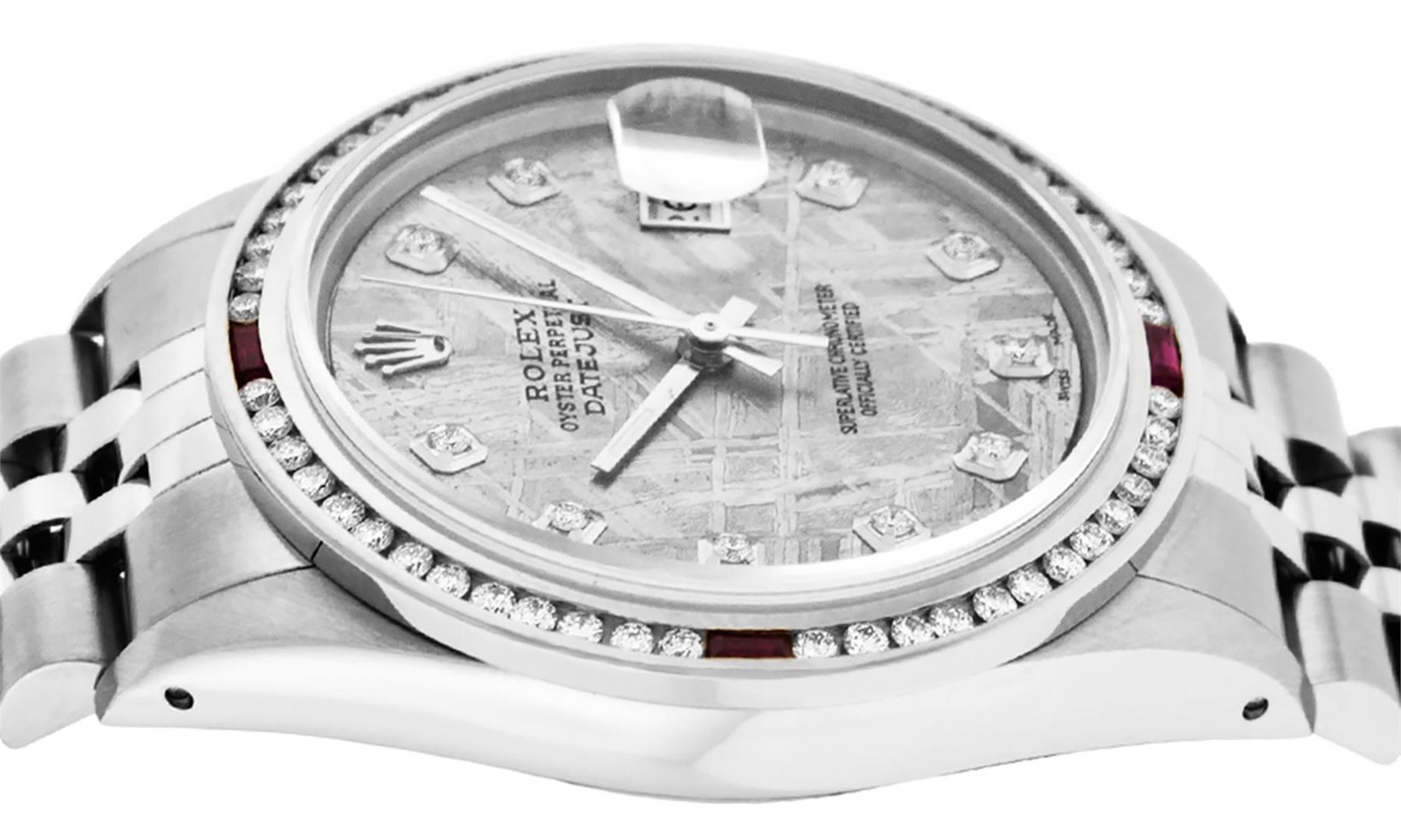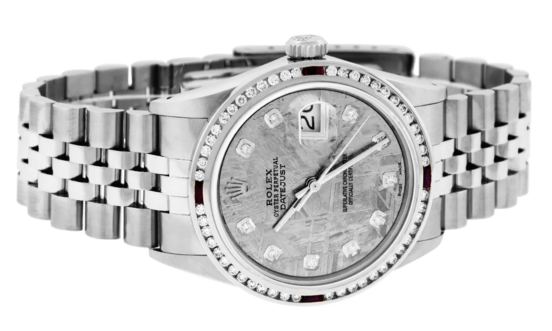 One Mens Stainless Steel Rolex Datejust Polished Bright with Satin Finish, This Watch Has Been Serviced & Electronically Time Tested, Stainless Steel Case: 36mm, Stainless Steel Crown, Custom Bezel: New 18K White Gold Ruby Channel Set Diamond Bezel, Diamond + Gem Count: 52 Diamonds + 4 Rubies, Total Weight 1.30 Carat, Clarity: SI-VS, Color: G to H. Custom Crystal: New Scratch Resistant Synthetic Sapphire Cyclops Lens. Custom Hands: New Luminescent Hands. Movement: Automatic Winding Movement. Custom Dial: Meteorite Diamond Dial, Diamond Count: 10 Diamonds in Dial, Diamond Color: G To H In Color, Clarity: SI-VS. Date Window: 3 O'Clock Position Date Display, Quickset, Model: Datejust, Condition: G-6 Extra Fine. Bracelet: Stainless Steel Jubilee. Bracelet: 7.0 Inch Length, Adjustable. Standard Clasp, With Rolex Logo. This Watch Has Been Serviced Time Tested And Is In Excellent Condition It Is Free Of All Scratches And Dents.