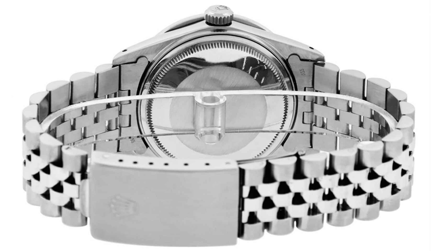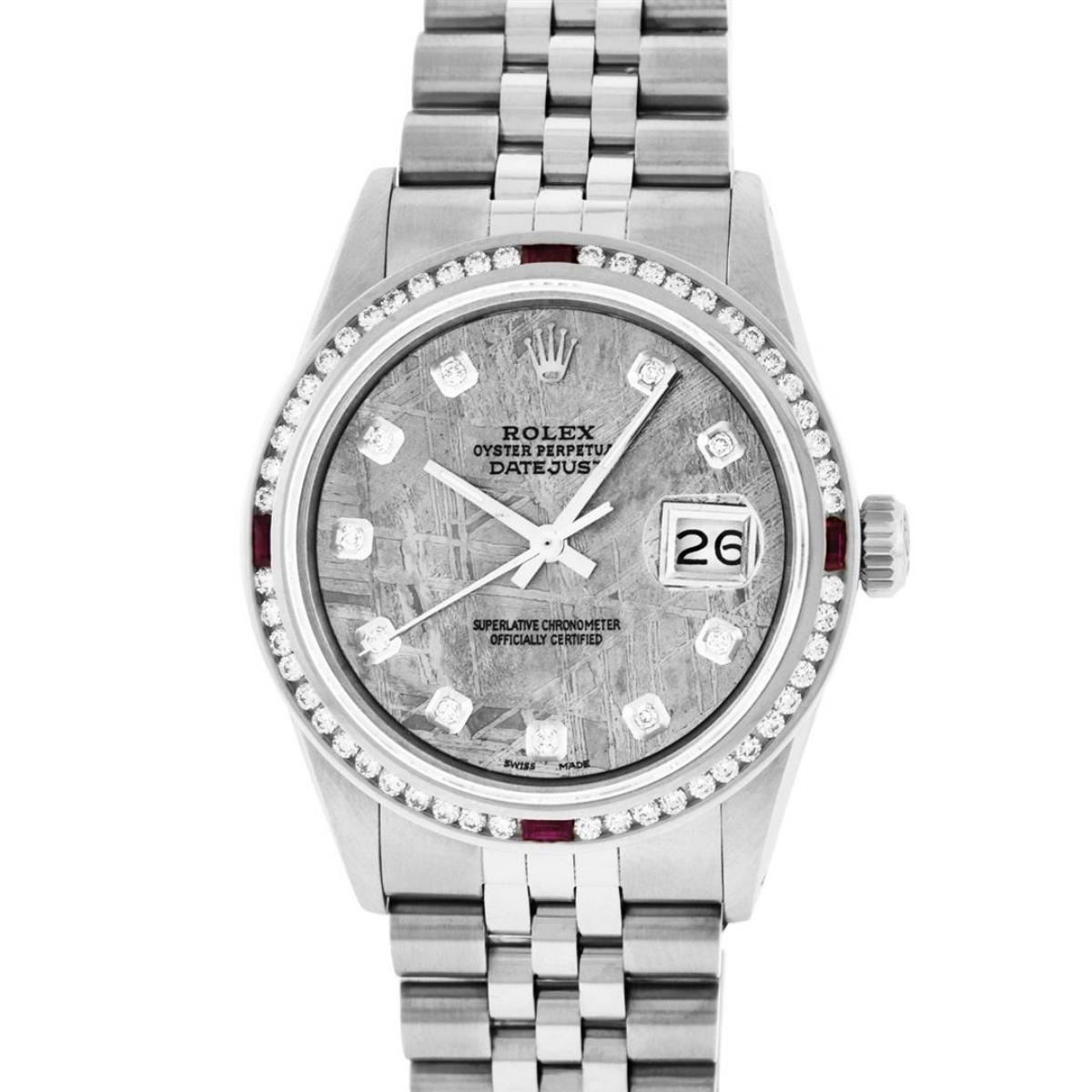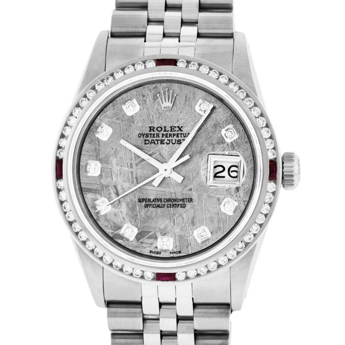 One Mens Stainless Steel Rolex Datejust Polished Bright with Satin Finish, This Watch Has Been Serviced & Electronically Time Tested, Stainless Steel Case: 36mm, Stainless Steel Crown, Custom Bezel: New 18K White Gold Ruby Channel Set Diamond Bezel, Diamond + Gem Count: 52 Diamonds + 4 Rubies, Total Weight 1.30 Carat, Clarity: SI-VS, Color: G to H. Custom Crystal: New Scratch Resistant Synthetic Sapphire Cyclops Lens. Custom Hands: New Luminescent Hands. Movement: Automatic Winding Movement. Custom Dial: Meteorite Diamond Dial, Diamond Count: 10 Diamonds in Dial, Diamond Color: G To H In Color, Clarity: SI-VS. Date Window: 3 O'Clock Position Date Display, Quickset, Model: Datejust, Condition: G-6 Extra Fine. Bracelet: Stainless Steel Jubilee. Bracelet: 7.0 Inch Length, Adjustable. Standard Clasp, With Rolex Logo. This Watch Has Been Serviced Time Tested And Is In Excellent Condition It Is Free Of All Scratches And Dents.