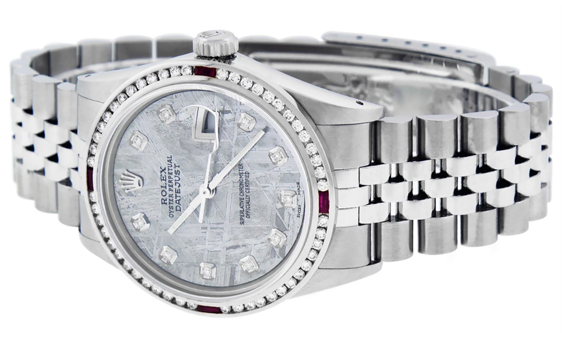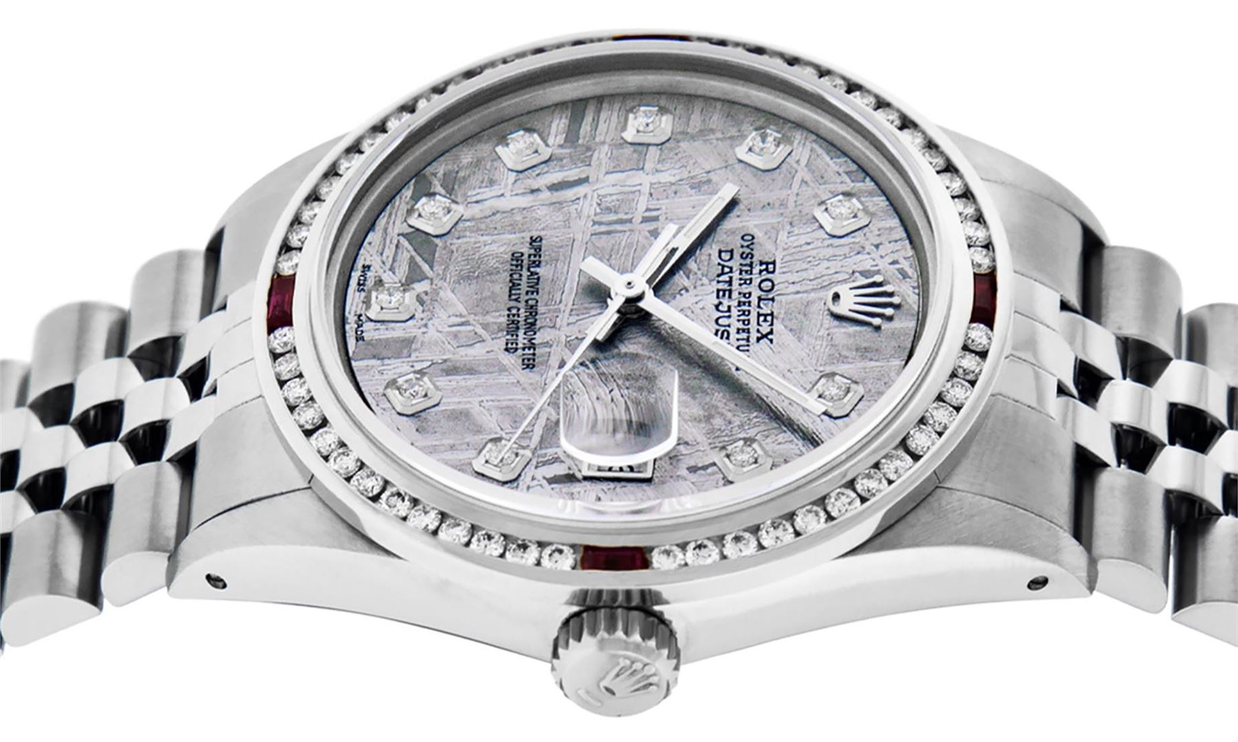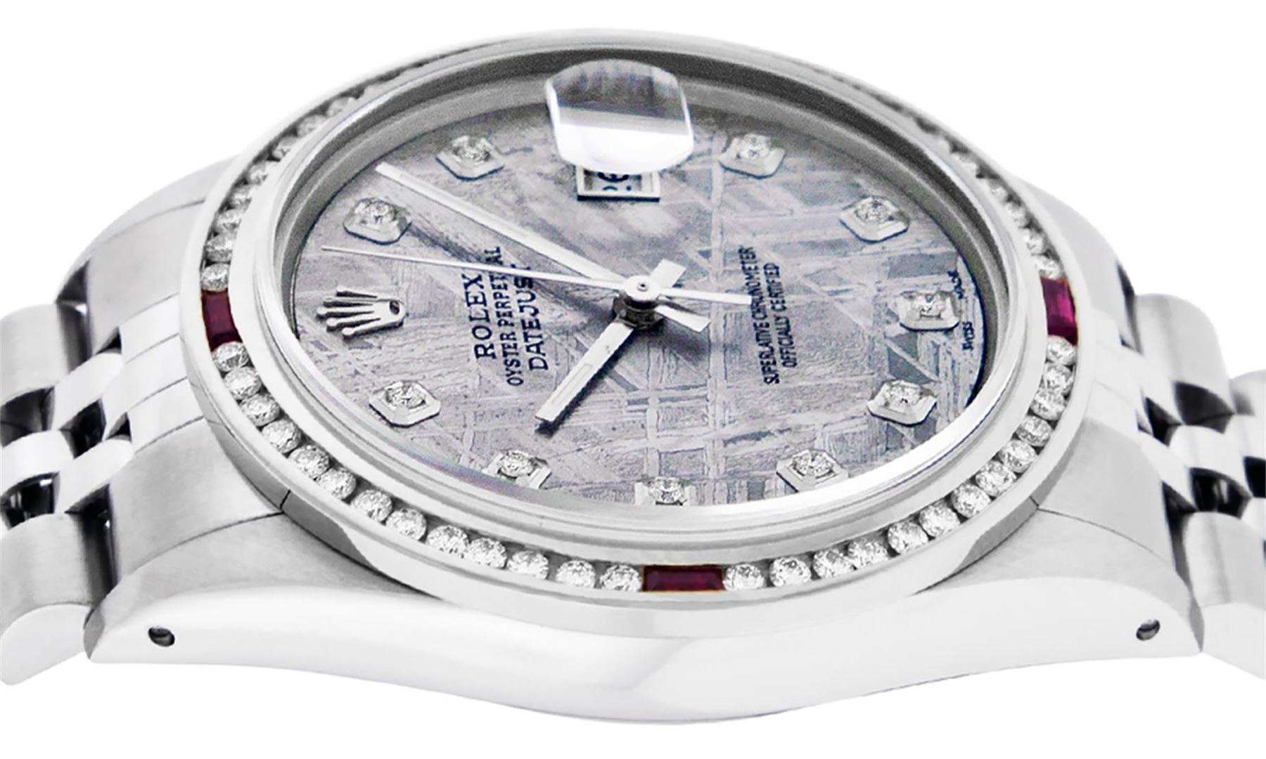 One Mens Stainless Steel Rolex Datejust Polished Bright with Satin Finish, This Watch Has Been Serviced & Electronically Tested, Stainless Steel Case: 36mm, Stainless Steel Crown, Custom Bezel: New 18K White Gold Ruby Channel Set Diamond Bezel, Diamond + Gem Count: 52 Diamonds + 4 Rubies, Total Weight 1.30 Carat, Clarity: SI-VS, Color: G to H. Custom Crystal: New Synthetic Sapphire Cyclops Lens. Custom Hands: New Luminescent Hands. Movement: Automatic Winding Movement Caliber 3035. Custom Dial: Meteorite Diamond Dial, Diamond Count: 10 Diamonds in Dial, Diamond Color: G To H In Color, Clarity: SI-VS. Date Window: 3 O'Clock Position Date Display, Quickset, Model: Datejust, Condition: G-6 Extra Fine. Bracelet: Stainless Steel Jubilee. Bracelet: 7.0 Inch Length, Adjustable. Standard Clasp, With Rolex Logo. This Watch Has Been Serviced Time Tested And Is In Excellent Condition It Is Free Of All Scratches And Dents.