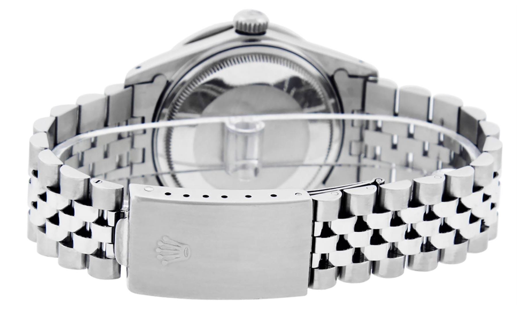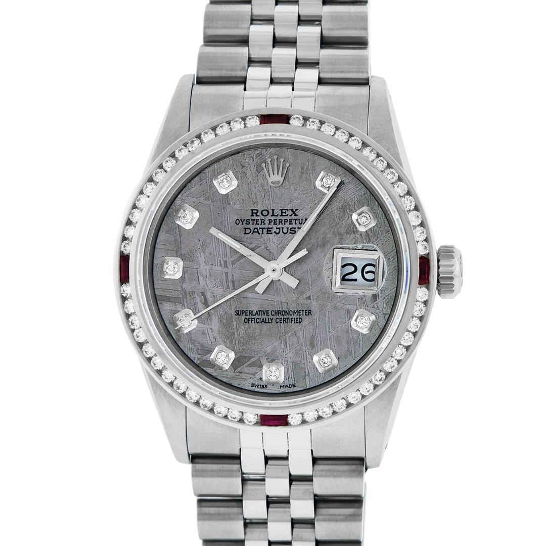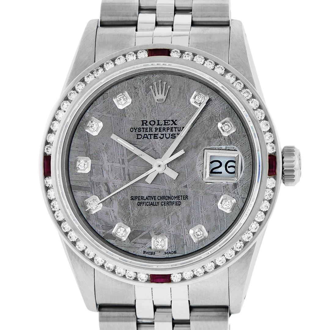 One Mens Stainless Steel Rolex Datejust Polished Bright with Satin Finish, This Watch Has Been Serviced & Electronically Tested, Stainless Steel Case: 36mm, Stainless Steel Crown, Custom Bezel: New 18K White Gold Ruby Channel Set Diamond Bezel, Diamond + Gem Count: 52 Diamonds + 4 Rubies, Total Weight 1.30 Carat, Clarity: SI-VS, Color: G to H. Custom Crystal: New Synthetic Sapphire Cyclops Lens. Custom Hands: New Luminescent Hands. Movement: Automatic Winding Movement Caliber 3035. Custom Dial: Meteorite Diamond Dial, Diamond Count: 10 Diamonds in Dial, Diamond Color: G To H In Color, Clarity: SI-VS. Date Window: 3 O'Clock Position Date Display, Quickset, Model: Datejust, Condition: G-6 Extra Fine. Bracelet: Stainless Steel Jubilee. Bracelet: 7.0 Inch Length, Adjustable. Standard Clasp, With Rolex Logo. This Watch Has Been Serviced Time Tested And Is In Excellent Condition It Is Free Of All Scratches And Dents.