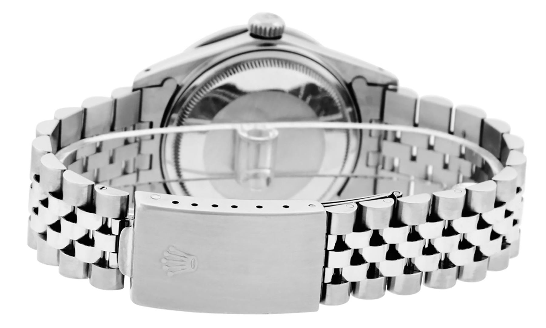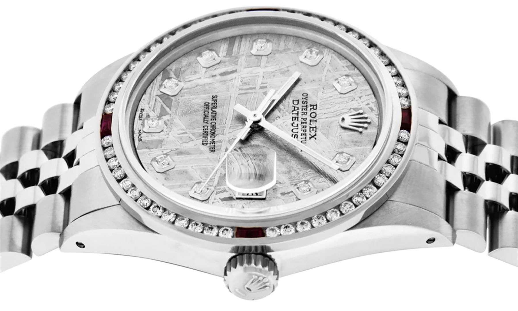 One Mens Stainless Steel Rolex Datejust Polished Bright with Satin Finish, This Watch Has Been Serviced & Electronically Time Tested, Stainless Steel Case: 36mm, Stainless Steel Crown, Custom Bezel: New 18K White Gold Ruby Channel Set Diamond Bezel, Diamond + Gem Count: 52 Diamonds + 4 Rubies, Total Weight 1.30 Carat, Clarity: SI-VS, Color: G to H. Custom Crystal: New Scratch Resistant Synthetic Sapphire Cyclops Lens. Custom Hands: New Luminescent Hands. Movement: Automatic Winding Movement Caliber 3035. Custom Dial: Meteorite Diamond Dial, Diamond Count: 10 Diamonds in Dial, Diamond Color: G To H In Color, Clarity: SI-VS. Date Window: 3 O'Clock Position Date Display, Quickset, Model: Datejust, Condition: G-6 Extra Fine. Bracelet: Stainless Steel Jubilee. Bracelet: 7.0 Inch Length, Adjustable. Standard Clasp, With Rolex Logo. This Watch Has Been Serviced Time Tested And Is In Excellent Condition It Is Free Of All Scratches And Dents.