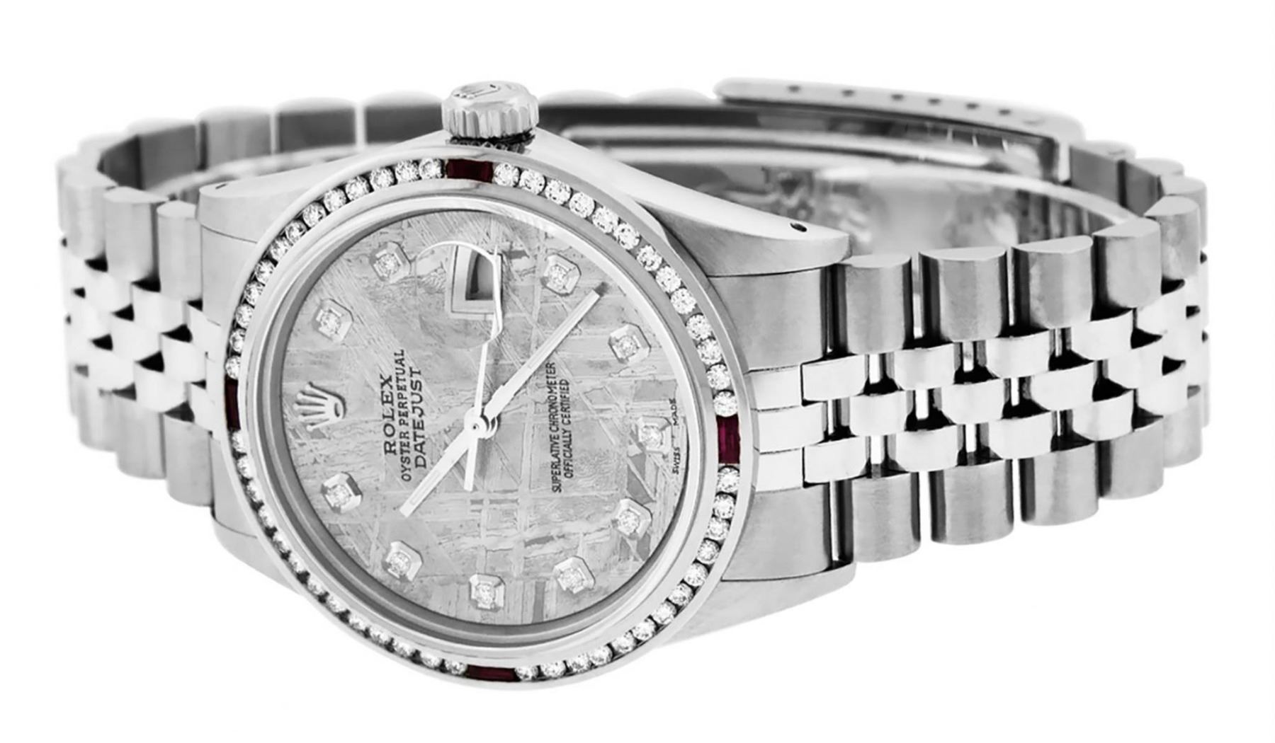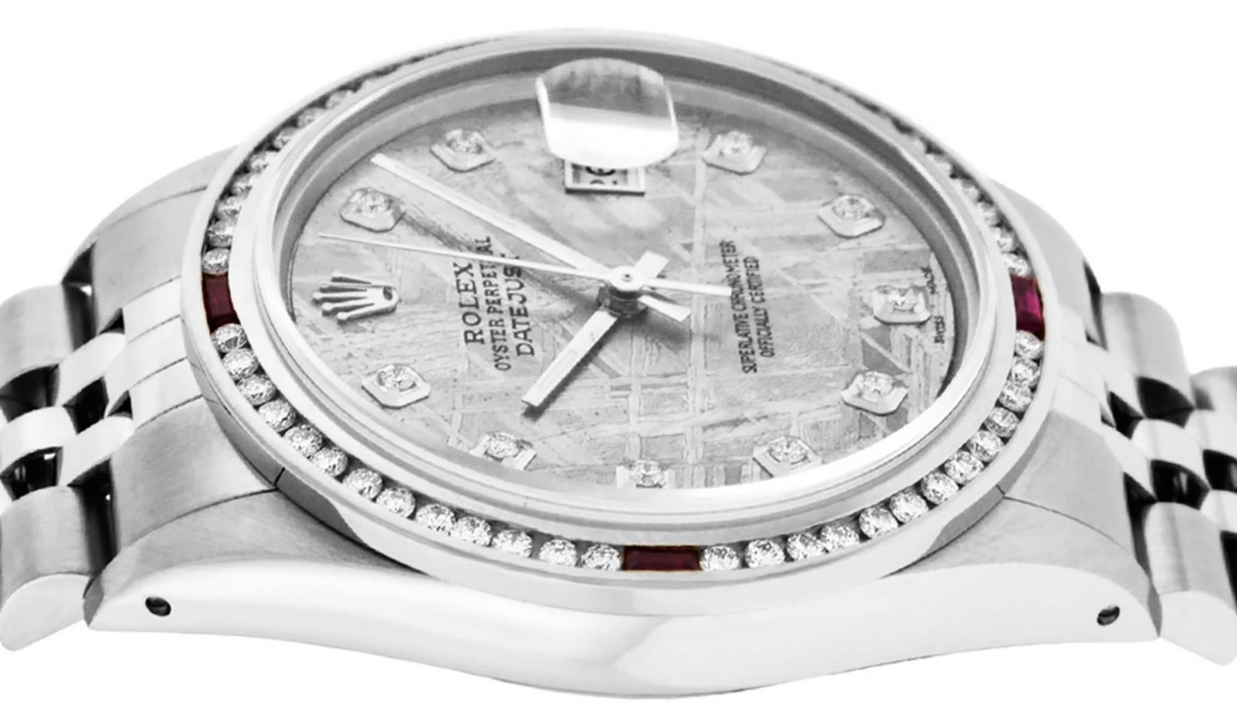 One Mens Stainless Steel Rolex Datejust Polished Bright with Satin Finish, This Watch Has Been Serviced & Electronically Time Tested, Stainless Steel Case: 36mm, Stainless Steel Crown, Custom Bezel: New 18K White Gold Ruby Channel Set Diamond Bezel, Diamond + Gem Count: 52 Diamonds + 4 Rubies, Total Weight 1.30 Carat, Clarity: SI-VS, Color: G to H. Custom Crystal: New Scratch Resistant Synthetic Sapphire Cyclops Lens. Custom Hands: New Luminescent Hands. Movement: Automatic Winding Movement Caliber 3035. Custom Dial: Meteorite Diamond Dial, Diamond Count: 10 Diamonds in Dial, Diamond Color: G To H In Color, Clarity: SI-VS. Date Window: 3 O'Clock Position Date Display, Quickset, Model: Datejust, Condition: G-6 Extra Fine. Bracelet: Stainless Steel Jubilee. Bracelet: 7.0 Inch Length, Adjustable. Standard Clasp, With Rolex Logo. This Watch Has Been Serviced Time Tested And Is In Excellent Condition It Is Free Of All Scratches And Dents.