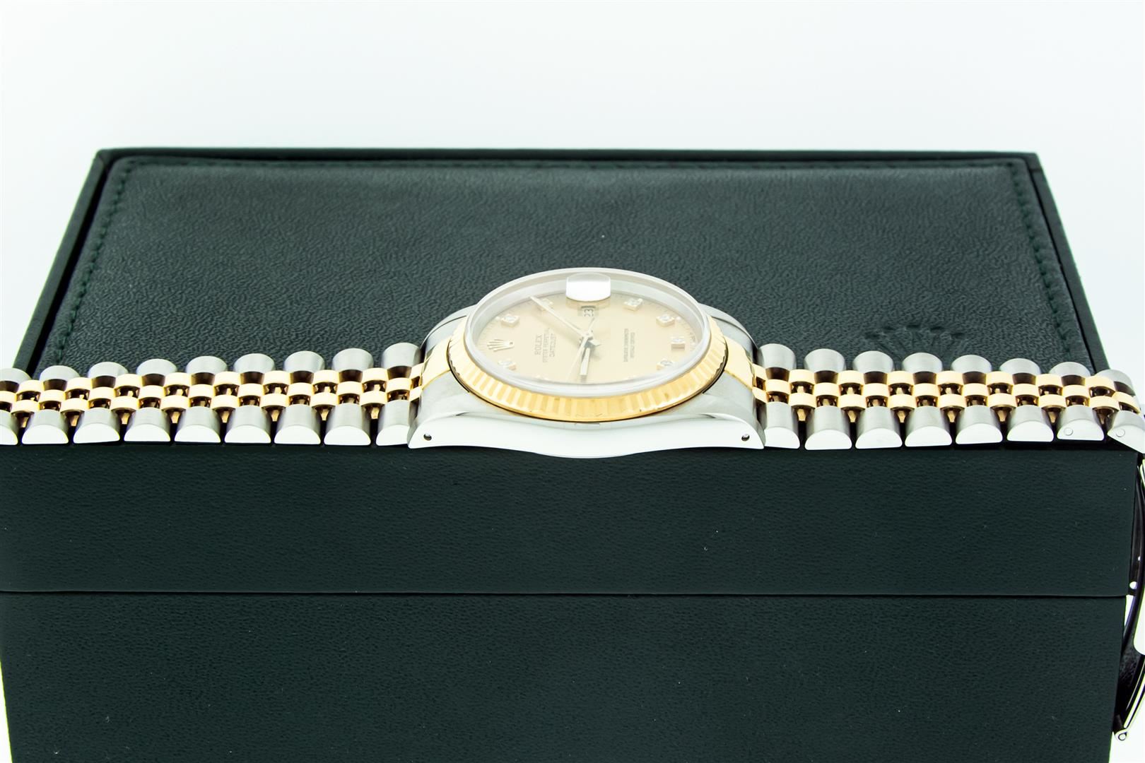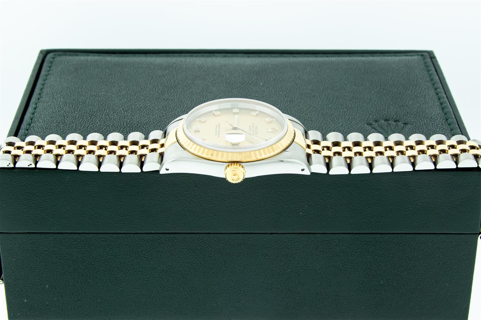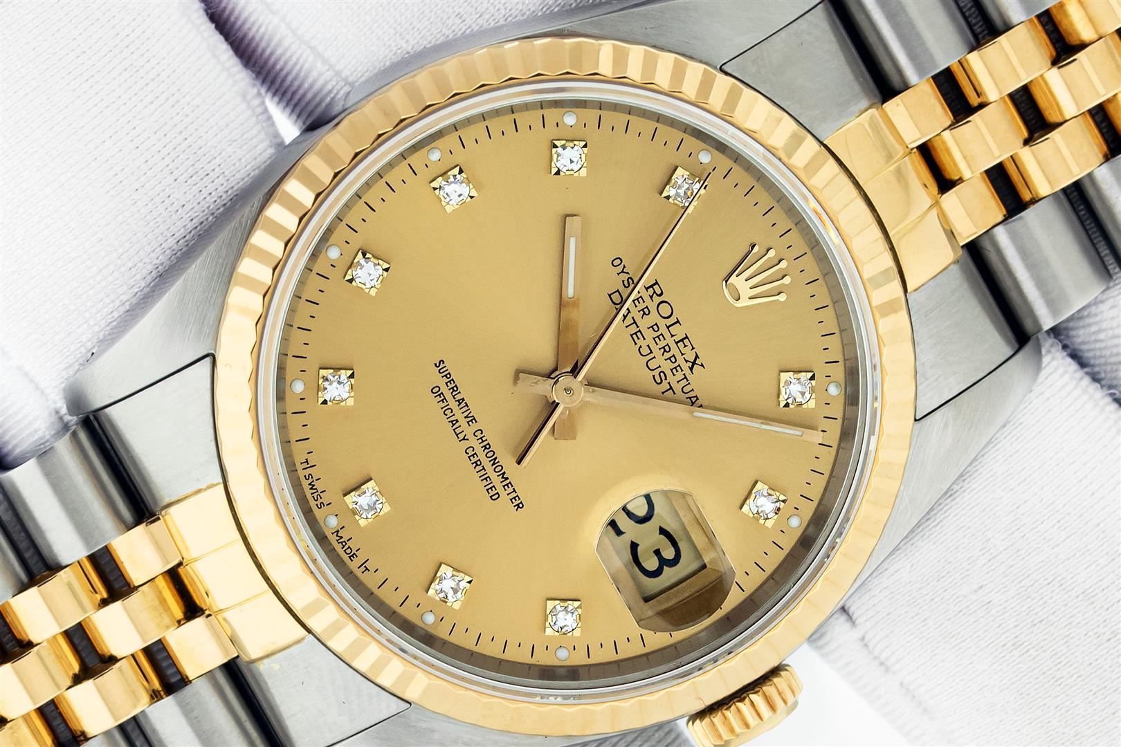 One Mens Pre Owned 18K Yellow Gold And Stainless Steel Rolex Datejust Polished, Serviced & Electronically Tested, Rolex Yellow Gold & Stainless Steel Case: 36mm, Rolex Yellow Gold Crown, Rolex Bezel: 18K Yellow Gold Fluted Bezel. Crystal: Sapphire With Magnified Date Window. Hands: Luminescent Hands. Rolex Movement: Automatic Winding Movement 3135. Rolex Dial: Champagne With VS Factory Diamond Hour Markers & Dash Track, Diamond Count: 10 Diamonds in Dial, VVS Clarity. Date Window: 3 O'Clock Position Date Display, Quickset, Model: Sapphire Datejust. Condition: G-6 Extra Fine. Rolex Bracelet: Two Tone 18K Yellow Gold & Stainless Steel Jubilee Band. Bright Polish. 7.0 Inch Length, Adjustable. Standard Clasp, With Rolex Logo. This Watch Has Been Serviced And Polished It Is Free Of All Scratches And Dents. This Watch Comes With A Rolex Box.