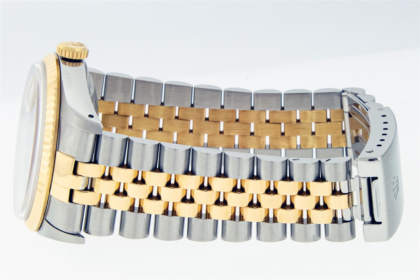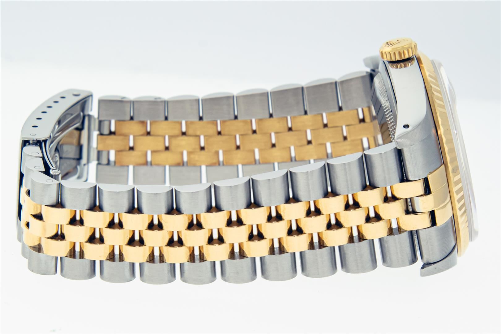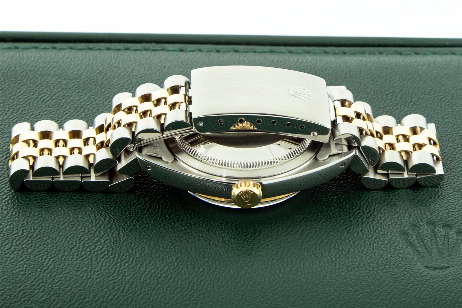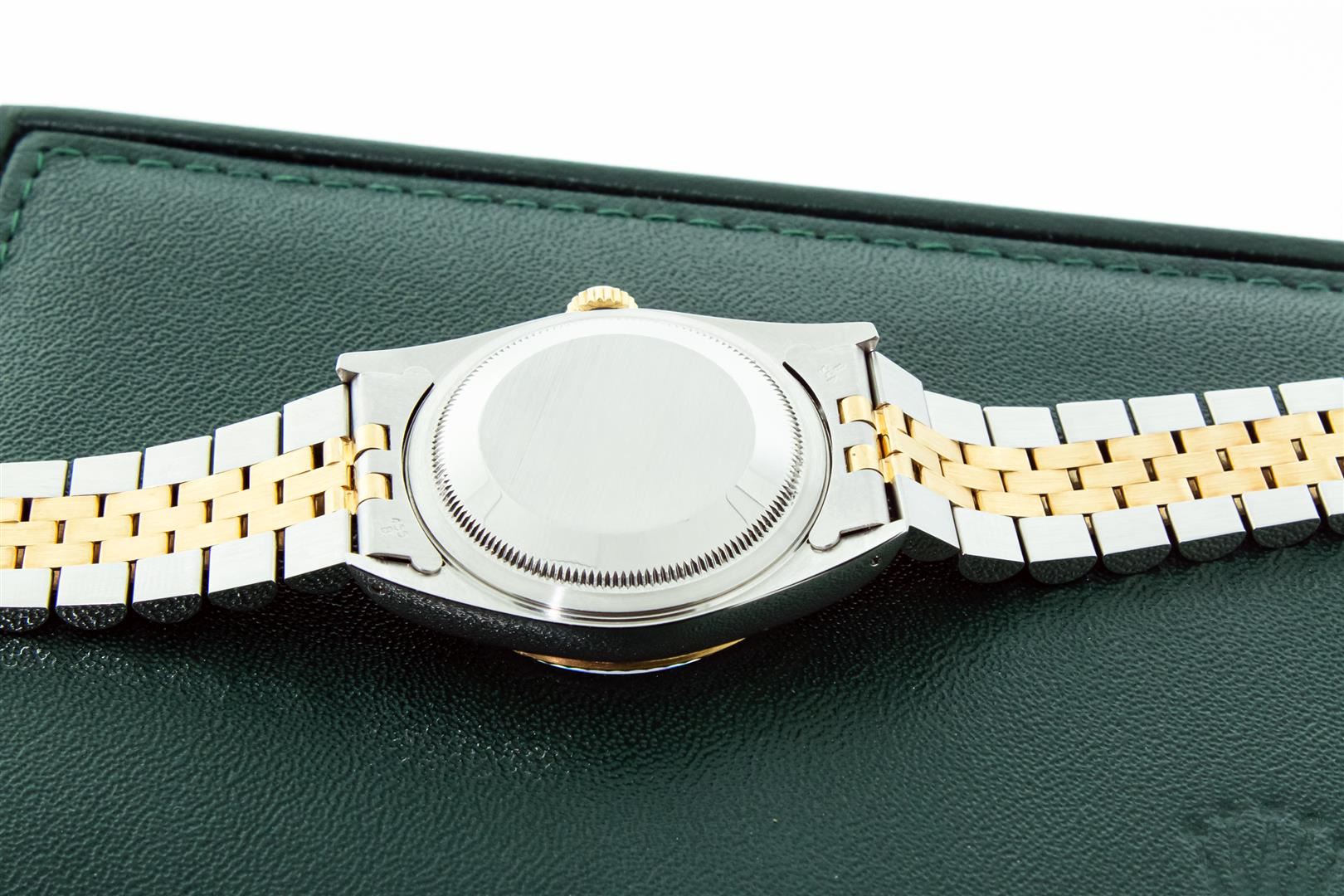 One Mens Pre Owned 18K Yellow Gold And Stainless Steel Rolex Datejust Polished, Serviced & Electronically Tested, Rolex Yellow Gold & Stainless Steel Case: 36mm, Rolex Yellow Gold Crown, Rolex Bezel: 18K Yellow Gold Fluted Bezel. Crystal: Sapphire With Magnified Date Window. Hands: Luminescent Hands. Rolex Movement: Automatic Winding Movement 3135. Rolex Dial: Champagne With VS Factory Diamond Hour Markers & Dash Track, Diamond Count: 10 Diamonds in Dial, VVS Clarity. Date Window: 3 O'Clock Position Date Display, Quickset, Model: Sapphire Datejust. Condition: G-6 Extra Fine. Rolex Bracelet: Two Tone 18K Yellow Gold & Stainless Steel Jubilee Band. Bright Polish. 7.0 Inch Length, Adjustable. Standard Clasp, With Rolex Logo. This Watch Has Been Serviced And Polished It Is Free Of All Scratches And Dents. This Watch Comes With A Rolex Box.