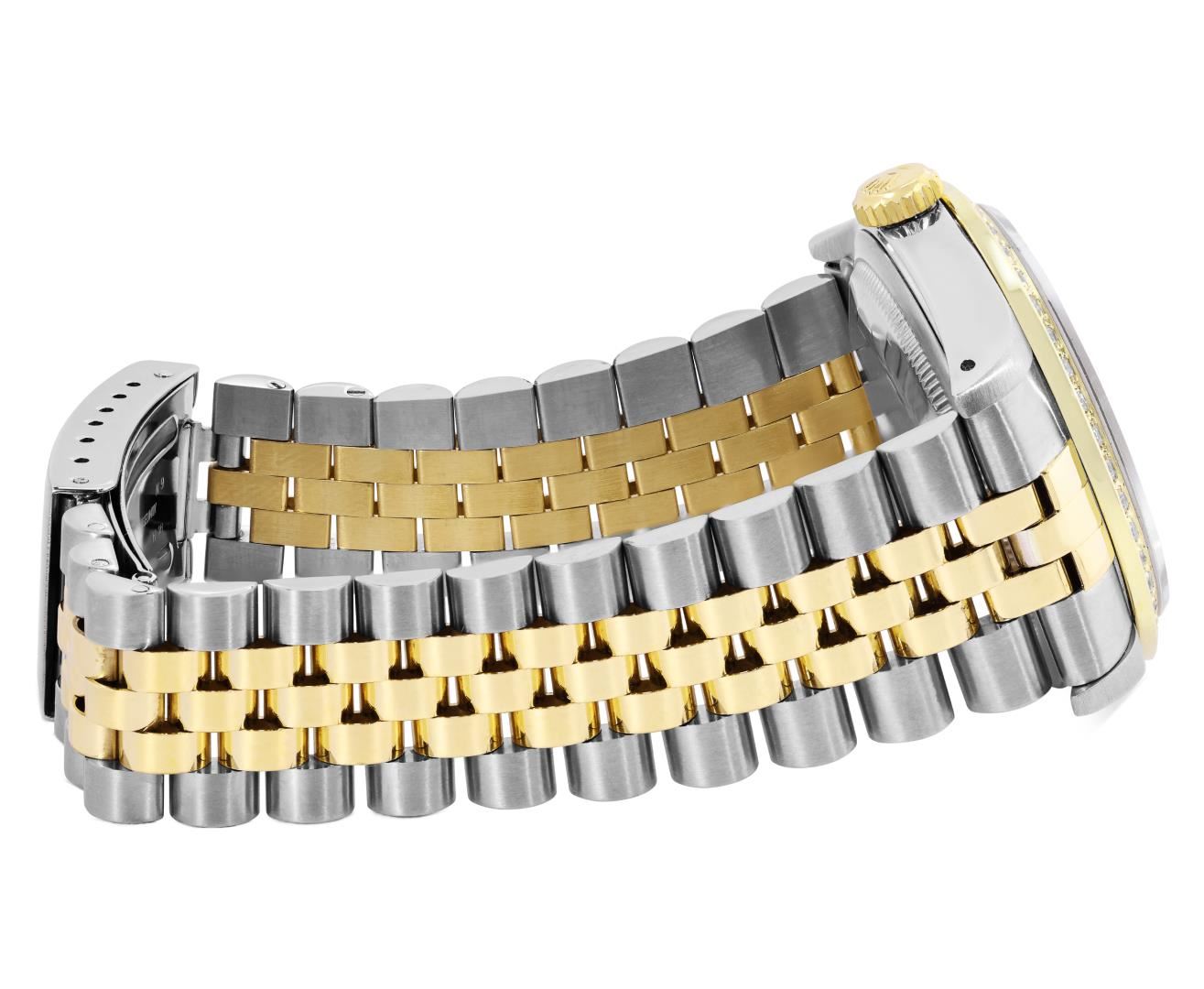 One Mens Pre Owned Two Tone 18K Yellow Gold And Stainless Steel Rolex Datejust Polished, Serviced And Electronically Tested, Rolex Yellow Gold And Stainless Steel Case: 36mm, Rolex Yellow Gold Crown, Custom Bezel: New 18K Yellow Gold Beadset Diamond Bezel, Diamond Count: 44 Diamonds. Custom Crystal: New Sapphire With Magnified Date Window. Custom Hands: New Luminecent Hands. Rolex Movement: Automatic Winding Movement 3135. Rolex Dial: Champagne Dial With Index Hour Markers and Dash Track With Lumi Dots. Date Window: 3 O'Clock Position Date Display, Quickset, Model: Quickset Datejust. Condition: G-6 Extra Fine. Rolex Bracelet: Two Tone 18K Yellow Gold And Stainless Steel Jubilee Band. Bright Polish. 7.0 Inch Length, Adjustable. Standard Clasp, With Rolex Logo. This Watch Has Been Serviced Time Tested And Is In Excellent Condition It Is Free Of All Scratches And Dents. This Watch Comes With A Rolex Box.