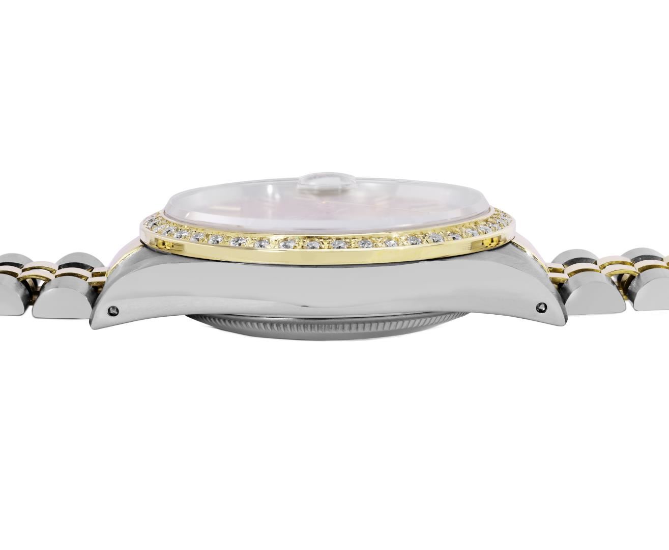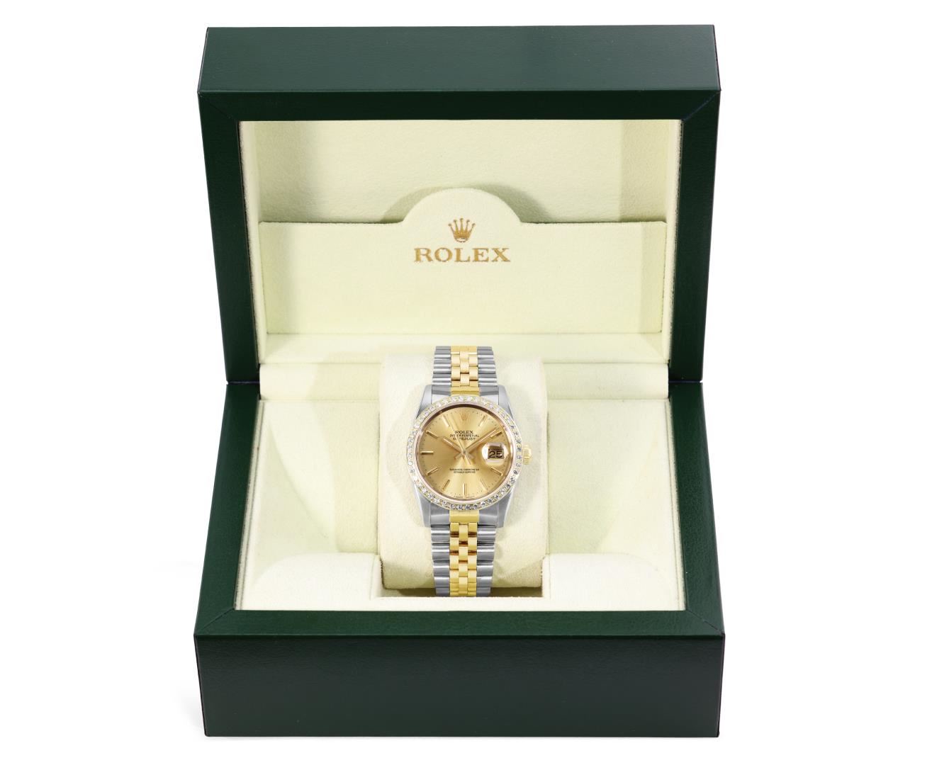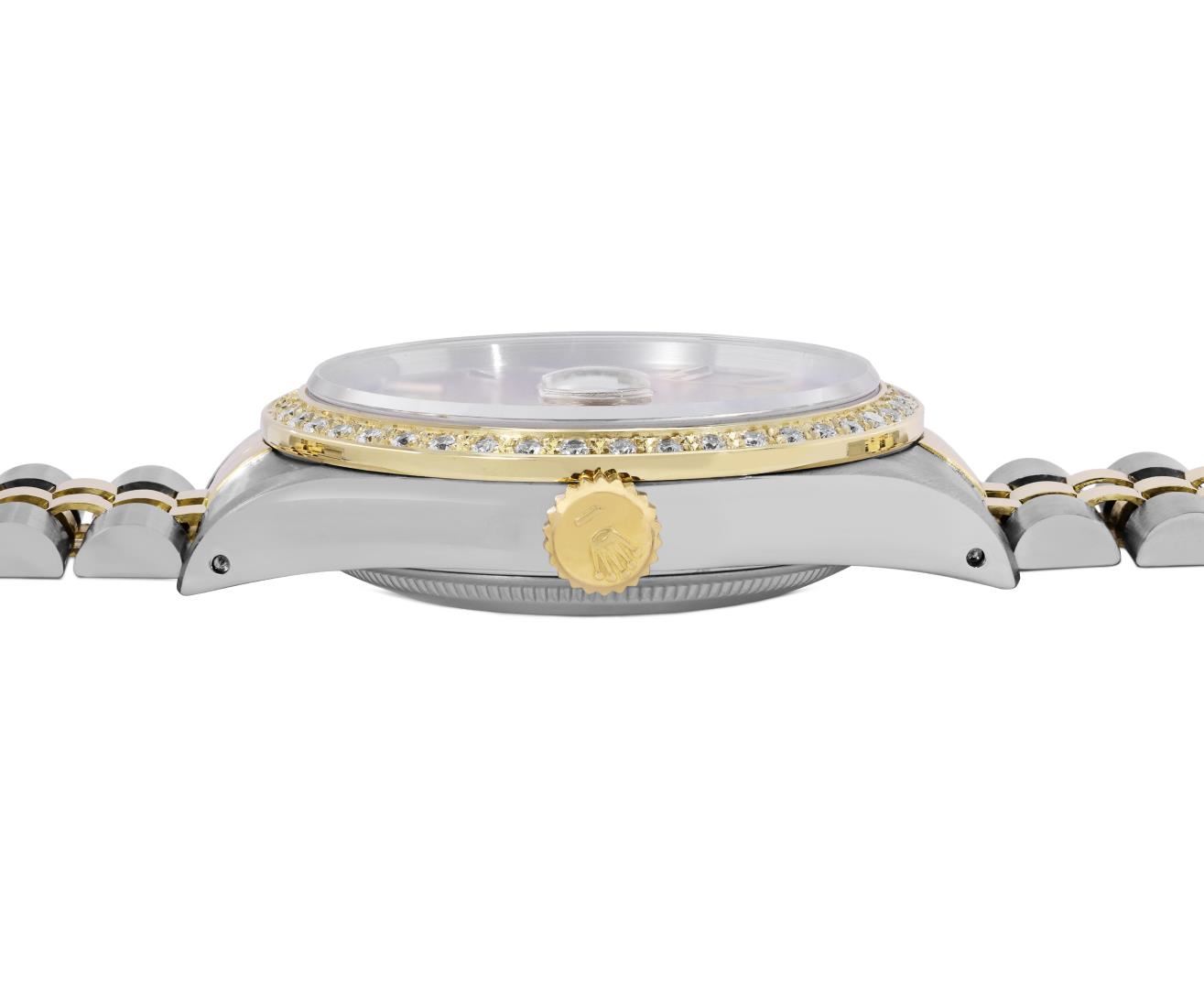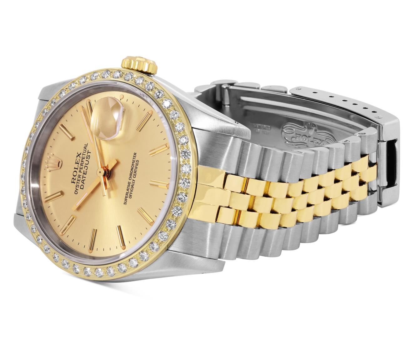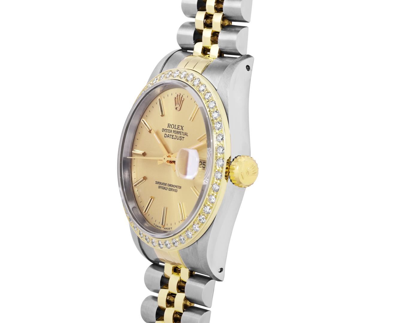 One Mens Pre Owned Two Tone 18K Yellow Gold And Stainless Steel Rolex Datejust Polished, Serviced And Electronically Tested, Rolex Yellow Gold And Stainless Steel Case: 36mm, Rolex Yellow Gold Crown, Custom Bezel: New 18K Yellow Gold Beadset Diamond Bezel, Diamond Count: 44 Diamonds. Custom Crystal: New Sapphire With Magnified Date Window. Custom Hands: New Luminecent Hands. Rolex Movement: Automatic Winding Movement 3135. Rolex Dial: Champagne Dial With Index Hour Markers and Dash Track With Lumi Dots. Date Window: 3 O'Clock Position Date Display, Quickset, Model: Quickset Datejust. Condition: G-6 Extra Fine. Rolex Bracelet: Two Tone 18K Yellow Gold And Stainless Steel Jubilee Band. Bright Polish. 7.0 Inch Length, Adjustable. Standard Clasp, With Rolex Logo. This Watch Has Been Serviced Time Tested And Is In Excellent Condition It Is Free Of All Scratches And Dents. This Watch Comes With A Rolex Box.