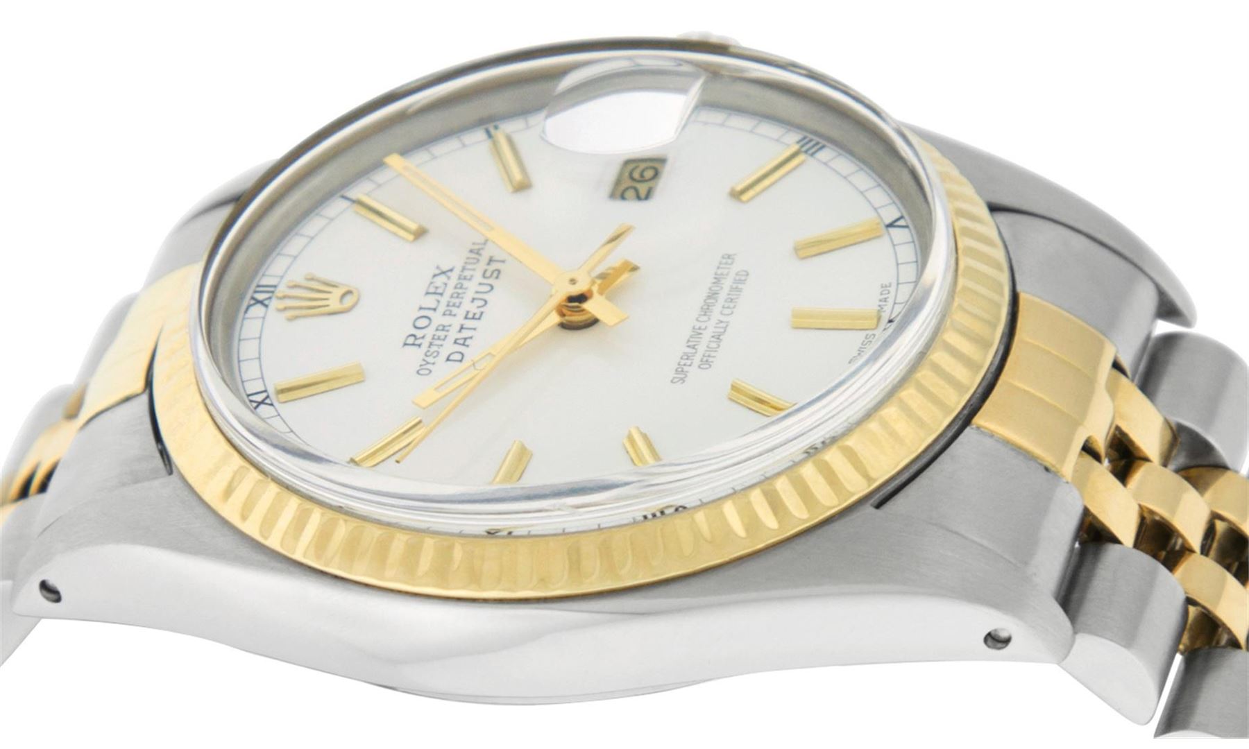 One Mens Rolex Two Tone Yellow Gold And Stainless Steel Datejust Polished, Serviced & Electronically Tested, 14K Yellow Gold & Stainless Steel Case: 36mm, 14K Yellow Gold Crown, Rolex Bezel: 14K Yellow Gold Fluted Bezel. Custom Crystal: New Acrylic With Magnified Date Window. Custom Hands: New Luminescent Hands. Rolex Movement: Automatic Winding Movement 3035. Custom Dial: Refinished To Silver With Index Hour Markers And Square Track. Date Window: 3 O'Clock Position Date Display, Quickset, Model: Datejust. Condition: G-6 Extra Fine. Rolex Bracelet: 14K Two Tone Yellow Gold & Stainless Steel Jubilee Band. Bright Polish. 7.0 Inch Length, Adjustable. Standard Clasp, With Rolex Logo. This Watch Has Been Serviced Time Tested And Is In Excellent Condition It Is Free Of All Scratches And Dents.