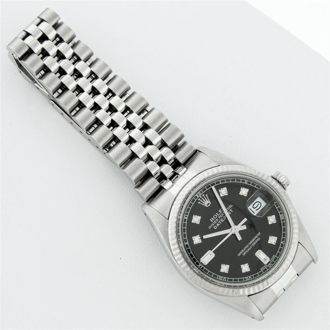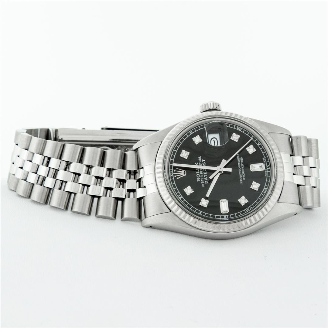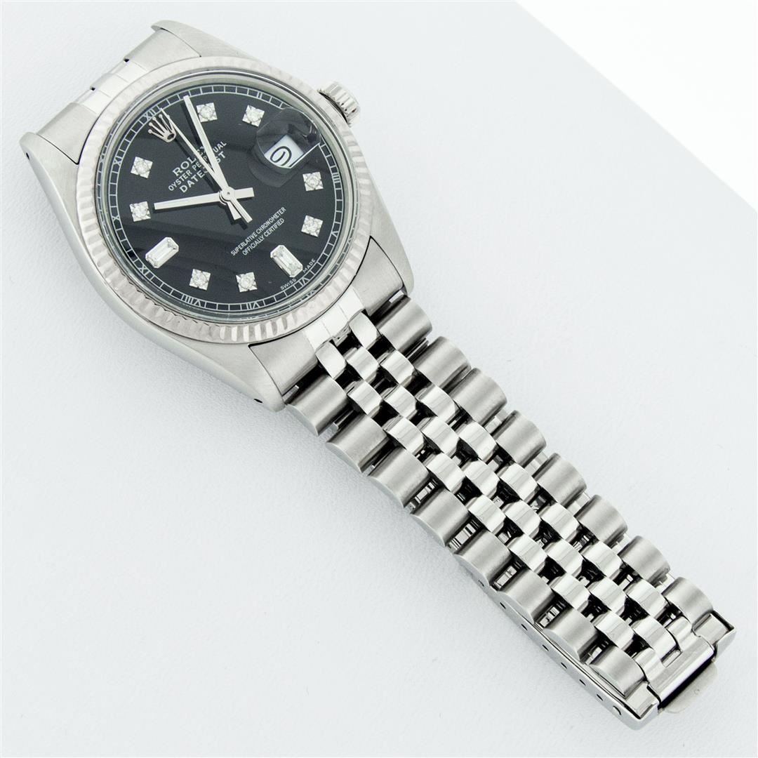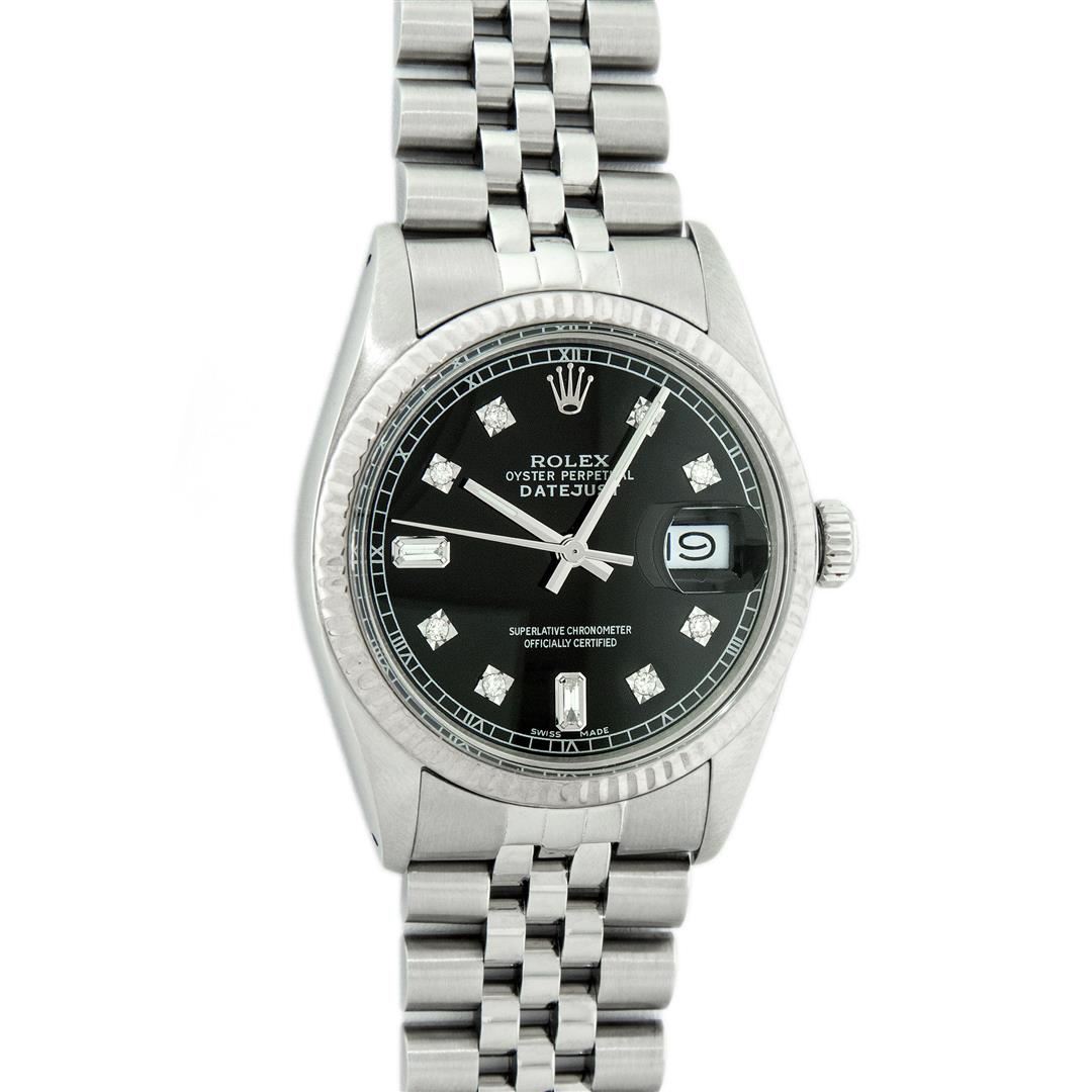 One Mens Stainless Steel Rolex Datejust Polished Bright with Satin Finish, This Watch Has Been Serviced & Electronically Tested, Stainless Steel Case: 36mm, Stainless Steel Crown, Bezel: 14K White Gold Fluted Bezel. Custom Crystal: New Acrylic Cyclops Lens. Custom Hands: New Luminescent Hands. Movement: Automatic Winding Movement Caliber 3035. Custom Dial: Black Diamond 8 + 2 Dial With Roman Track, Diamond Count: 8 Diamonds + 2 Baguettes in Dial G To H In Color, SI-VS Clarity. Date Window: 3 O'Clock Position Date Display, Quickset, Model: Datejust, Condition: G-6 Extra Fine. Bracelet: Stainless Steel Jubilee Band. Bright Polish & Satin Finish. 7.0 Inch Length, Adjustable. Standard Clasp, With Rolex Logo. This Watch Has Been Serviced Time Tested And Is In Excellent Condition It Is Free Of All Scratches And Dents.