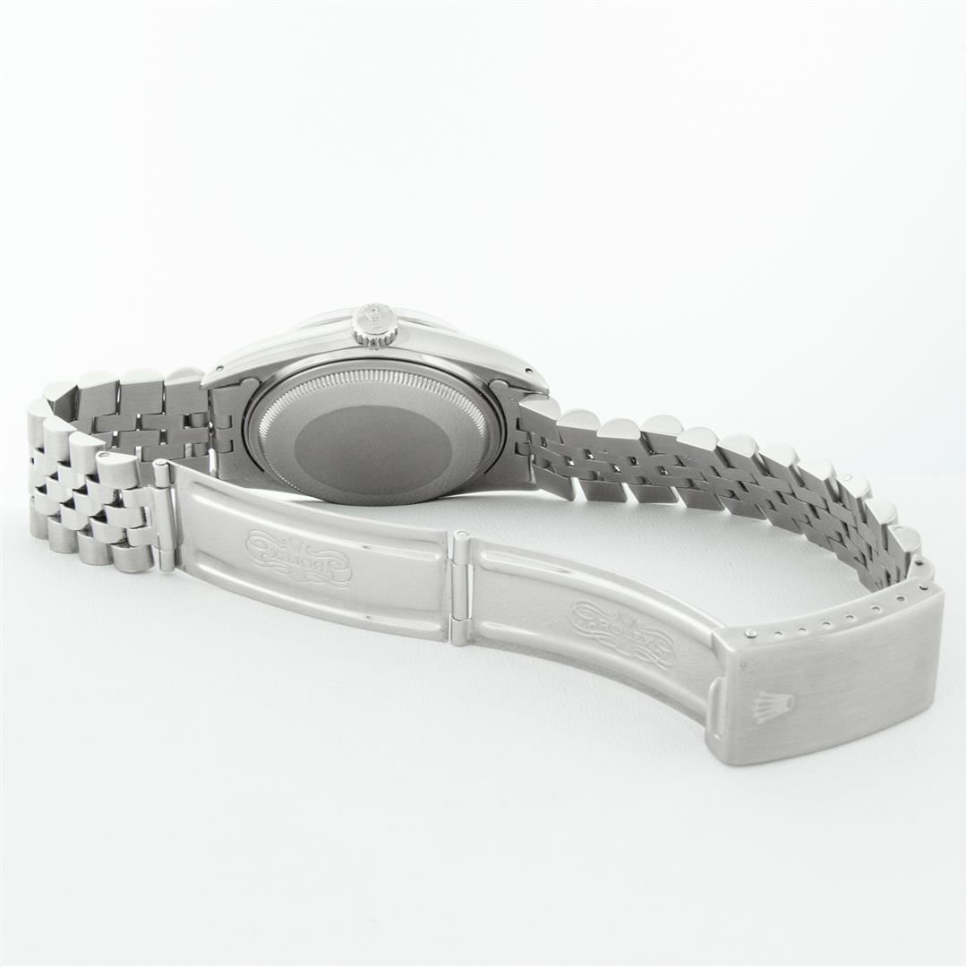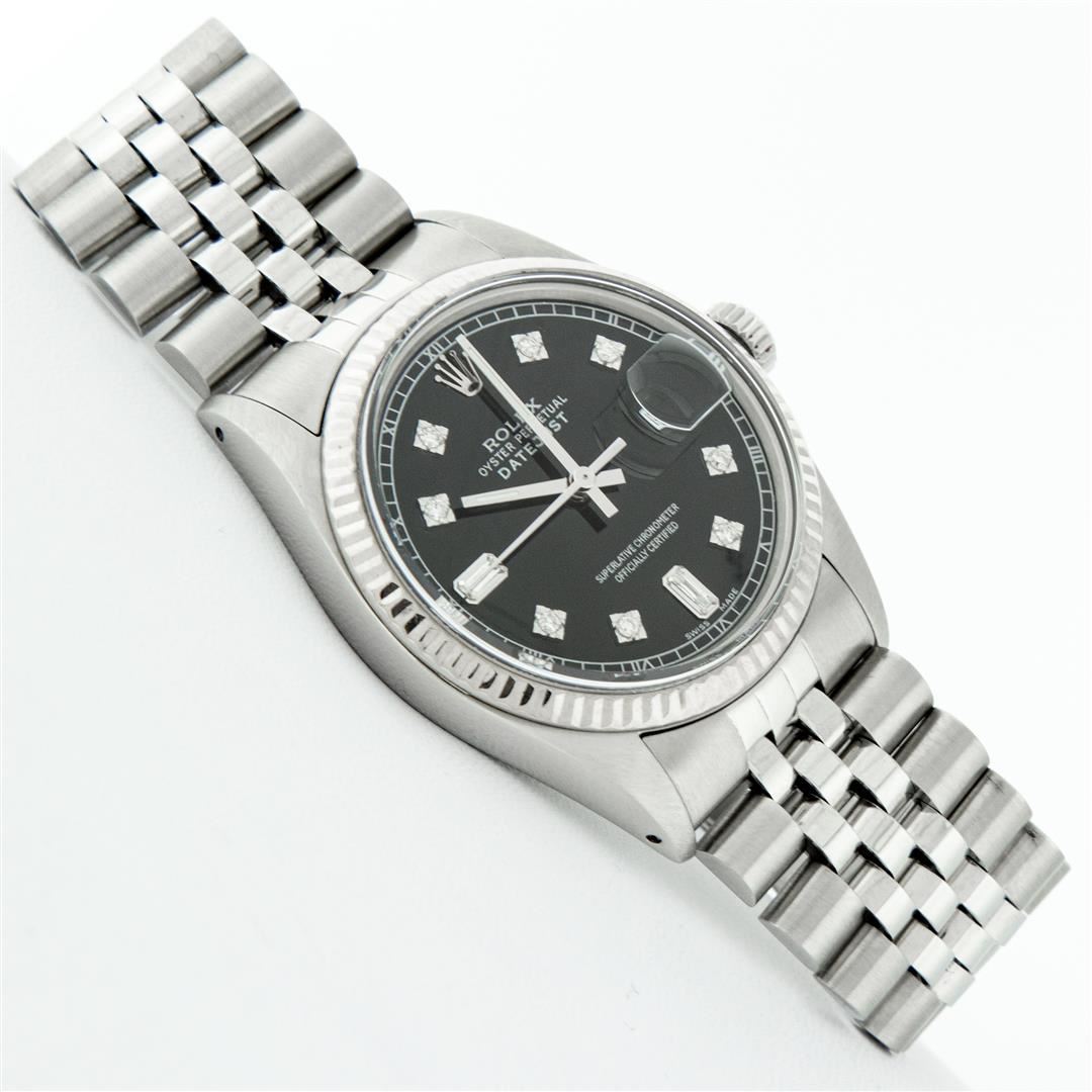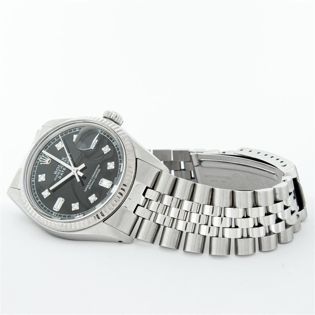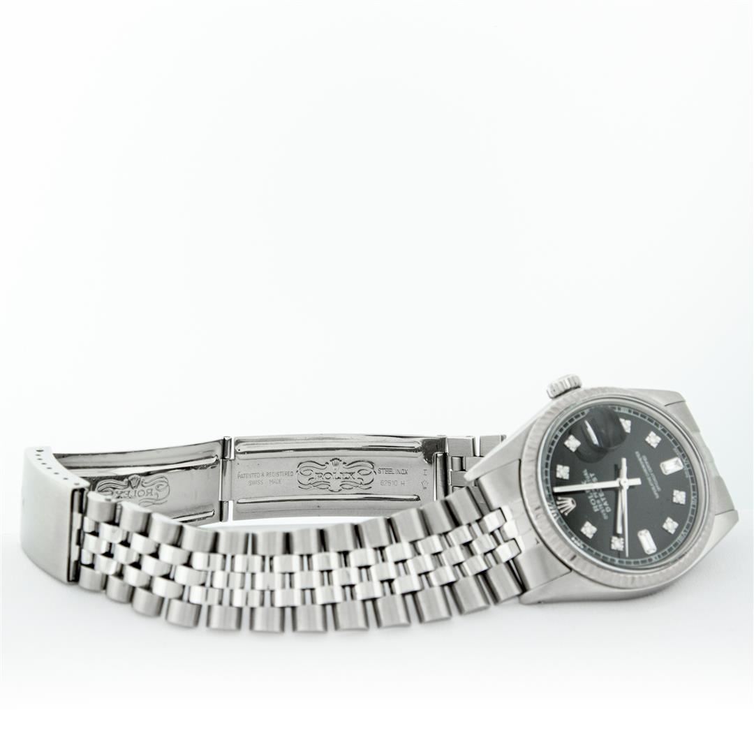 One Mens Stainless Steel Rolex Datejust Polished Bright with Satin Finish, This Watch Has Been Serviced & Electronically Tested, Stainless Steel Case: 36mm, Stainless Steel Crown, Bezel: 14K White Gold Fluted Bezel. Custom Crystal: New Acrylic Cyclops Lens. Custom Hands: New Luminescent Hands. Movement: Automatic Winding Movement Caliber 3035. Custom Dial: Black Diamond 8 + 2 Dial With Roman Track, Diamond Count: 8 Diamonds + 2 Baguettes in Dial G To H In Color, SI-VS Clarity. Date Window: 3 O'Clock Position Date Display, Quickset, Model: Datejust, Condition: G-6 Extra Fine. Bracelet: Stainless Steel Jubilee Band. Bright Polish & Satin Finish. 7.0 Inch Length, Adjustable. Standard Clasp, With Rolex Logo. This Watch Has Been Serviced Time Tested And Is In Excellent Condition It Is Free Of All Scratches And Dents.