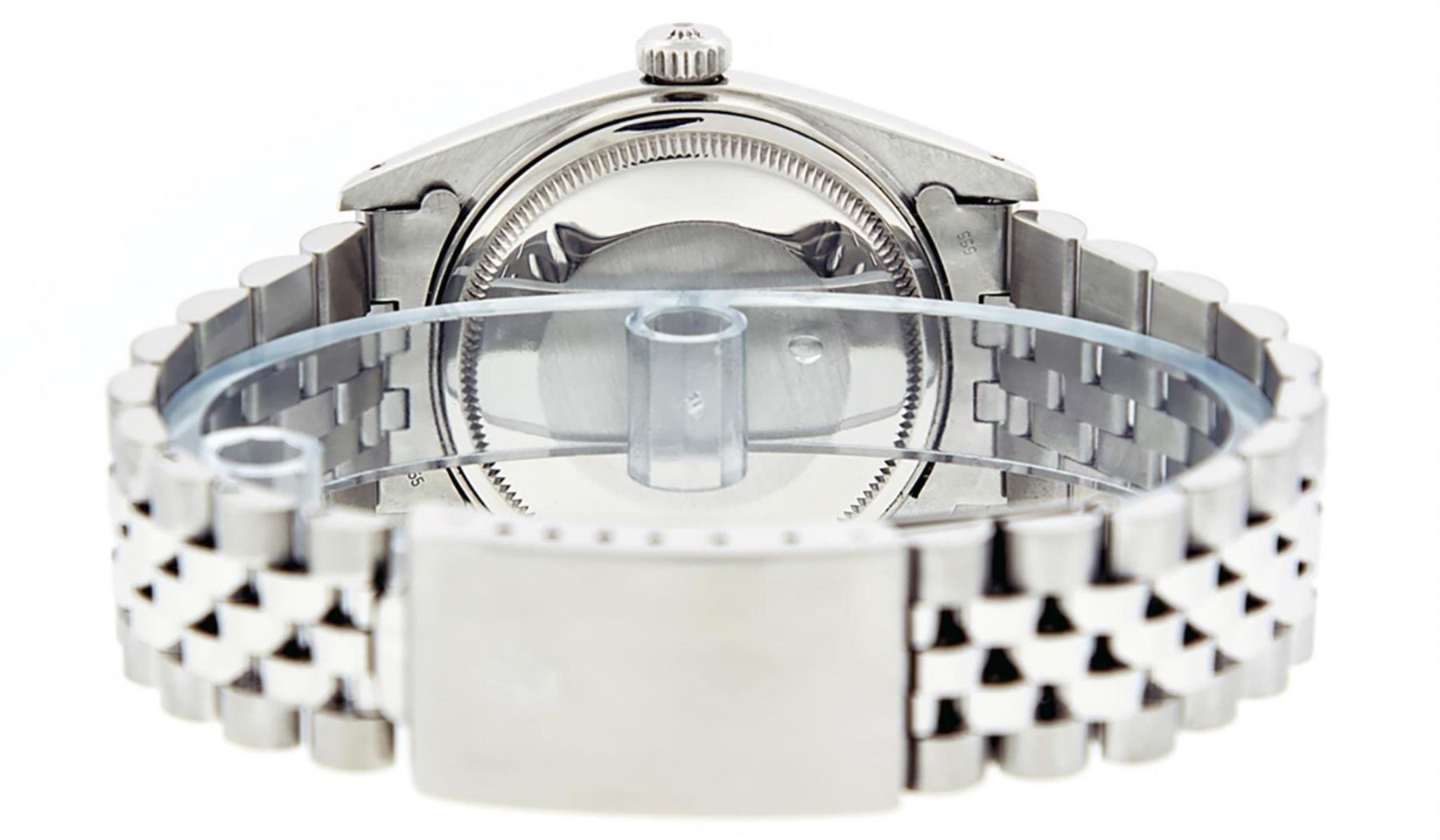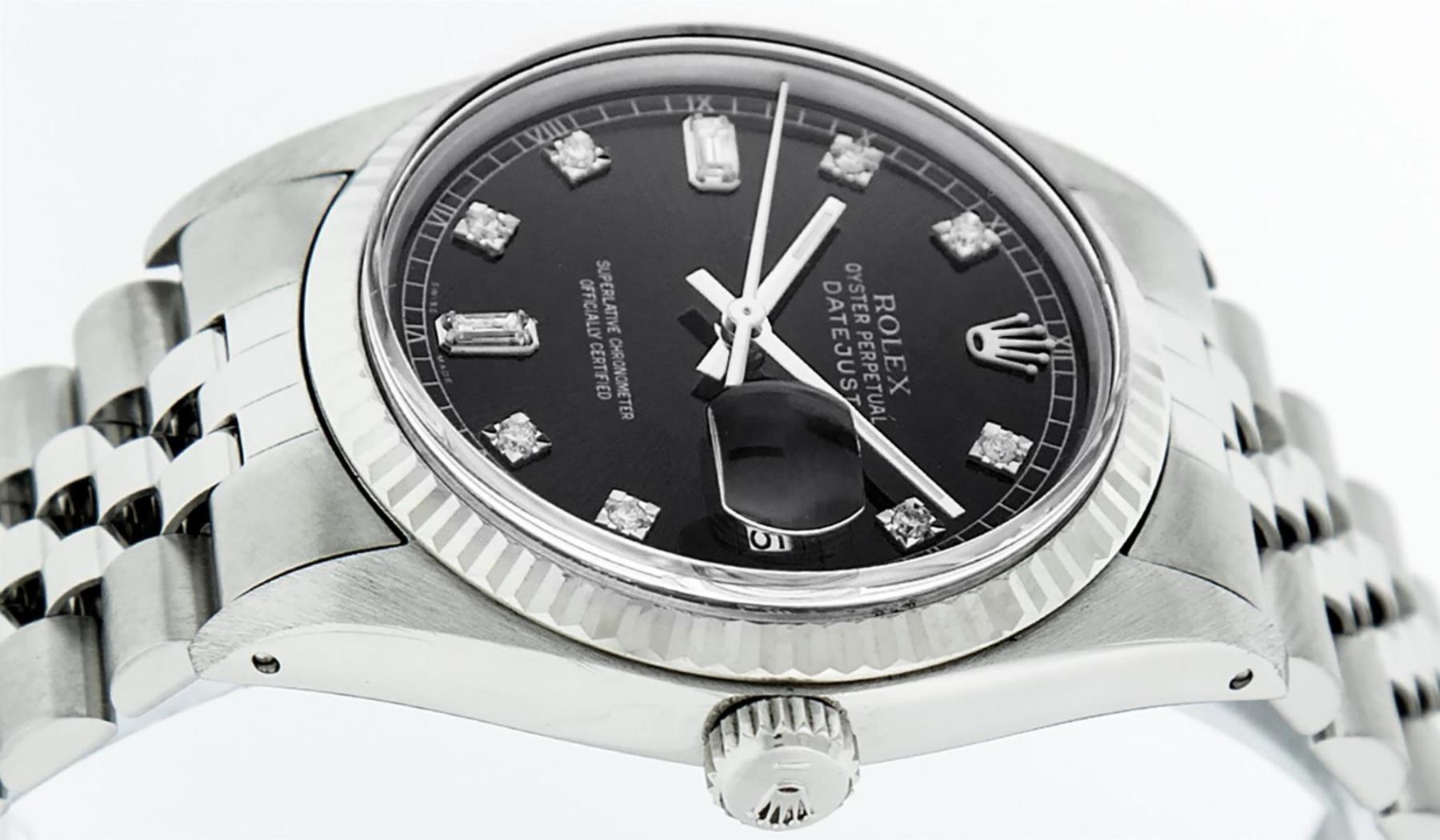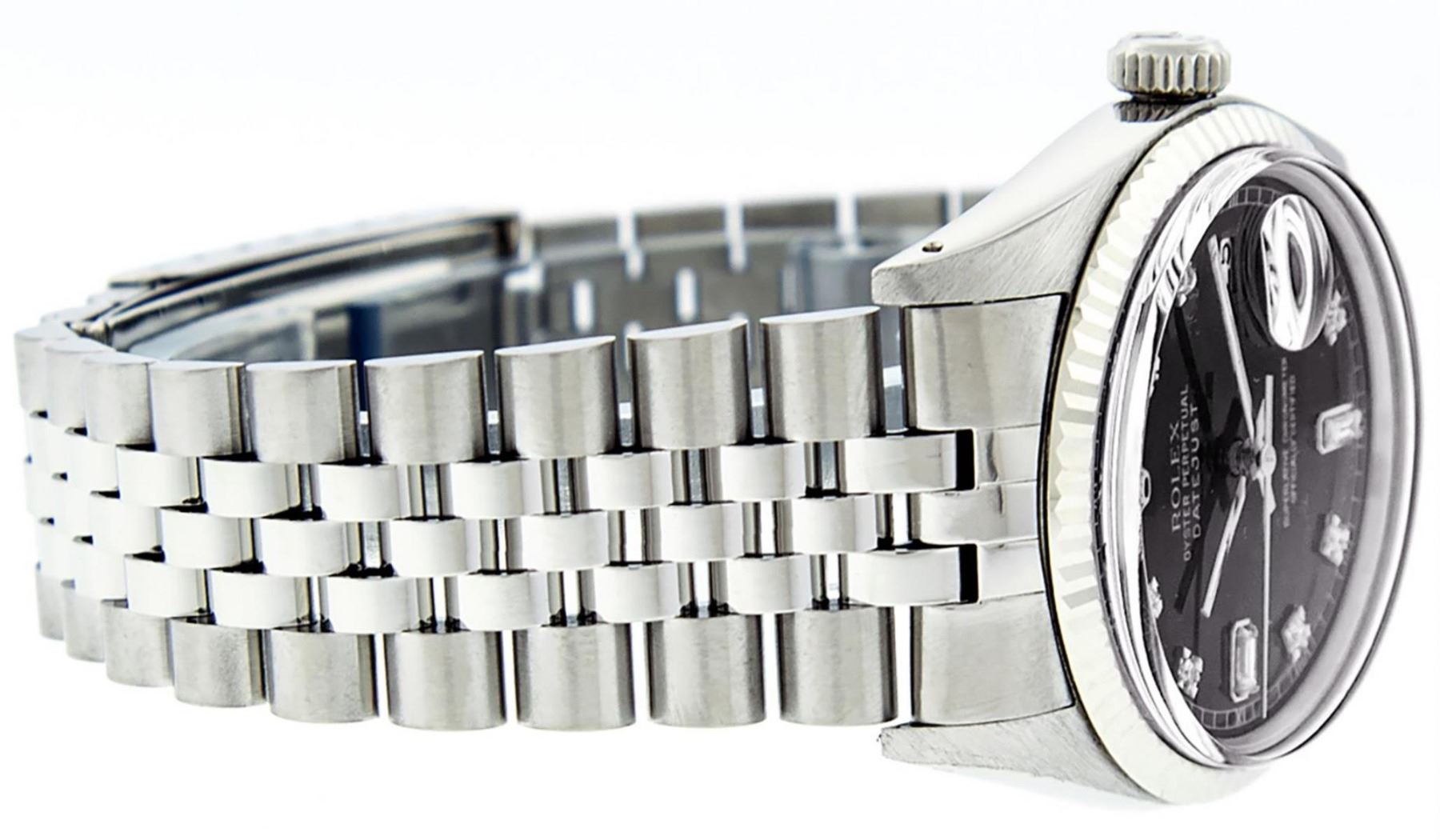 One Mens Stainless Steel Rolex Datejust Polished Bright with Satin Finish, This Watch Has Been Serviced & Electronically Tested, Stainless Steel Case: 36mm, Stainless Steel Crown, Bezel: 14K White Gold Fluted Bezel. Custom Crystal: New Acrylic Cyclops Lens. Custom Hands: New Luminescent Hands. Movement: Automatic Winding Movement Caliber 3035. Custom Dial: Black Diamond 8 + 2 Dial With Roman Track, Diamond Count: 8 Diamonds + 2 Baguettes in Dial G To H In Color, SI-VS Clarity. Date Window: 3 O'Clock Position Date Display, Quickset, Model: Datejust, Condition: G-6 Extra Fine. Bracelet: Stainless Steel Jubilee Band. Bright Polish & Satin Finish. 7.0 Inch Length, Adjustable. Standard Clasp, With Rolex Logo. This Watch Has Been Serviced Time Tested And Is In Excellent Condition It Is Free Of All Scratches And Dents.