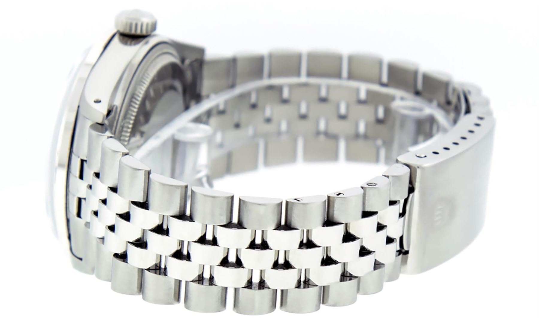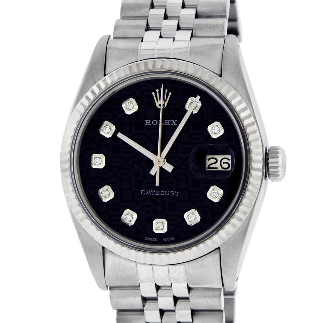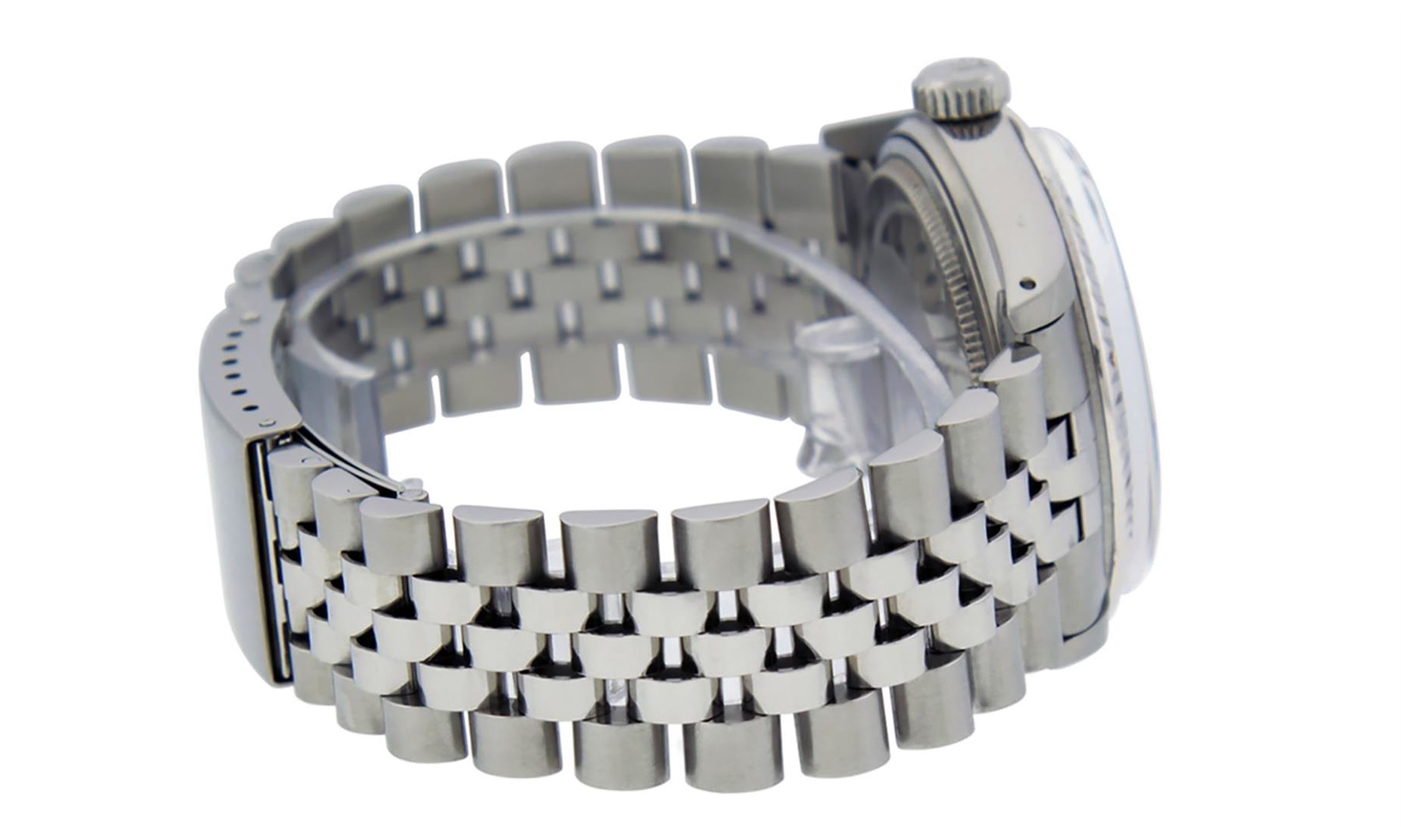 One Mens Stainless Steel Rolex Datejust Polished Bright with Satin Finish, This Watch Has Been Serviced & Electronically Tested, Stainless Steel Case: 36mm, Stainless Steel Crown, Bezel: 14K White Gold Fluted Bezel. Custom Crystal: New Acrylic Cyclops Lens. Custom Hands: New Luminescent Hands. Movement: Automatic Winding Movement. Custom Dial: Black Diamond Dial With Diamond Hour Markers, Diamond Count: 10 Diamonds in Dial G To H In Color, SI-VS Clarity. Date Window: 3 O'Clock Position Date Display, Quickset, Model: Datejust, Condition: G-6 Extra Fine. Bracelet: Stainless Steel Jubilee Band. Bright Polish & Satin Finish. 7.0 Inch Length, Adjustable. Standard Clasp, With Rolex Logo. This Watch Has Been Serviced Time Tested And Is In Excellent Condition It Is Free Of All Scratches And Dents.