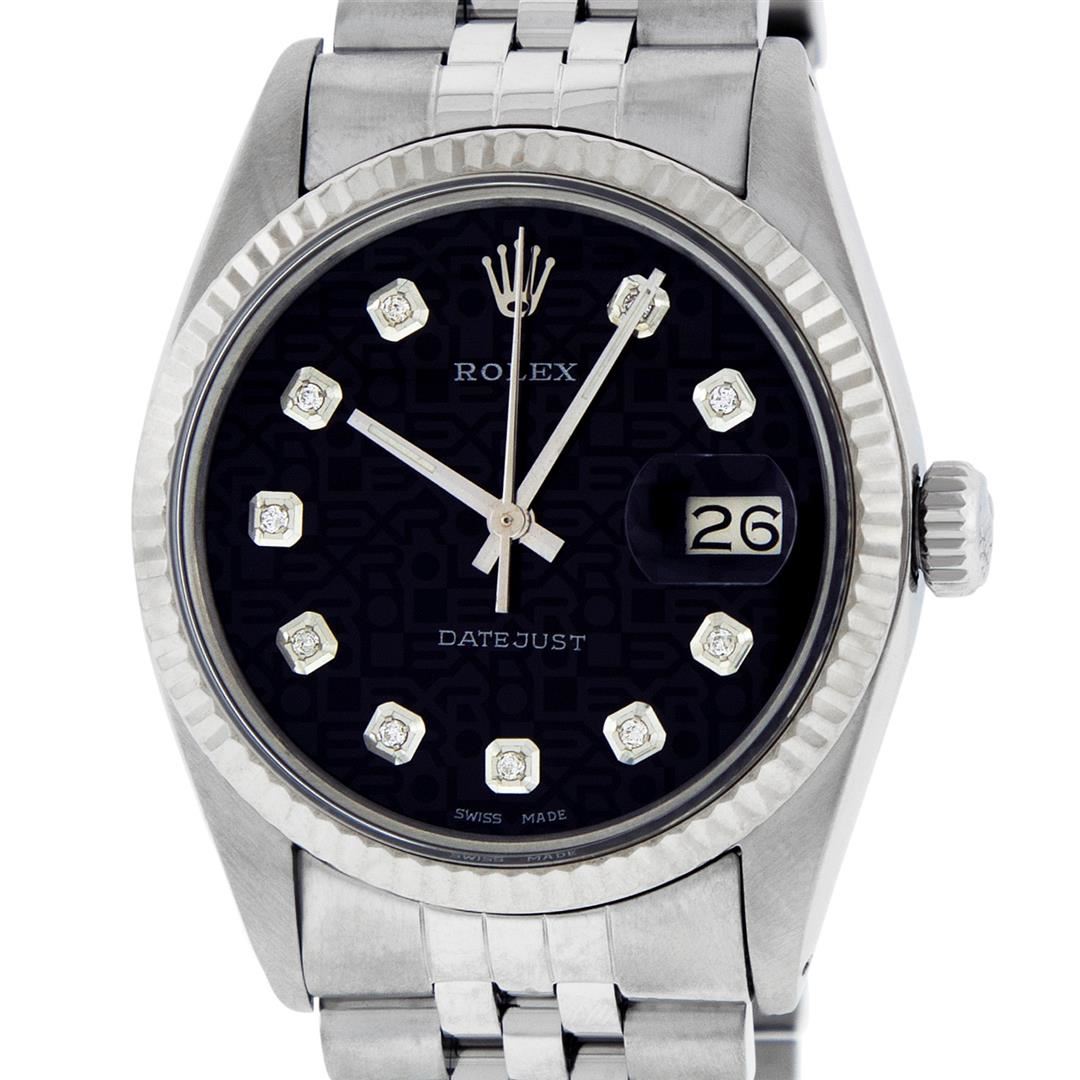 One Mens Stainless Steel Rolex Datejust Polished Bright with Satin Finish, This Watch Has Been Serviced & Electronically Tested, Stainless Steel Case: 36mm, Stainless Steel Crown, Bezel: 14K White Gold Fluted Bezel. Custom Crystal: New Acrylic Cyclops Lens. Custom Hands: New Luminescent Hands. Movement: Automatic Winding Movement. Custom Dial: Black Diamond Dial With Diamond Hour Markers, Diamond Count: 10 Diamonds in Dial G To H In Color, SI-VS Clarity. Date Window: 3 O'Clock Position Date Display, Quickset, Model: Datejust, Condition: G-6 Extra Fine. Bracelet: Stainless Steel Jubilee Band. Bright Polish & Satin Finish. 7.0 Inch Length, Adjustable. Standard Clasp, With Rolex Logo. This Watch Has Been Serviced Time Tested And Is In Excellent Condition It Is Free Of All Scratches And Dents.