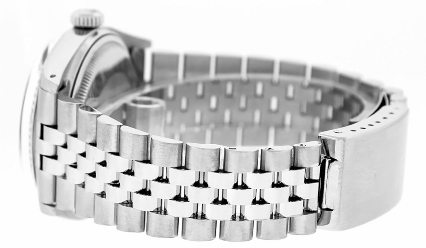 One Mens Stainless Steel Rolex Datejust Polished Bright with Satin Finish, This Watch Has Been Serviced & Electronically Tested, Stainless Steel Case: 36mm, Stainless Steel Crown, Bezel: 14K White Gold Fluted Bezel. Custom Crystal: New Acrylic Cyclops Lens. Custom Hands: New Luminescent Hands. Movement: Automatic Winding Movement Caliber 3035. Custom Dial: Blue Diamond Dial With Diamond Hour Markers, Diamond Count: 8 Diamonds + 2 Diamond Baguettes in Dial, G To H In Color, SI-VS Clarity. Date Window: 3 O'Clock Position Date Display, Quickset, Model: Datejust, Condition: G-6 Extra Fine. Bracelet: Stainless Steel Jubilee. Bright Polish & Satin Finish. 7.0 Inch Length, Adjustable. Standard Clasp, With Rolex Logo. This Watch Has Been Serviced Time Tested And Is In Excellent Condition It Is Free Of All Scratches And Dents
