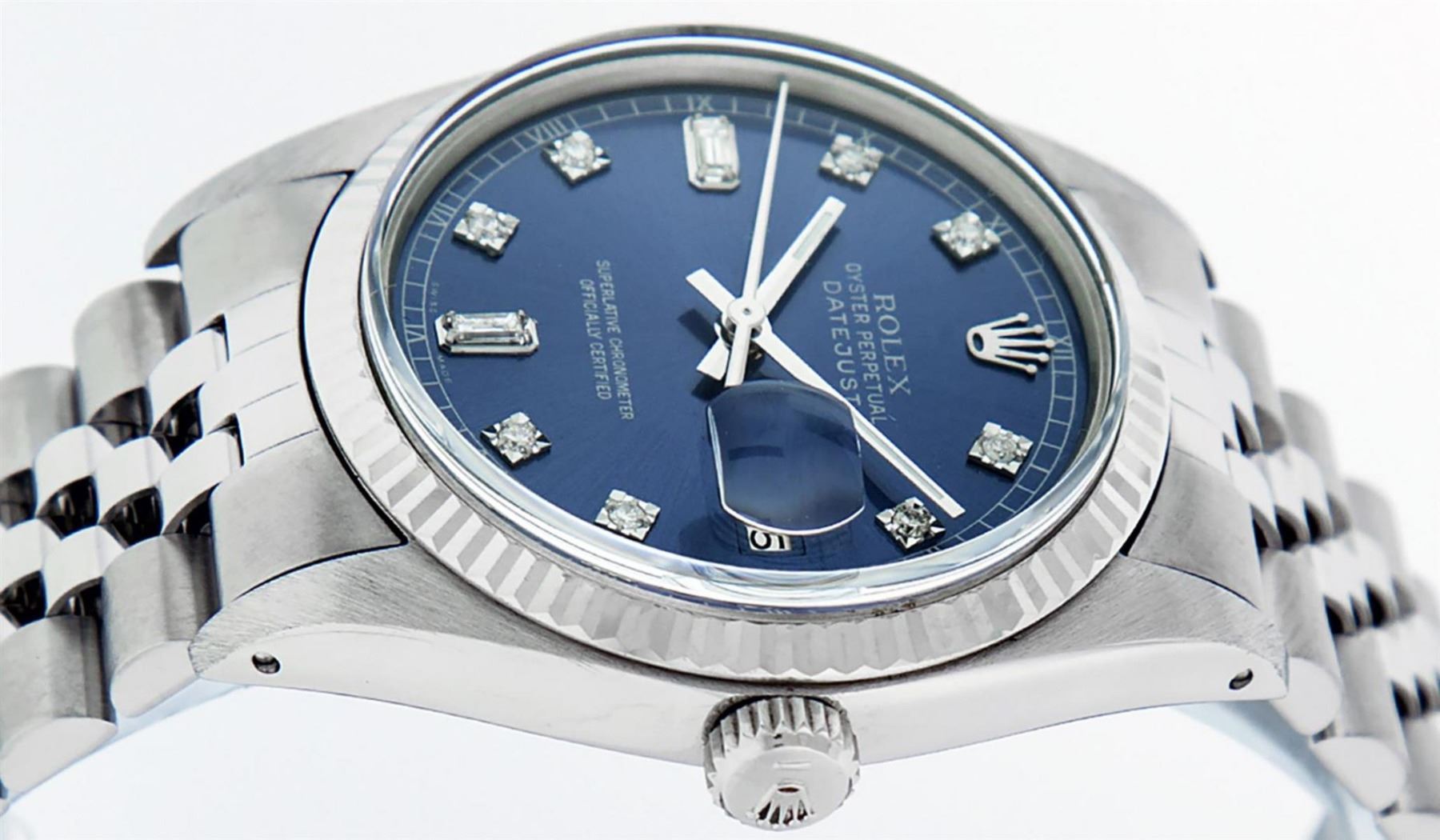 One Mens Stainless Steel Rolex Datejust Polished Bright with Satin Finish, This Watch Has Been Serviced & Electronically Tested, Stainless Steel Case: 36mm, Stainless Steel Crown, Bezel: 14K White Gold Fluted Bezel. Custom Crystal: New Acrylic Cyclops Lens. Custom Hands: New Luminescent Hands. Movement: Automatic Winding Movement Caliber 3035. Custom Dial: Blue Diamond Dial With Diamond Hour Markers, Diamond Count: 8 Diamonds + 2 Diamond Baguettes in Dial, G To H In Color, SI-VS Clarity. Date Window: 3 O'Clock Position Date Display, Quickset, Model: Datejust, Condition: G-6 Extra Fine. Bracelet: Stainless Steel Jubilee. Bright Polish & Satin Finish. 7.0 Inch Length, Adjustable. Standard Clasp, With Rolex Logo. This Watch Has Been Serviced Time Tested And Is In Excellent Condition It Is Free Of All Scratches And Dents