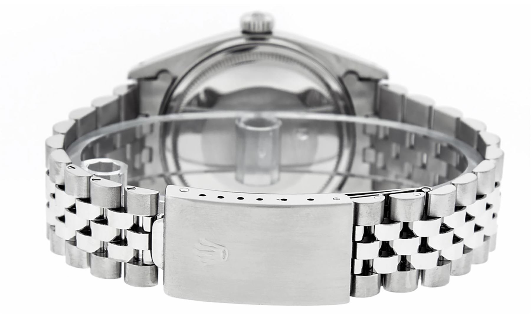 One Mens Stainless Steel Rolex Datejust Polished Bright with Satin Finish, This Watch Has Been Serviced & Electronically Tested, Stainless Steel Case: 36mm, Stainless Steel Crown, Bezel: 14K White Gold Fluted Bezel. Custom Crystal: New Acrylic Cyclops Lens. Custom Hands: New Luminescent Hands. Movement: Automatic Winding Movement. Custom Dial: Blue Diamond Dial With Diamond Hour Markers, Diamond Count: 8 Diamonds + 2 Diamond Baguettes in Dial, G To H In Color, SI-VS Clarity. Date Window: 3 O'Clock Position Date Display, Quickset, Model: Datejust, Condition: G-6 Extra Fine. Bracelet: Stainless Steel Jubilee. Bright Polish & Satin Finish. 7.0 Inch Length, Adjustable. Standard Clasp, With Rolex Logo. This Watch Has Been Serviced Time Tested And Is In Excellent Condition It Is Free Of All Scratches And Dents