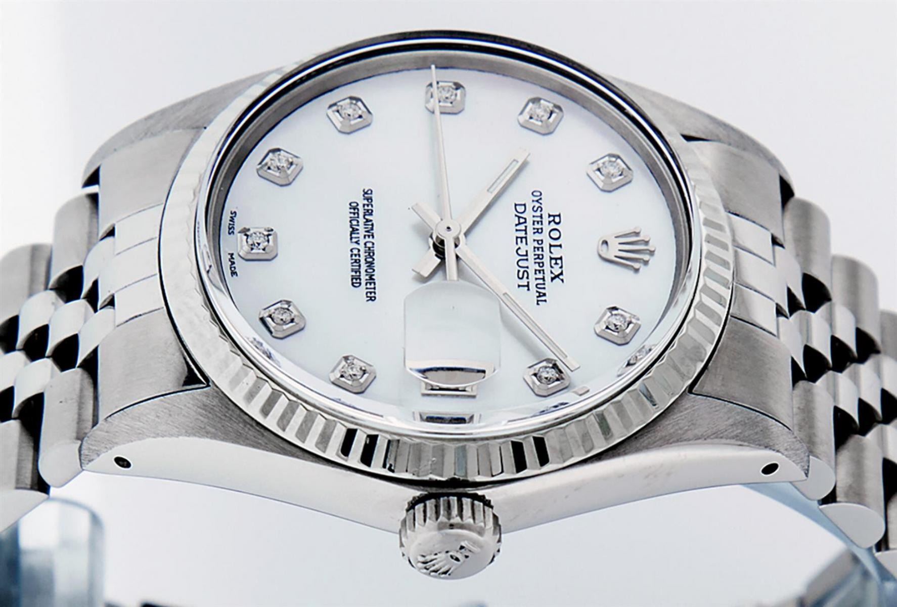 One Mens Stainless Steel Rolex Datejust Polished Bright with Satin Finish, This Watch Has Been Serviced & Electronically Tested, Stainless Steel Case: 36mm, Stainless Steel Crown, Bezel: 14K White Gold Fluted Bezel. Custom Crystal: New Acrylic Cyclops Lens. Custom Hands: New Luminescent Hands. Movement: Automatic Winding Movement Caliber 3035. Custom Dial: Mother Of Pearl Diamond Dial With Diamond Hour Markers, Diamond Count: 10 Diamonds in Dial G To H In Color, SI-VS Clarity. Date Window: 3 O'Clock Position Date Display, Quickset, Model: Datejust, Condition: G-6 Extra Fine. Bracelet: Stainless Steel Jubilee. Bright Polish & Satin Finish. 7.0 Inch Length, Adjustable. Standard Clasp, With Rolex Logo. This Watch Has Been Serviced Time Tested And Is In Excellent Condition It Is Free Of All Scratches And Dents