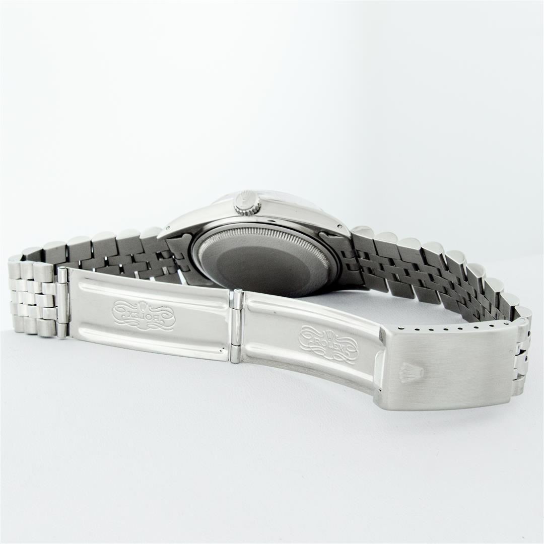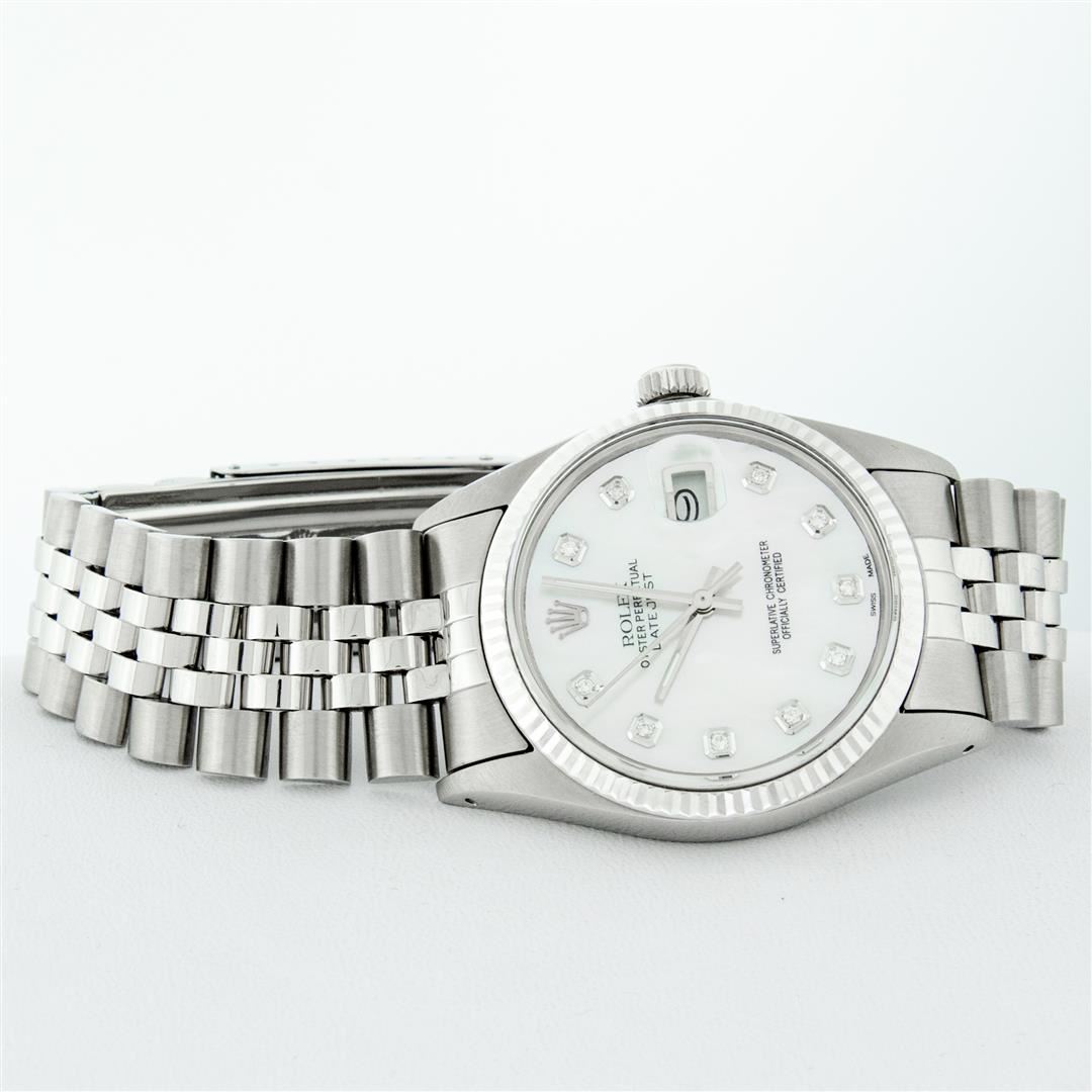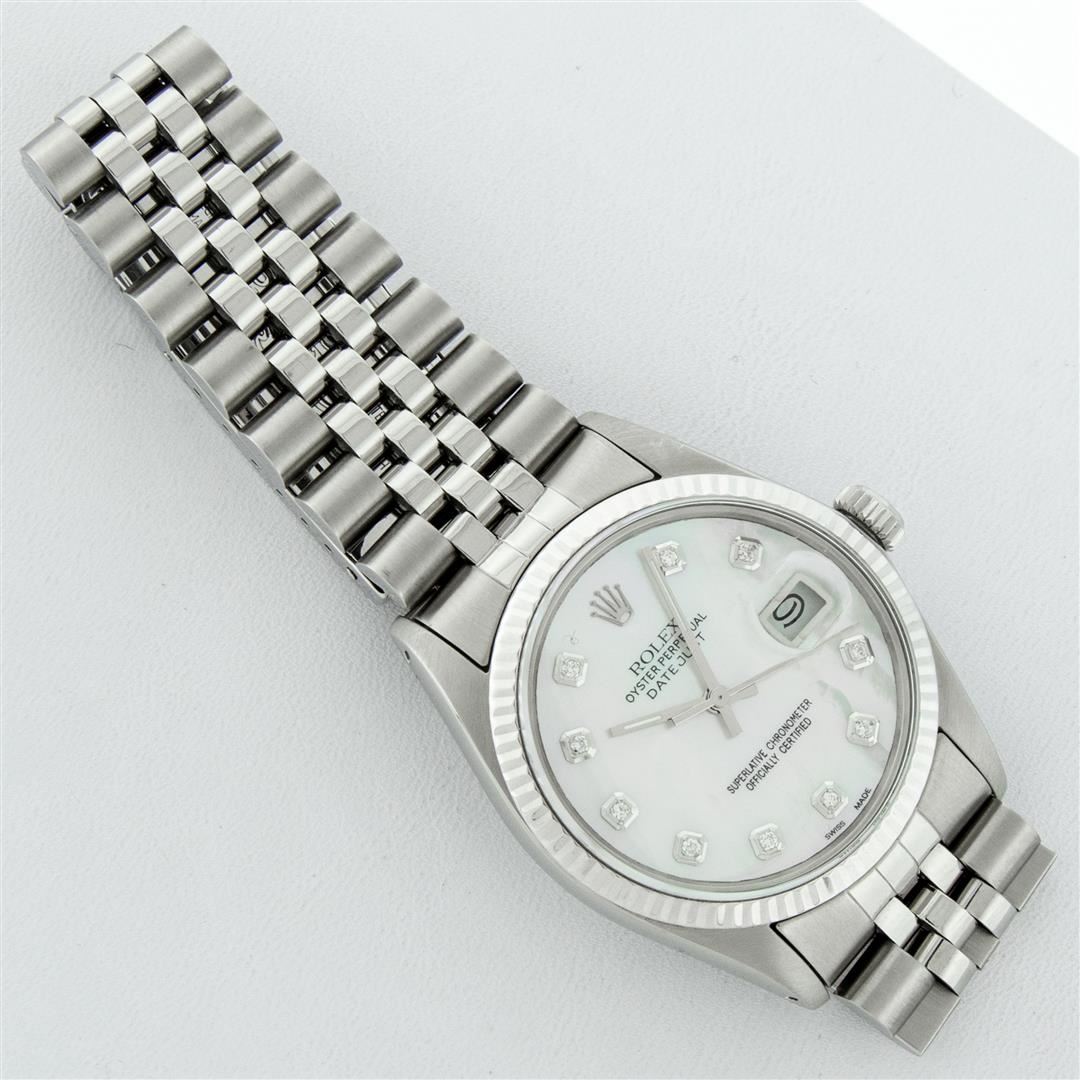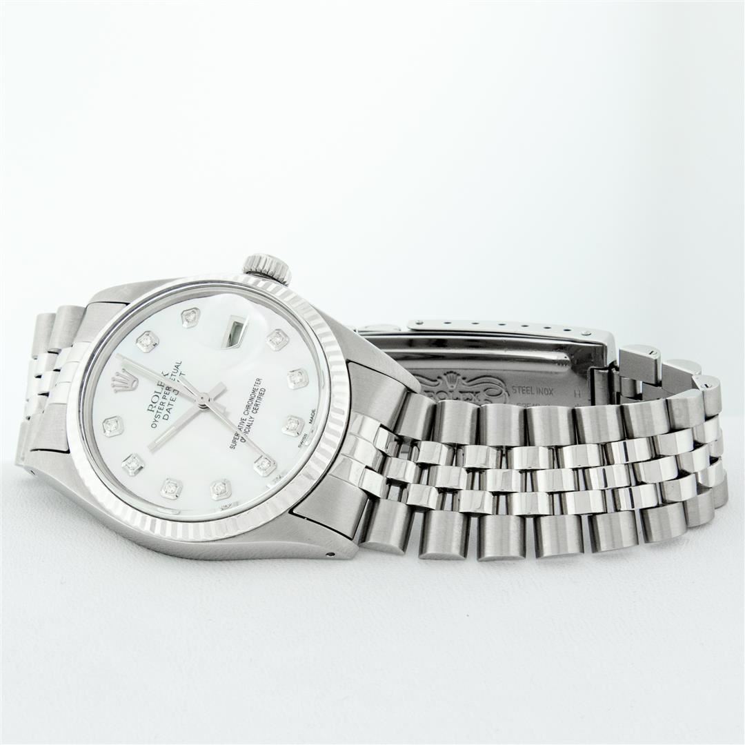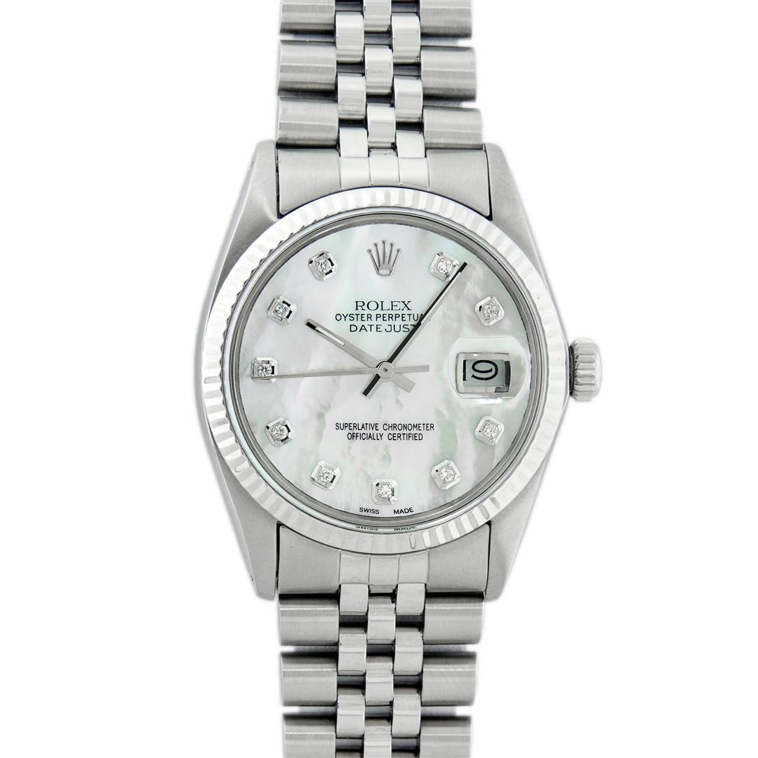 One Mens Stainless Steel Rolex Datejust Polished Bright with Satin Finish, This Watch Has Been Serviced & Electronically Tested, Stainless Steel Case: 36mm, Stainless Steel Crown, Bezel: 14K White Gold Fluted Bezel. Custom Crystal: New Acrylic Cyclops Lens. Custom Hands: New Luminescent Hands. Movement: Automatic Winding Movement. Custom Dial: Mother Of Pearl Diamond Dial With Diamond Hour Markers, Diamond Count: 10 Diamonds in Dial G To H In Color, SI-VS Clarity. Date Window: 3 O'Clock Position Date Display, Quickset, Model: Datejust, Condition: G-6 Extra Fine. Bracelet: Stainless Steel Jubilee. Bright Polish & Satin Finish. 7.0 Inch Length, Adjustable. Standard Clasp, With Rolex Logo. This Watch Has Been Serviced Time Tested And Is In Excellent Condition It Is Free Of All Scratches And Dents