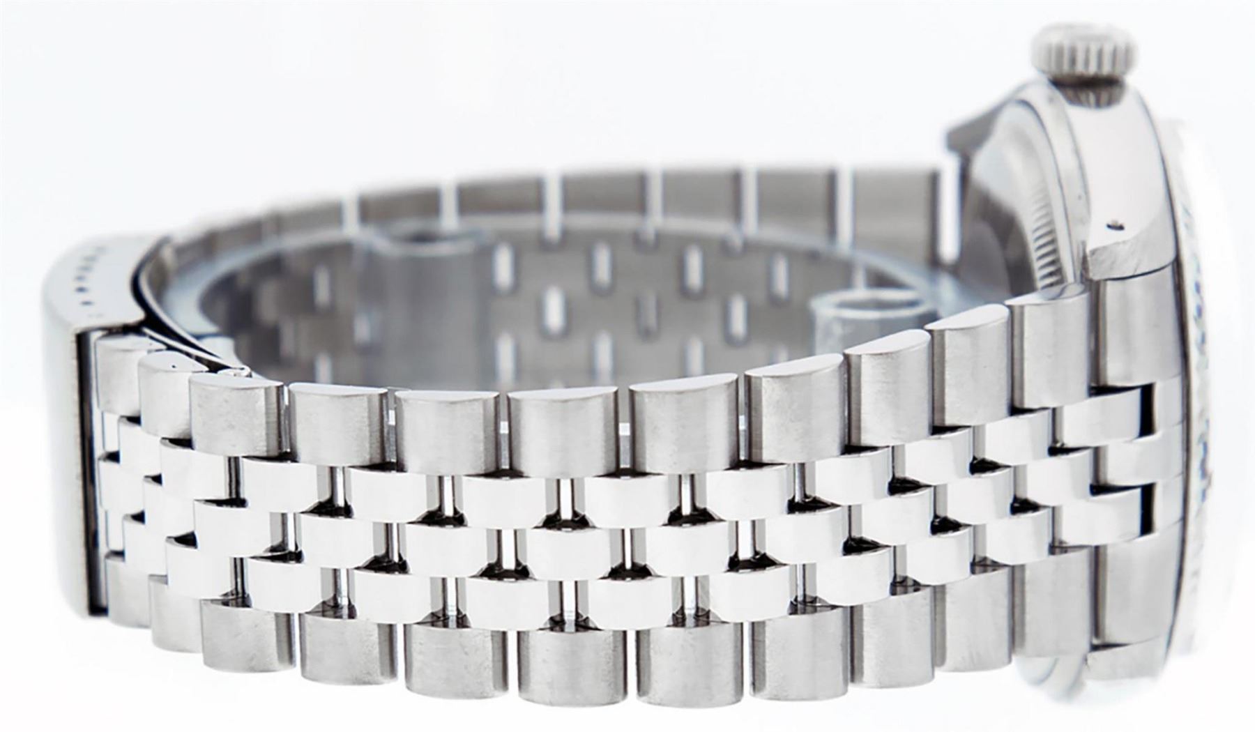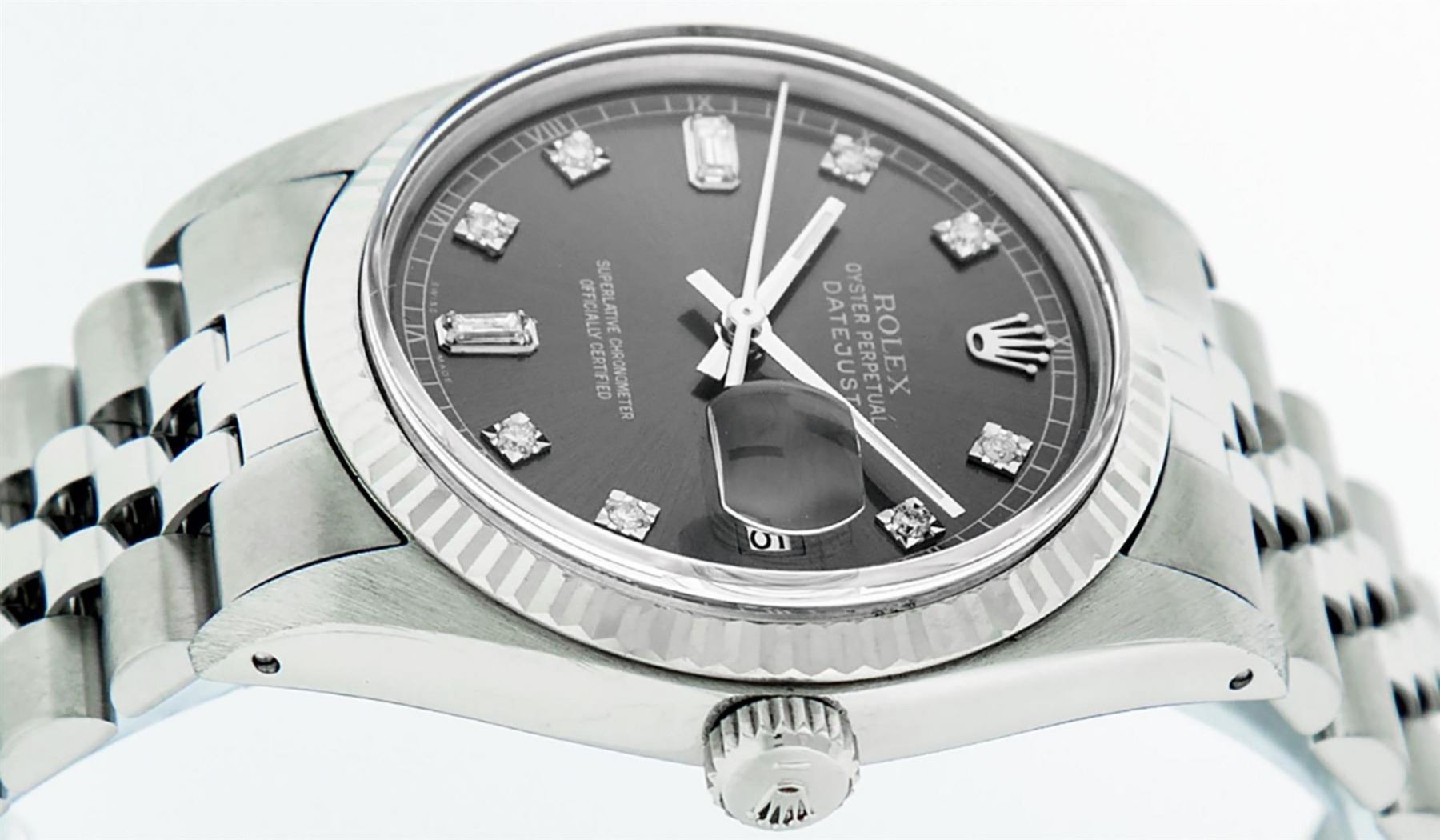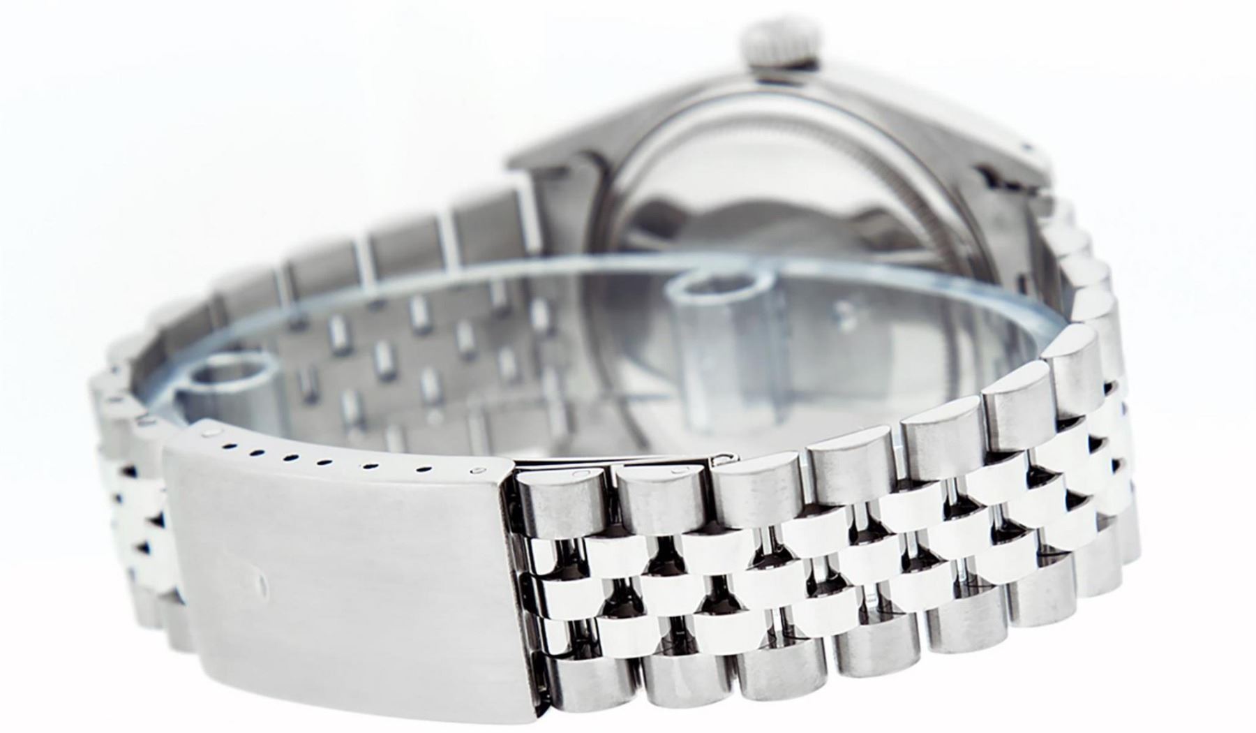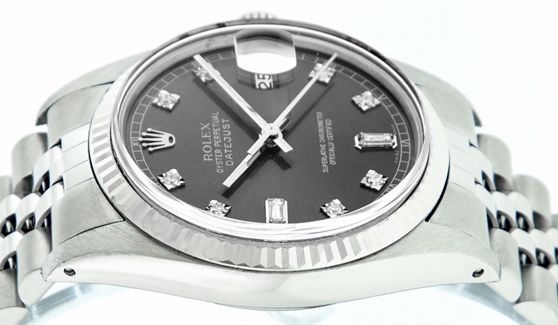 One Mens Stainless Steel Rolex Datejust Polished Bright with Satin Finish, This Watch Has Been Serviced & Electronically Tested, Stainless Steel Case: 36mm, Stainless Steel Crown, Bezel: 14K White Gold Fluted Bezel. Custom Crystal: New Acrylic Cyclops Lens. Custom Hands: New Luminescent Hands. Movement: Automatic Winding Movement Caliber 3035. Custom Dial: Rhodium Diamond 8 + 2 Dial With Roman Track, Diamond Count: 8 Diamonds + 2 Baguettes in Dial G To H In Color, SI-VS Clarity. Date Window: 3 O'Clock Position Date Display, Quickset, Model: Datejust, Condition: G-6 Extra Fine. Bracelet: Stainless Steel Jubilee Band. Bright Polish & Satin Finish. 7.0 Inch Length, Adjustable. Standard Clasp, With Rolex Logo. This Watch Has Been Serviced Time Tested And Is In Excellent Condition It Is Free Of All Scratches And Dents.