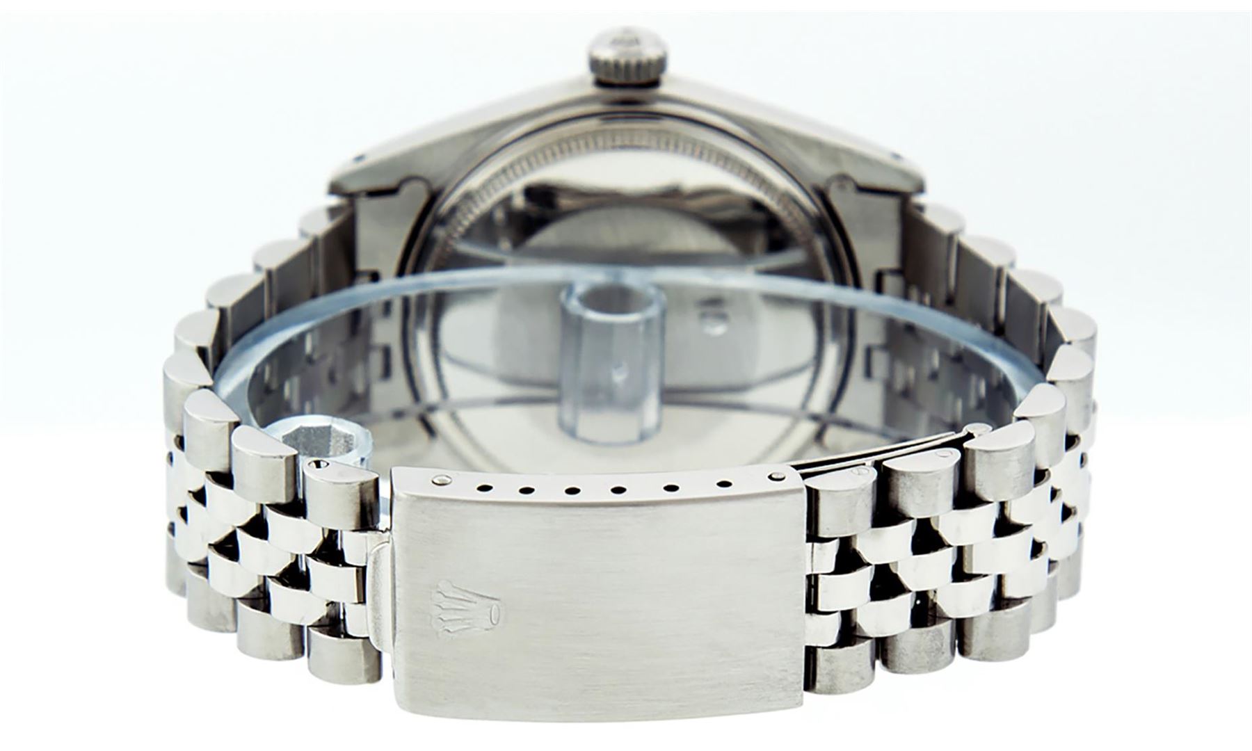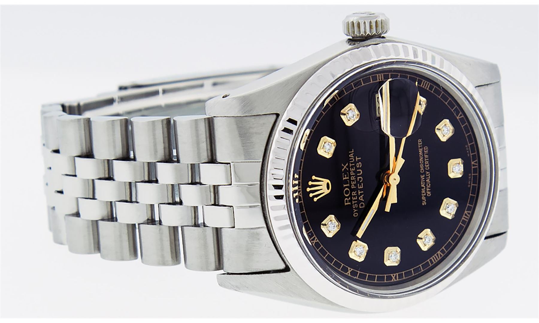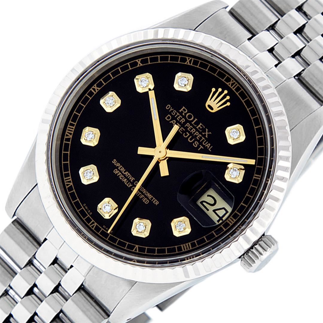 One Mens Stainless Steel Rolex Datejust Polished, Serviced & Electronically Tested, Stainless Steel Case: 36mm, Stainless Steel Crown, Original Bezel: White Gold Fluted Bezel. Custom Crystal: New Acrylic Cyclops Lens. Custom Hands: New Luminescent Hands. Movement: Automatic Winding Movement. Caliber. Custom Dial: Black Diamond Dial With Track, Diamond Count: 10 Diamonds, Clarity: SI-VS, Color: G to H. Date Window: 3 O'Clock Position Date Display, Quickset, Model: Datejust. Condition: G-6 Extra Fine. Bracelet: Stainless Steel Jubilee. Bright Polish & Satin Finish. 7.0 Inch Length, Adjustable. Standard Clasp, With Rolex Logo. This Watch Has Been Serviced Time Tested And Is In Excellent Condition It Is Free Of All Scratches And Dents