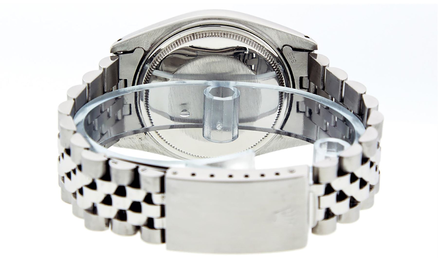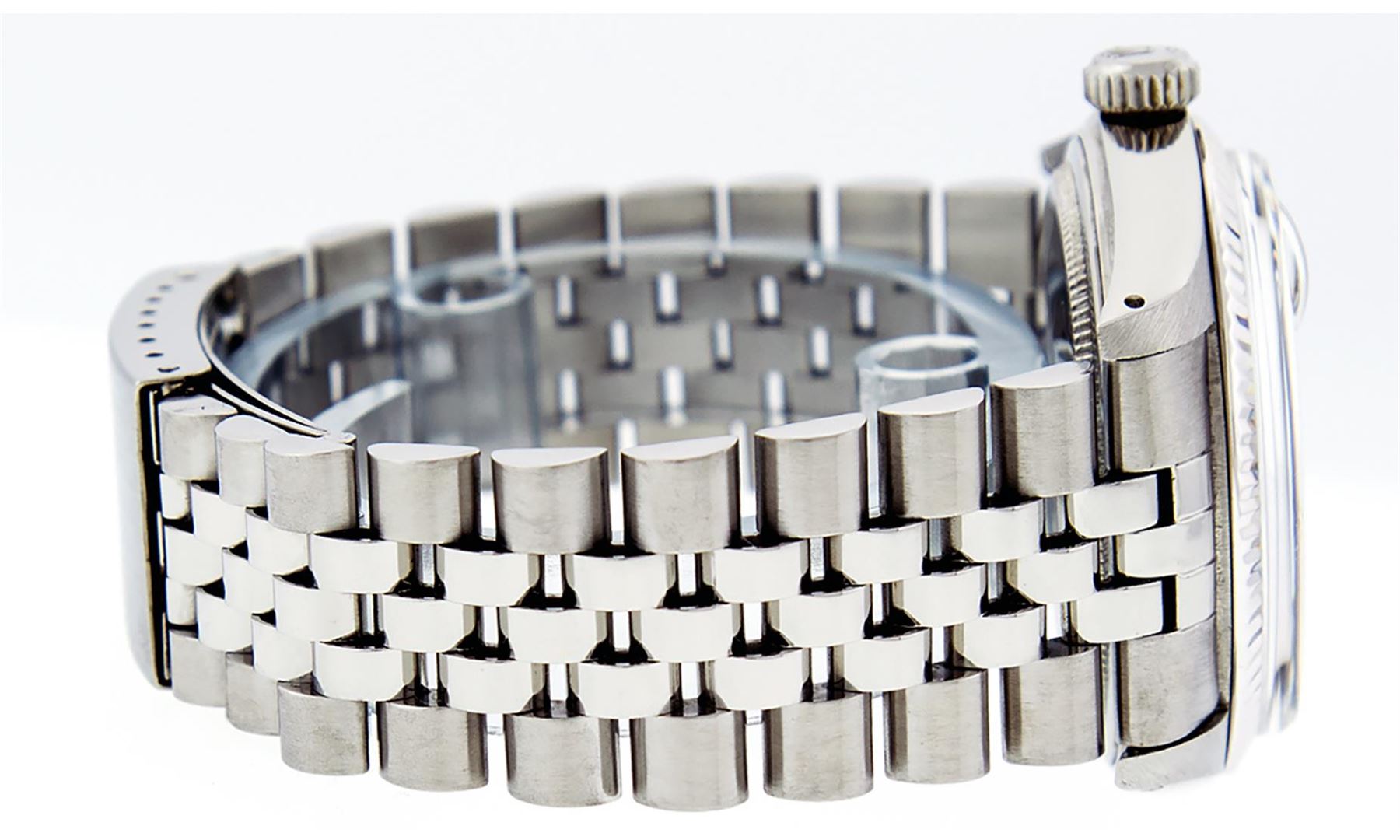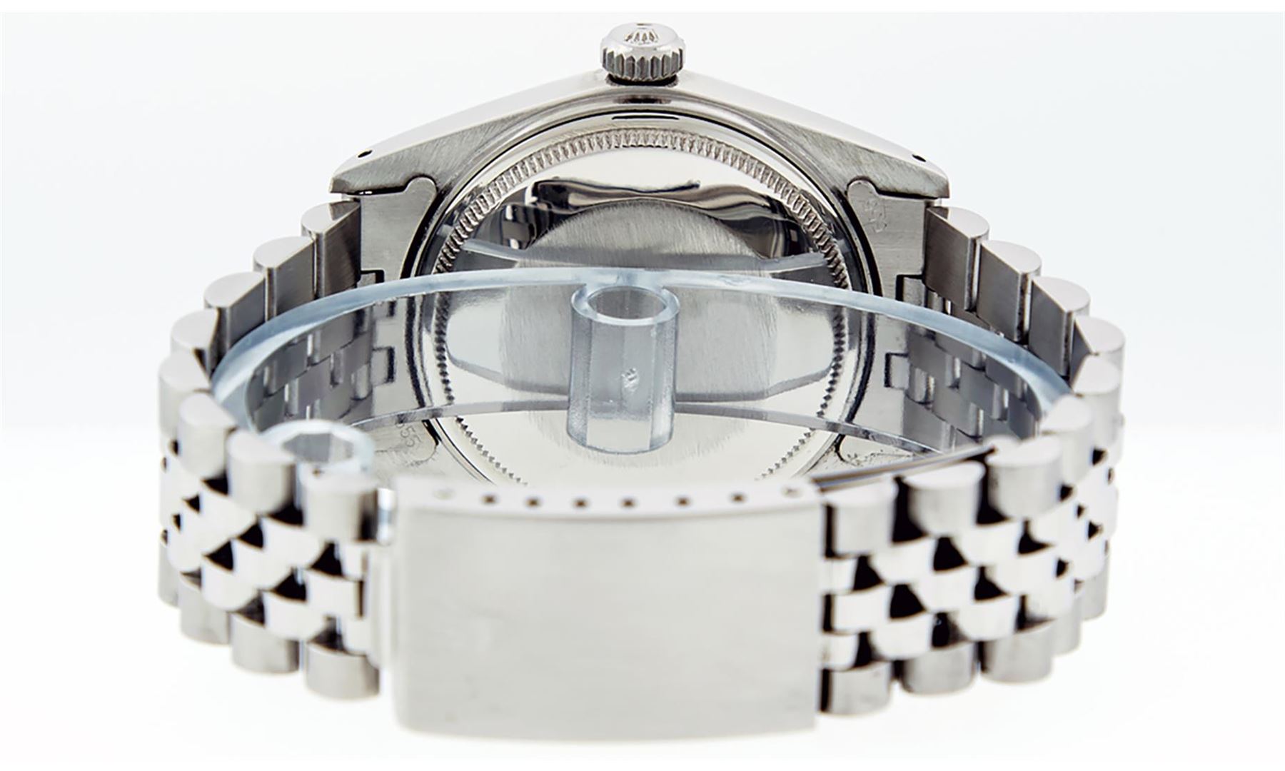 One Mens Stainless Steel Rolex Datejust Polished, Serviced & Electronically Tested, Stainless Steel Case: 36mm, Stainless Steel Crown, Original Bezel: White Gold Fluted Bezel. Custom Crystal: New Acrylic Cyclops Lens. Custom Hands: New Luminescent Hands. Movement: Automatic Winding Movement. Caliber. Custom Dial: Black Diamond Dial With Track, Diamond Count: 10 Diamonds, Clarity: SI-VS, Color: G to H. Date Window: 3 O'Clock Position Date Display, Quickset, Model: Datejust. Condition: G-6 Extra Fine. Bracelet: Stainless Steel Jubilee. Bright Polish & Satin Finish. 7.0 Inch Length, Adjustable. Standard Clasp, With Rolex Logo. This Watch Has Been Serviced Time Tested And Is In Excellent Condition It Is Free Of All Scratches And Dents
