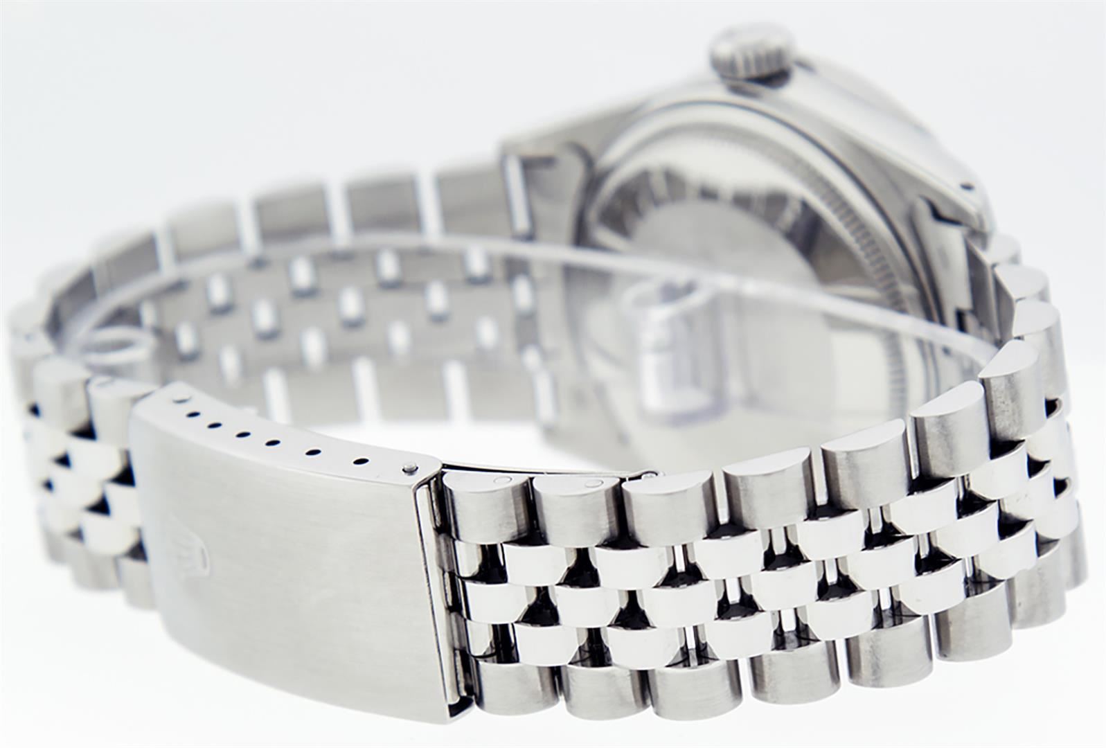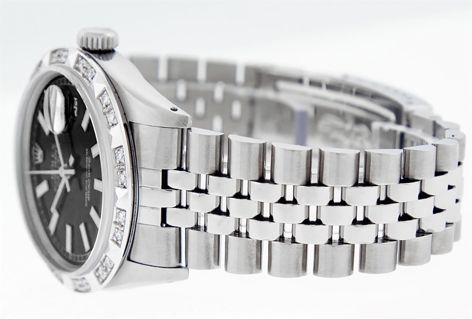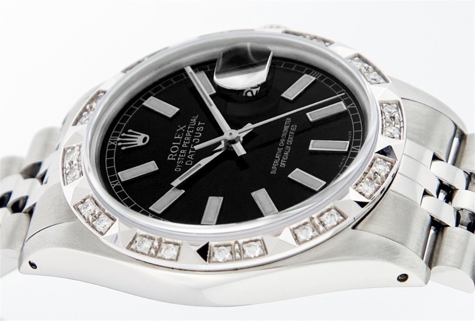 One Mens Stainless Steel Rolex Datejust Polished Bright with Satin Finish, Serviced & Electronically Tested, Stainless Steel Case: 36mm, Stainless Steel Crown, Custom Bezel: New 18K White Gold Pyramid Diamond Bezel, Diamond Count: 24 Diamonds On Bezel, Total Bezel Weight .70 Carat, Clarity: SI-VS, Color: G to H. Custom Crystal: New Synthetic Sapphire Cyclops Lens. Custom Hands: New Luminescent Hands. Movement: Automatic Winding Movement Caliber 3035. Custom Dial: Black Index Dial With Roman Square Track. Date Window: 3 O'Clock Position Date Display, Quickset, Model: Datejust. Condition: G-6 Extra Fine. Bracelet: Stainless Steel Jubilee. Bright Polish & Satin Finish. 7.0 Inch Length, Adjustable. Standard Clasp, With Rolex Logo. This Watch Has Been Serviced Time Tested And Is In Excellent Condition It Is Free Of All Scratches And Dents
