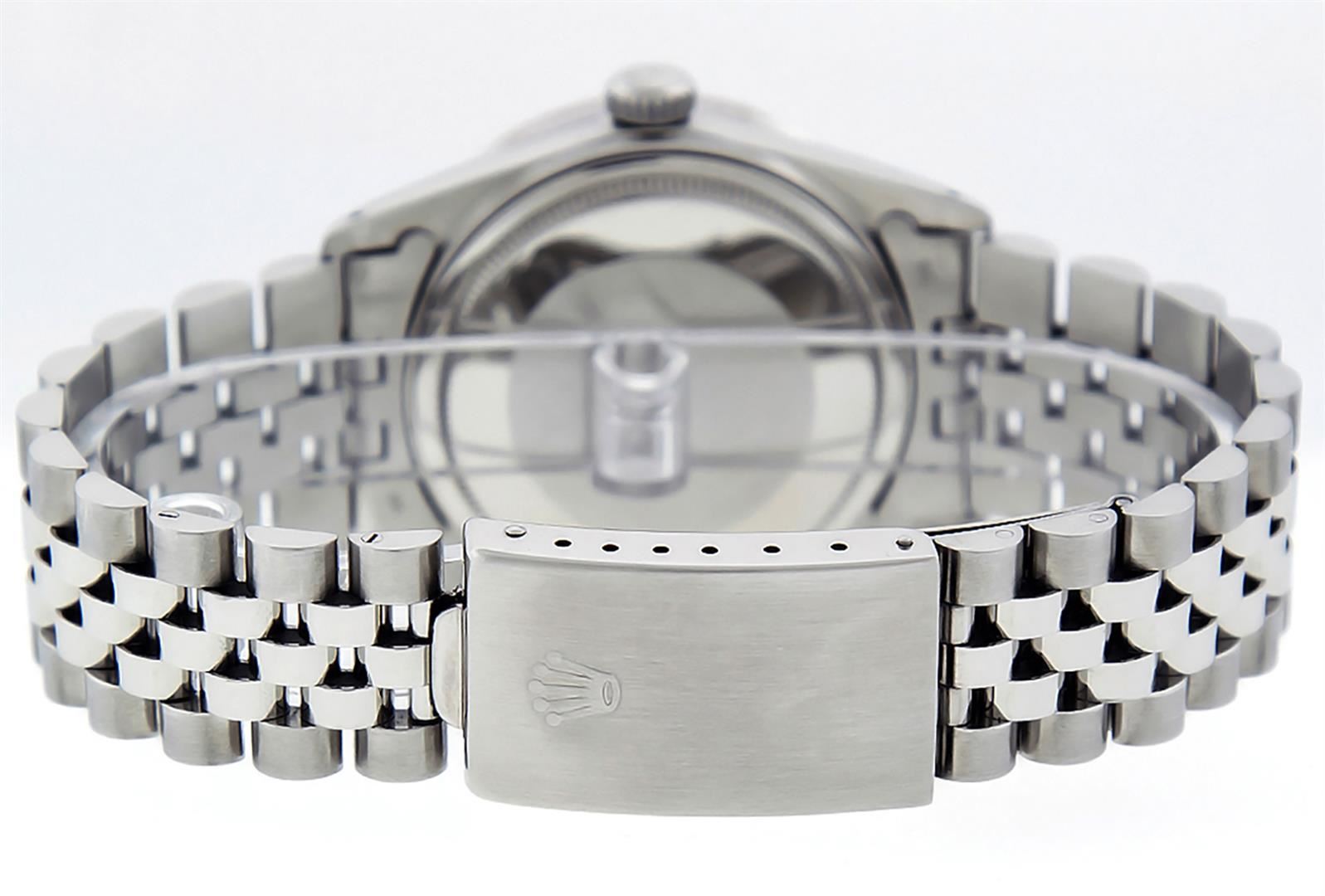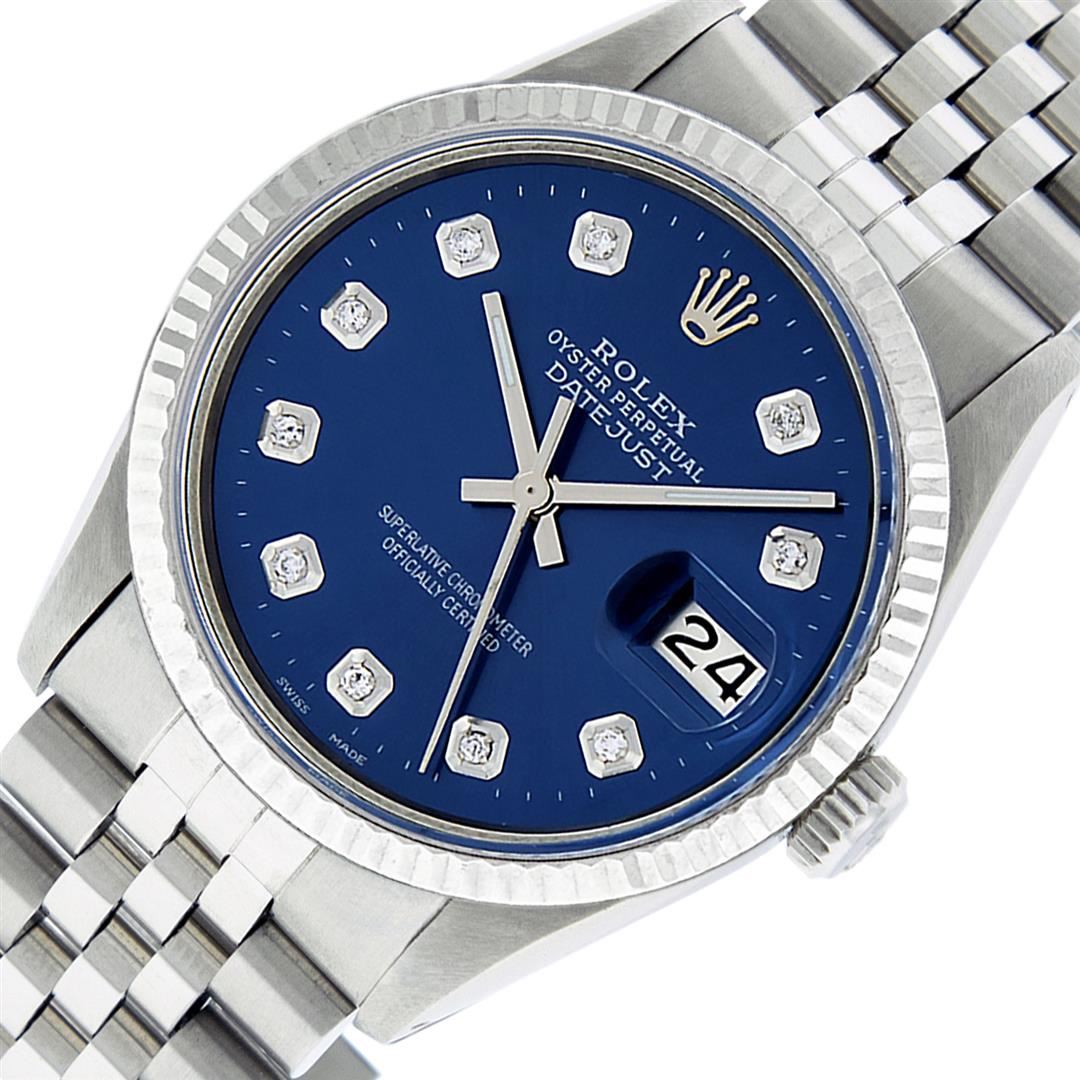 One Mens Stainless Steel Rolex Datejust Polished Bright with Satin Finish, Serviced & Electronically Tested, Stainless Steel Case: 36mm, Stainless Steel Crown, Bezel: New 14K White Gold Fluted Bezel. Custom Crystal: New Acrylic Cyclops Lens. Custom Hands: New Luminescent Hands. Movement: Automatic Winding Movement. Custom Dial: Blue Diamond Dial With Line Track, Diamond Count: 10 Diamond in Dial G To H In Color, SI-VS Clarity. Date Window: 3 O'Clock Position Date Display, Quickset, Model: Datejust, Condition: G-6 Extra Fine. Bracelet: Stainless Steel Jubilee. Bright Polish & Satin Finish. 7.0 Inch Length, Adjustable. Standard Clasp, With Rolex Logo. This Watch Has Been Serviced Time Tested And Is In Excellent Condition It Is Free Of All Scratches And Dents.