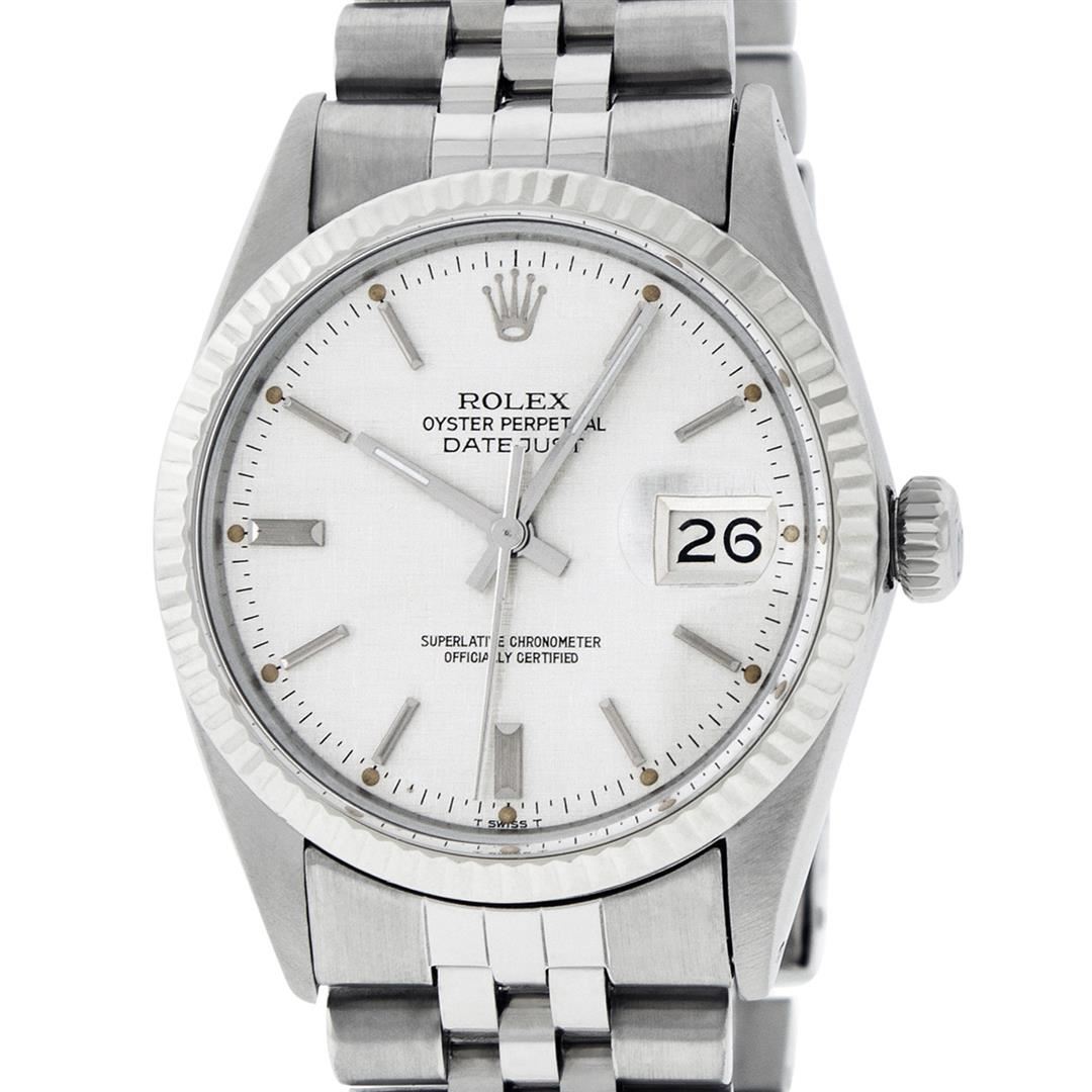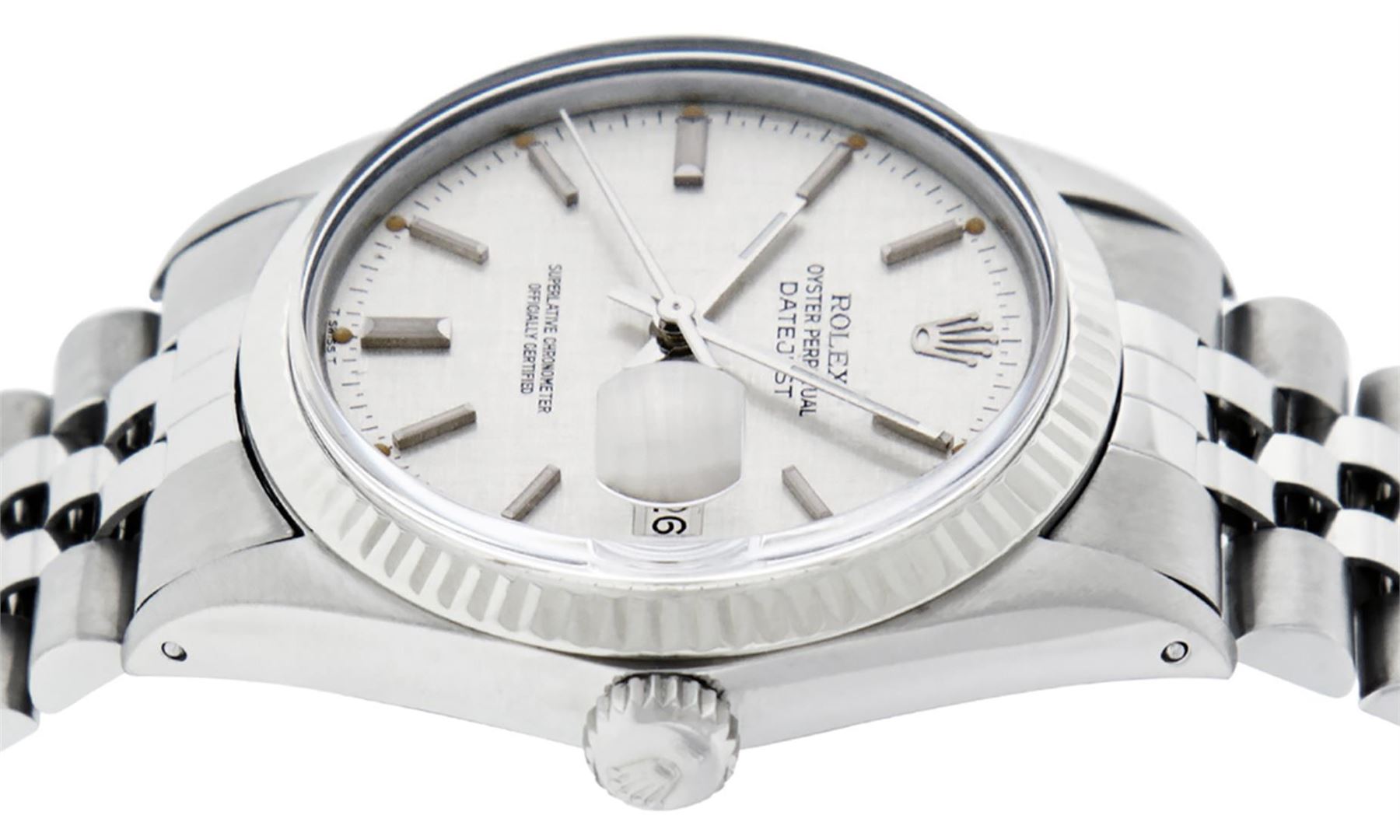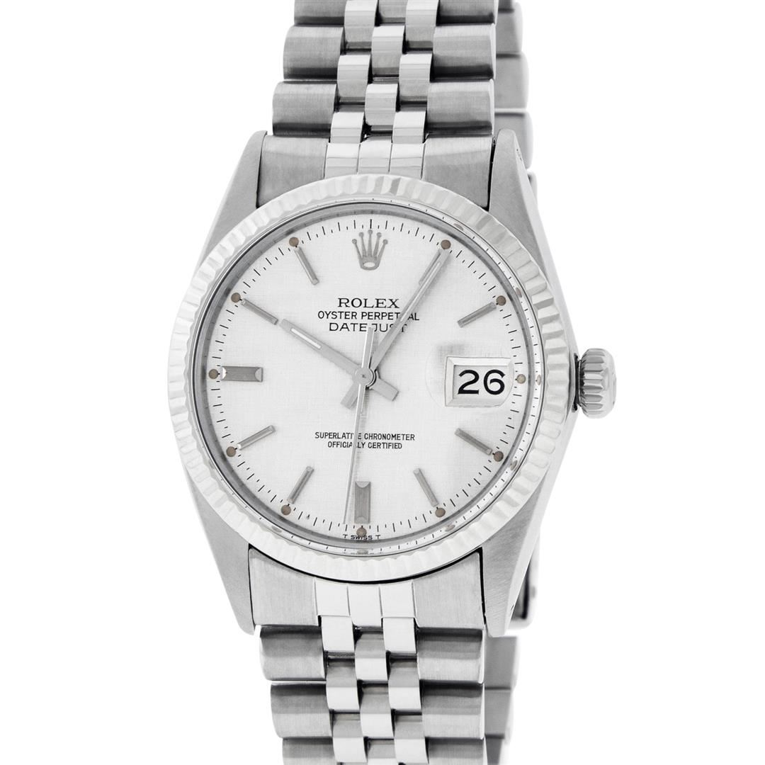 One Mens Stainless Steel Rolex Datejust Polished, Serviced & Electronically Tested, Stainless Steel Case: 36mm, Stainless Steel Crown, Bezel: 14K White Gold Fluted Bezel. Custom Crystal: New Acrylic Cyclops Lens. Custom Hands: New Luminescent Hands. Movement: Automatic Winding Movement Caliber 3035. Dial: Silver Index With Dash Track & Lumi Dot. Date Window: 3 O'Clock Position Date Display, Quickset, Model: Datejust, Condition: G-6 Extra Fine. Bracelet: Stainless Steel Jubilee Band. Bright Polish & Satin Finish. 7.0 Inch Length, Adjustable. Standard Clasp, With Rolex Logo. This Watch Has Been Serviced Time Tested And Is In Excellent Condition It Is Free Of All Scratches And Dents.