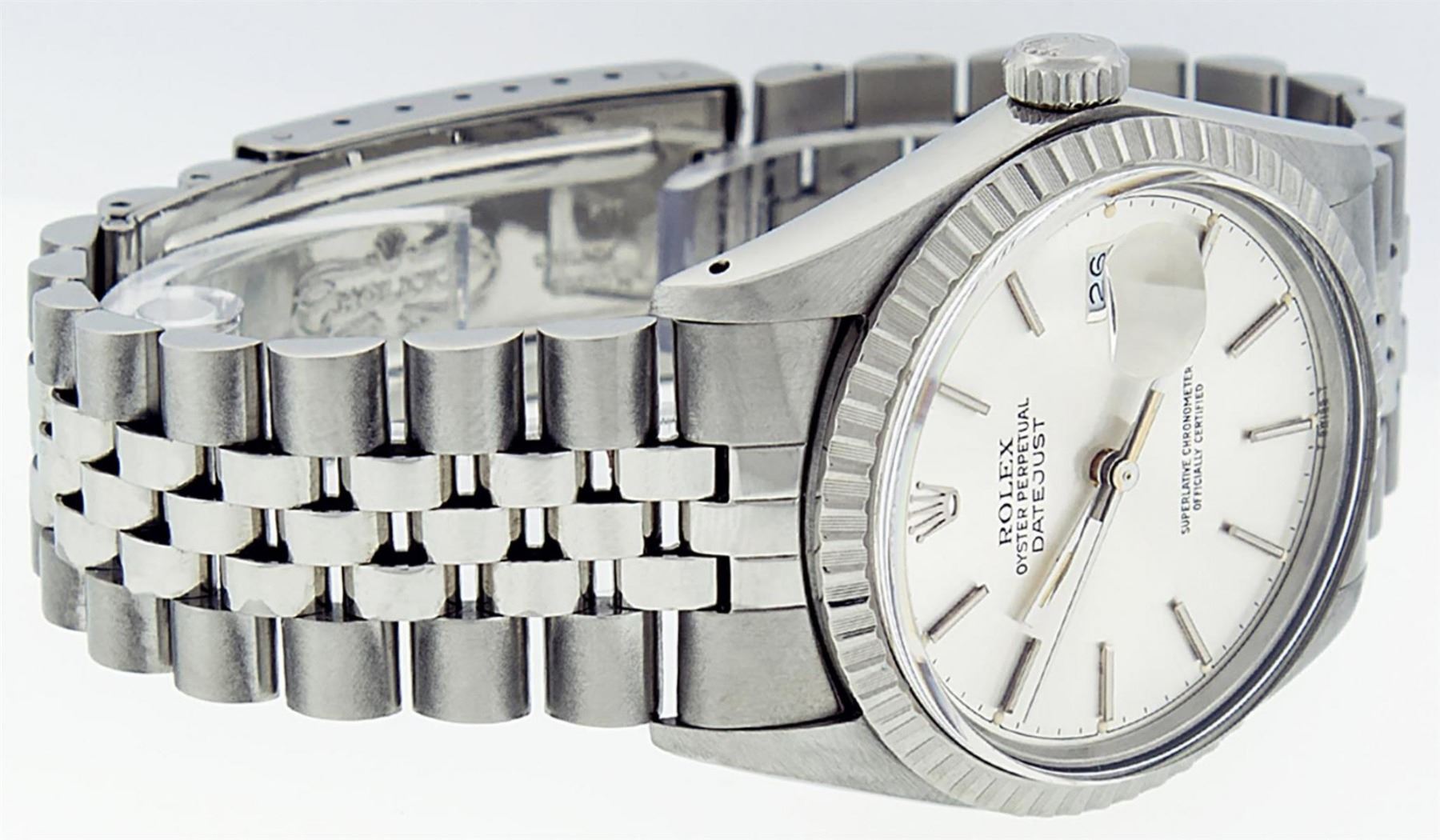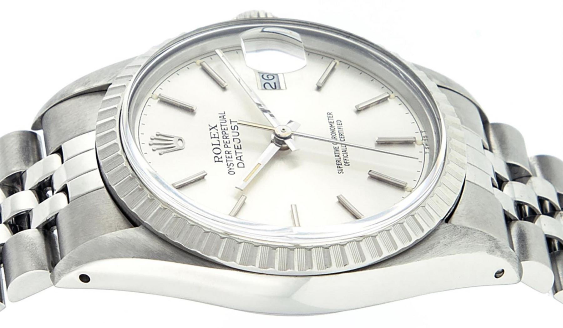 One Mens Stainless Steel Rolex Datejust Polished, Serviced & Electronically Tested, Stainless Steel Case: 36mm, Stainless Steel Crown, Bezel: 14K White Gold Fluted Bezel. Custom Crystal: New Acrylic Cyclops Lens. Custom Hands: New Luminescent Hands. Movement: Automatic Winding Movement Caliber 3035. Custom Dial: Silver Index With Dash Track. Date Window: 3 O'Clock Position Date Display, Quickset, Model: Datejust, Condition: G-6 Extra Fine. Bracelet: Stainless Steel Jubilee Band. Bright Polish & Satin Finish. 7.0 Inch Length, Adjustable. Standard Clasp, With Rolex Logo. This Watch Has Been Serviced Time Tested And Is In Excellent Condition It Is Free Of All Scratches And Dents