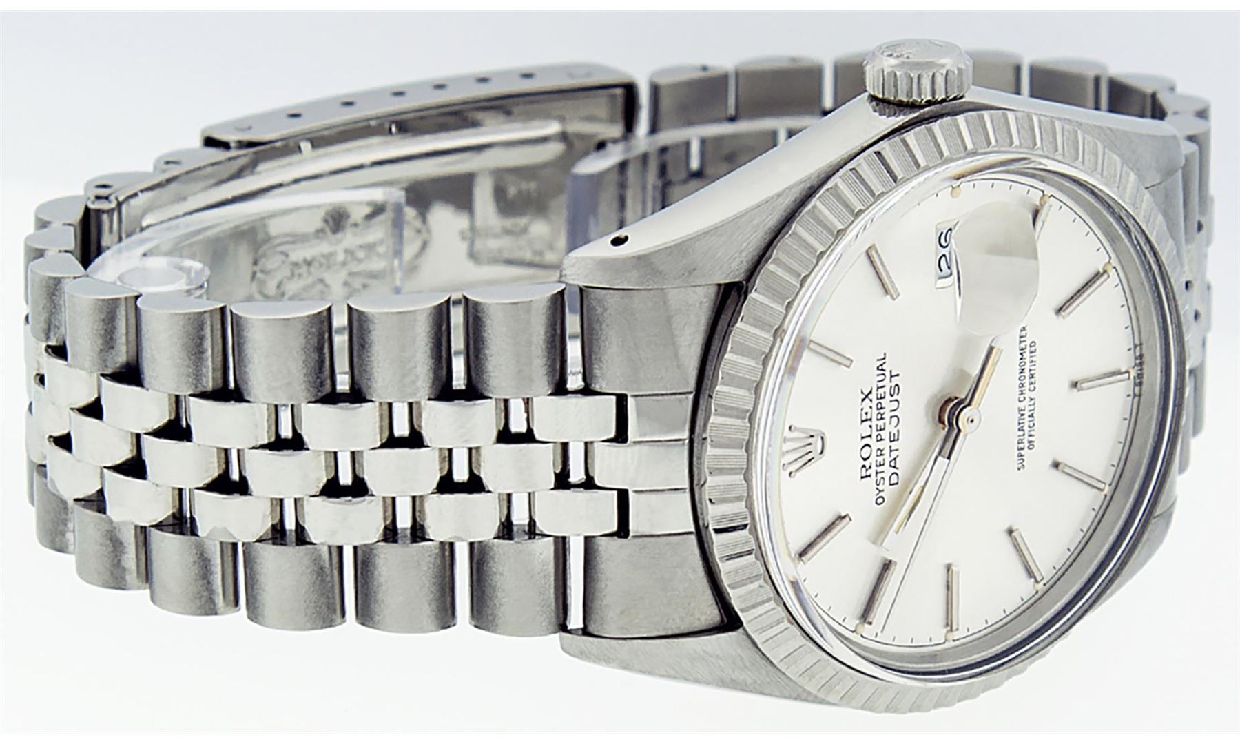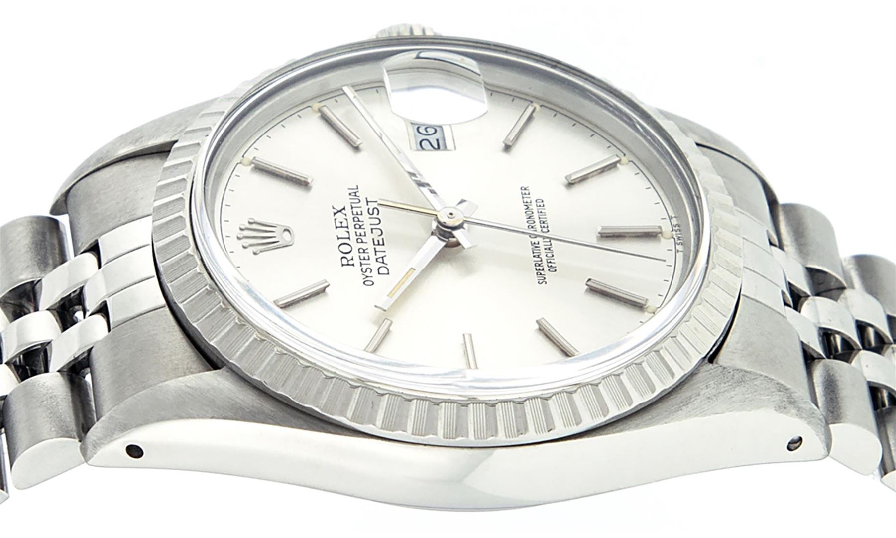 One Mens Pre Owned Stainless Steel Rolex Datejust Polished, Serviced & Electronically Tested, Rolex Stainless Steel Case: 36mm, Stainless Steel Crown, Rolex Bezel: Stainless Steel Engine Turn Bezel. Custom Crystal: Acrylic With Date Window. Hands: Luminescent Hands. Rolex Movement: Automatic Winding Movement 3035. Rolex Dial: Silver Index With Dash Track And Lumi Dots. Date Window: 3 O'Clock Position Date Display, Quickset, Model: Datejust, Condition: G-6 Extra Fine. Rolex Bracelet: Stainless Steel Jubilee Band. Bright Polish & Satin Finish. 7.0 Inch Length, Adjustable. Standard Clasp, With Rolex Logo. This Watch Has Been Serviced Time Tested And Is In Excellent Condition It Is Free Of All Scratches And Dents.
