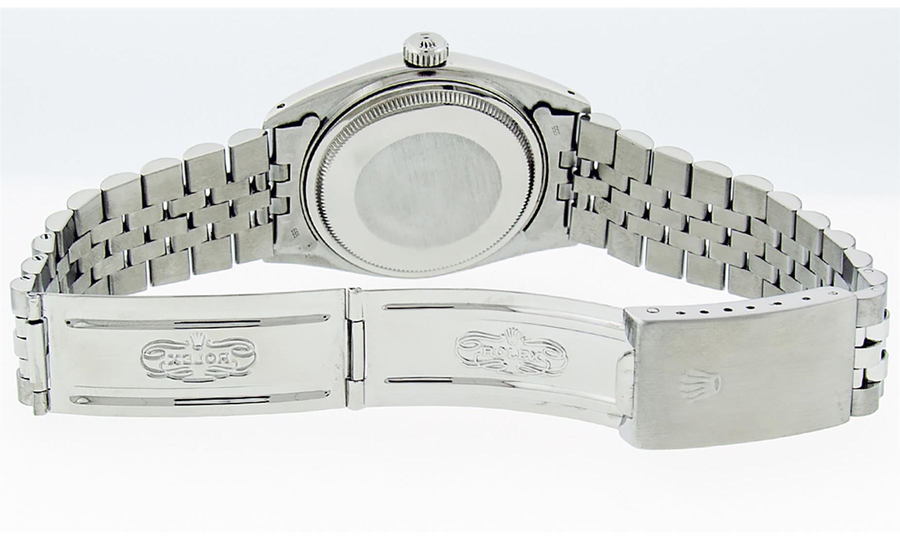 One Mens Pre Owned Stainless Steel Rolex Datejust Polished, Serviced & Electronically Tested, Rolex Stainless Steel Case: 36mm, Stainless Steel Crown, Rolex Bezel: Stainless Steel Engine Turn Bezel. Custom Crystal: Acrylic With Date Window. Hands: Luminescent Hands. Rolex Movement: Automatic Winding Movement 3035. Rolex Dial: Silver Index With Dash Track And Lumi Dots. Date Window: 3 O'Clock Position Date Display, Quickset, Model: Datejust, Condition: G-6 Extra Fine. Rolex Bracelet: Stainless Steel Jubilee Band. Bright Polish & Satin Finish. 7.0 Inch Length, Adjustable. Standard Clasp, With Rolex Logo. This Watch Has Been Serviced Time Tested And Is In Excellent Condition It Is Free Of All Scratches And Dents.