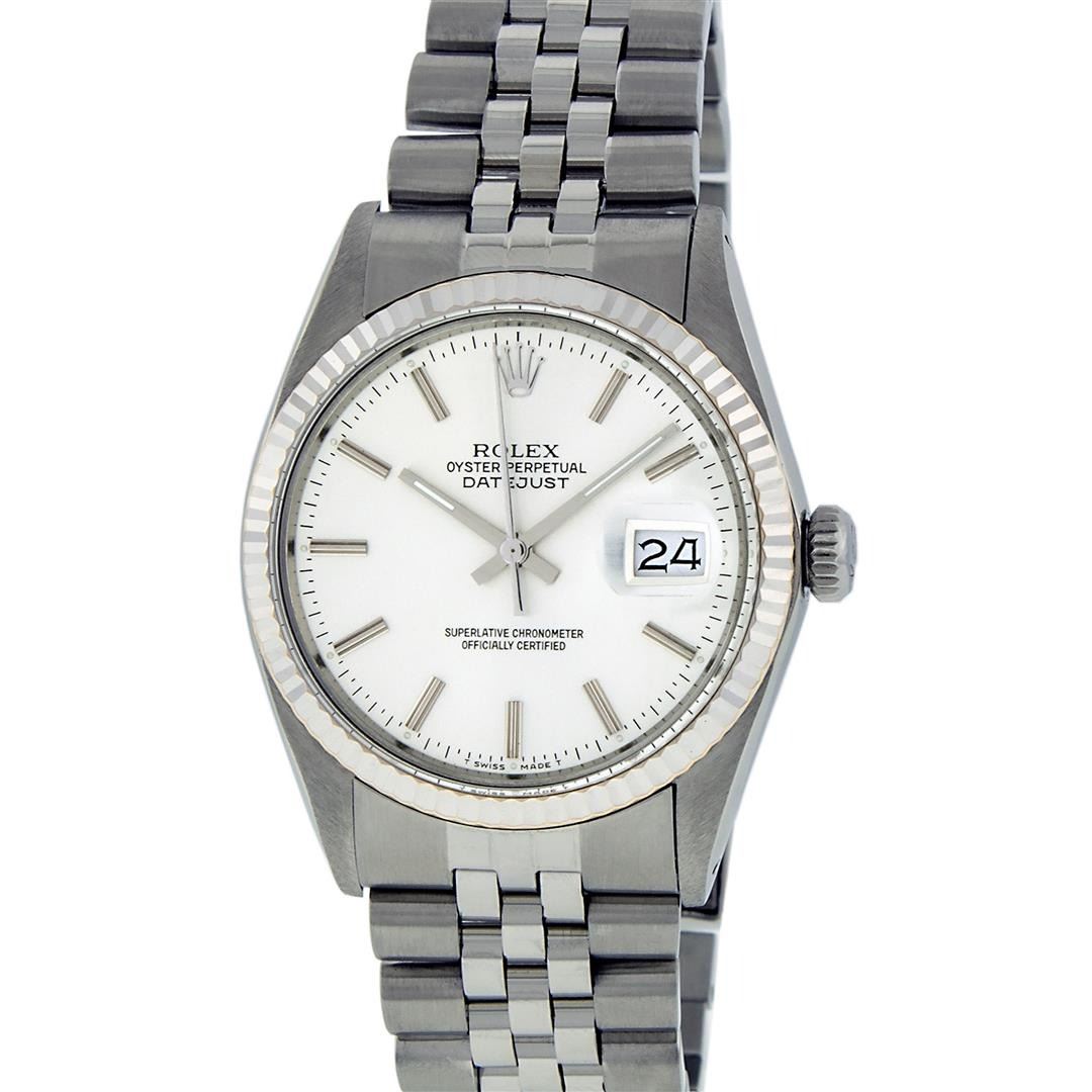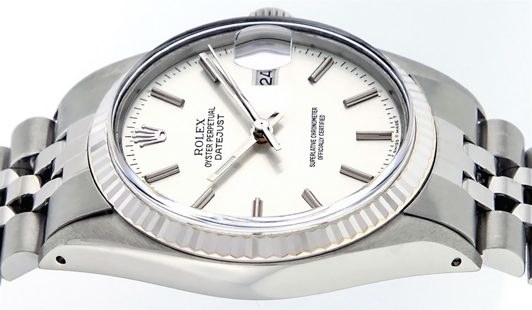 One Mens Pre Owned Stainless Steel Rolex Datejust Polished, Serviced & Electronically Tested, Rolex Stainless Steel Case: 36mm, Rolex Stainless Steel Crown, Rolex Bezel: 14K White Gold Fluted Bezel. Custom Crystal: New Acrylic With Date Window. Custom Hands: New Luminescent Hands. Rolex Movement: Automatic Winding Movement 3035. Rolex Dial: Silver Index With Dash Track And Lumi Dots. Date Window: 3 O'Clock Position Date Display, Quickset, Model: Datejust, Condition: G-6 Extra Fine. Rolex Bracelet: Stainless Steel Jubilee Band. Bright Polish & Satin Finish. 7.0 Inch Length, Adjustable. Standard Clasp, With Rolex Logo. This Watch Has Been Serviced Time Tested And Is In Excellent Condition It Is Free Of All Scratches And Dents.