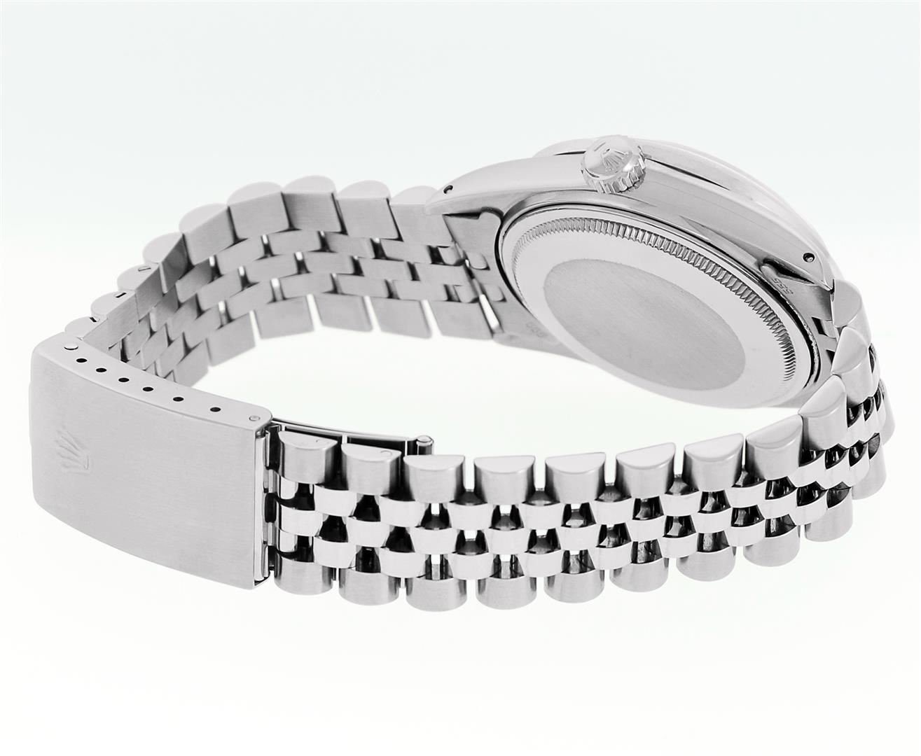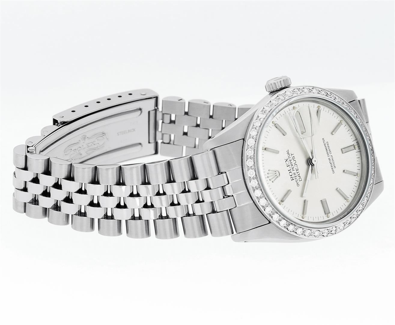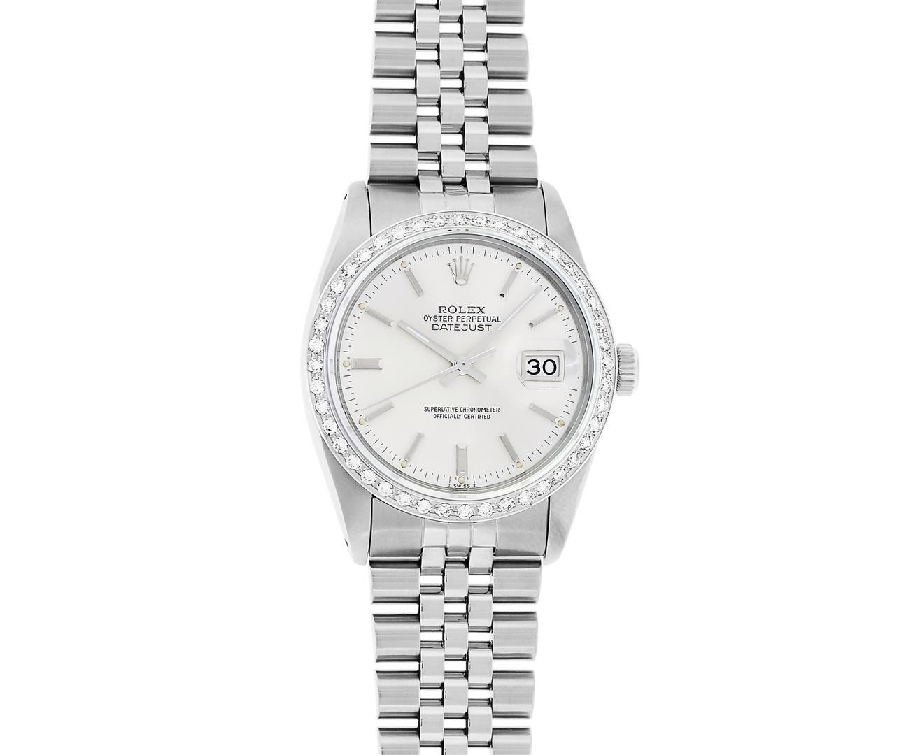 One Mens Pre Owned Stainless Steel Rolex Datejust Polished, Serviced & Electronically Tested, Rolex Stainless Steel Case: 36mm, Rolex Stainless Steel Crown, Custom Bezel: New 18K White Gold Beadset Diamond Bezel, Diamond Count: 44 Diamonds, Total Weight 1.00 Carat, Clarity: SI-VS, Color: G to H. Custom Crystal: New Sapphire With Magnified Date Window. Custom Hands: New Luminescent Hands. Rolex Movement: Automatic Winding Movement 3035. Rolex Dial: Silver Index With Dash Track And Lumi Dot. Date Window: 3 O'Clock Position Date Display, Quickset, Model: Datejust, Condition: G-6 Extra Fine. Rolex Bracelet: Stainless Steel Jubilee Band. Bright Polish & Satin Finish. 7.0 Inch Length, Adjustable. Standard Clasp, With Rolex Logo. This Watch Has Been Serviced Time Tested And Is In Excellent Condition It Is Free Of All Scratches And Dents.
