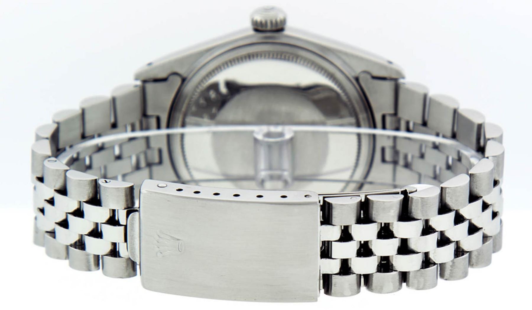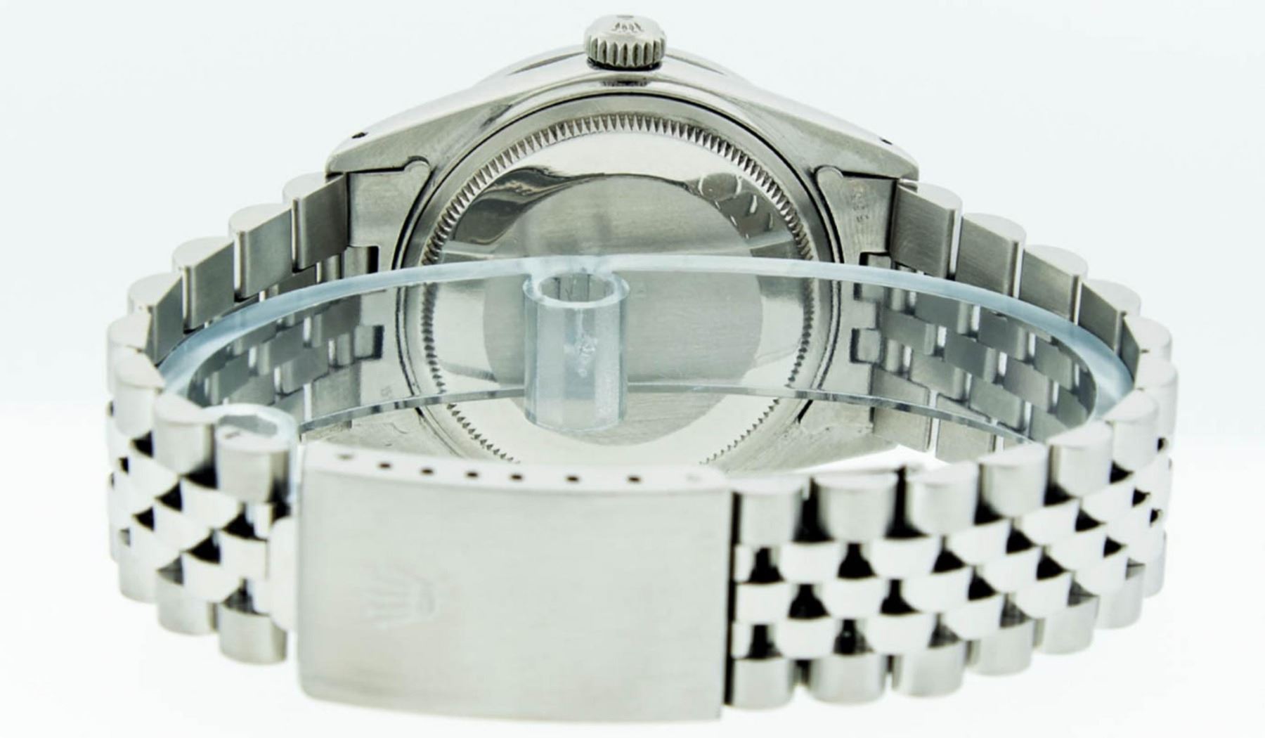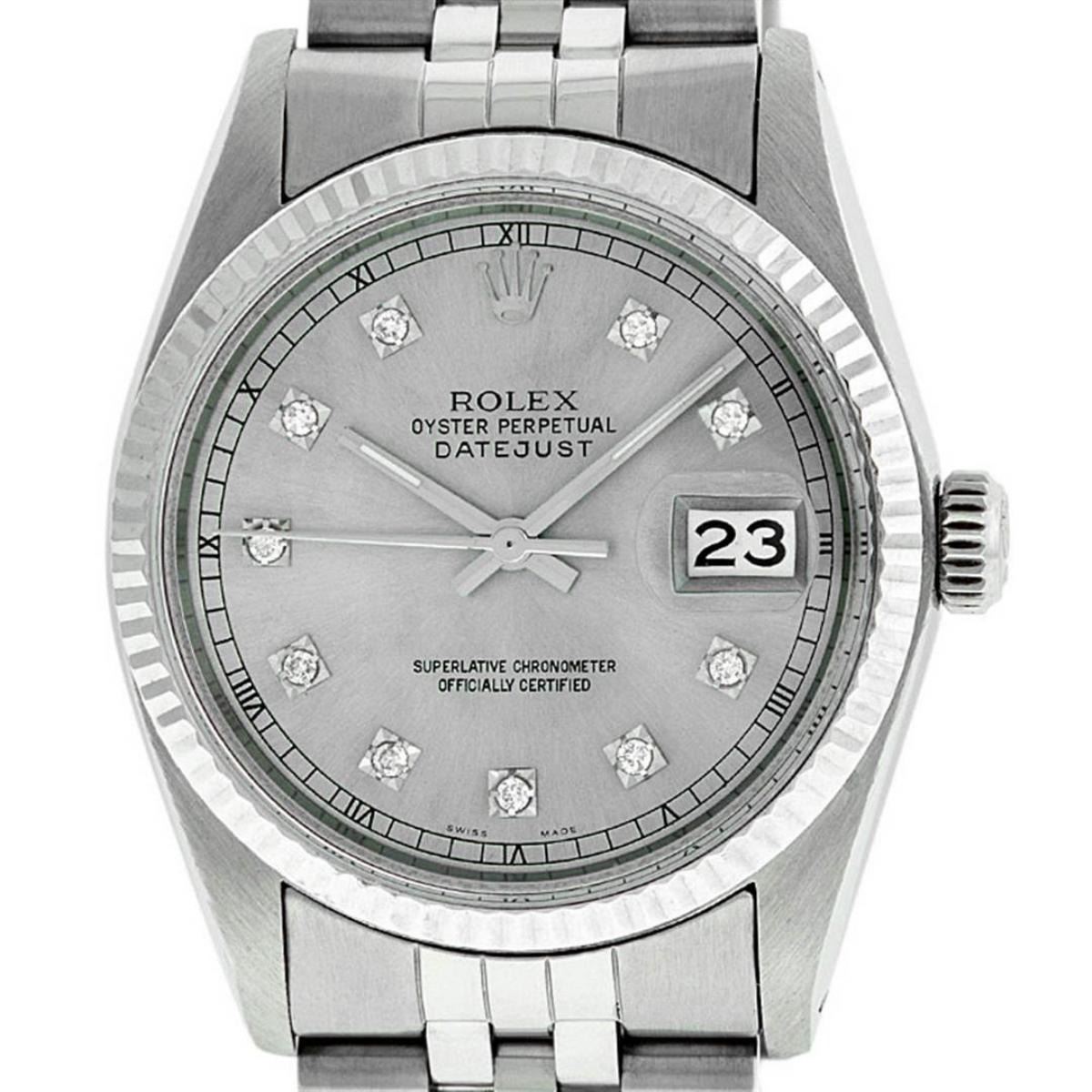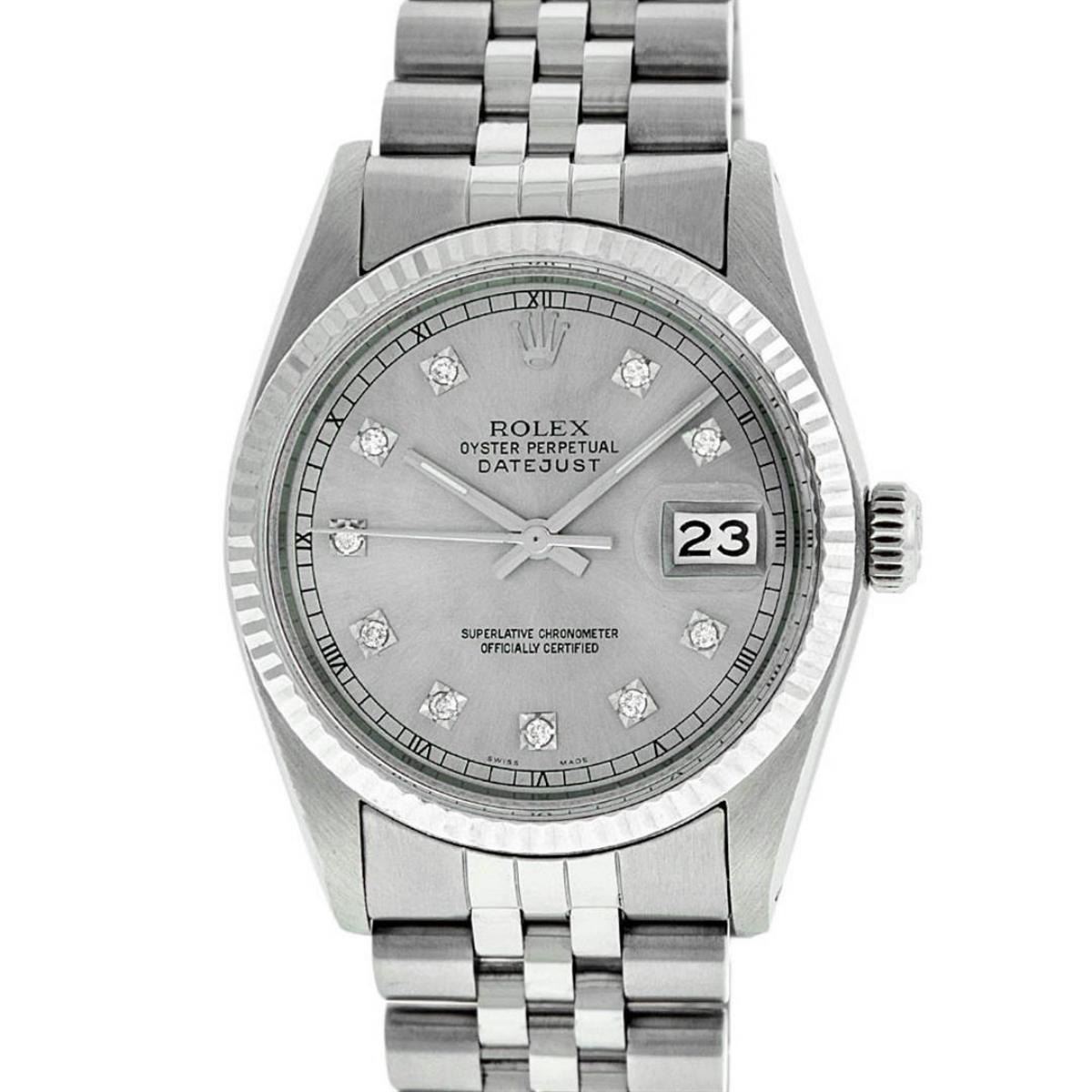 One Mens Stainless Steel Rolex Datejust Polished Bright with Satin Finish, Serviced & Electronically Tested, Stainless Steel Case: 36mm, Stainless Steel Crown, Bezel: 14K White Gold Fluted Bezel. Custom Crystal: New Acrylic Cyclops Lens. Custom Hands: New Luminescent Hands. Movement: Automatic Winding Movement Caliber 3035. Custom Dial: Slate Grey Diamond Dial With Square Roman Track, Diamond Count: 10 Diamond in Dial G To H In Color, SI-VS Clarity. Date Window: 3 O'Clock Position Date Display, Quickset, Model: Datejust, Condition: G-6 Extra Fine. Bracelet: Stainless Steel Jubilee. Bright Polish & Satin Finish. 7.0 Inch Length, Adjustable. Standard Clasp, With Rolex Logo. Watch Has Been Serviced And Polished It Is Free Of All Scratches And Dents. This Watch Has Been Serviced Time Tested And Is In Excellent Condition It Is Free Of All Scratches And Dents