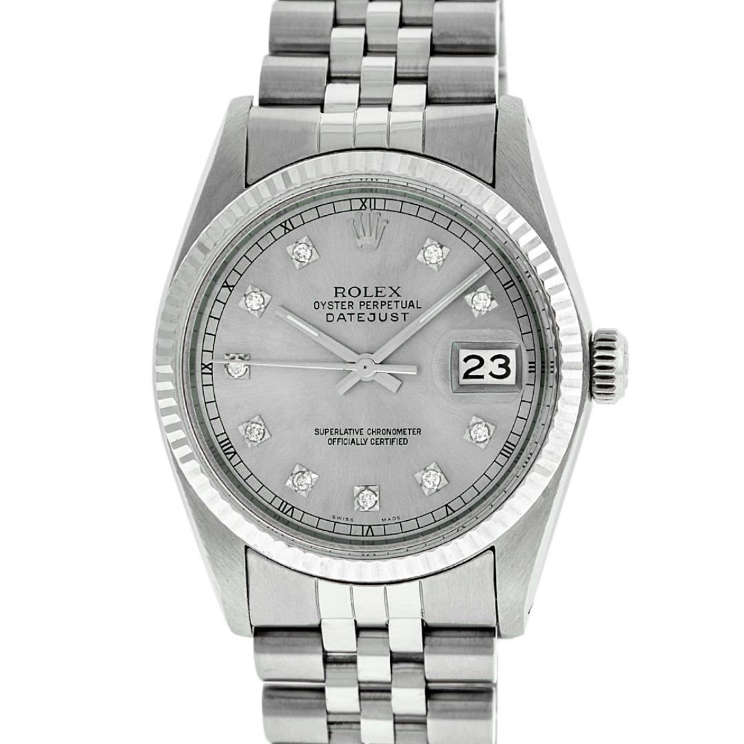 One Mens Pre Owned Stainless Steel Rolex Datejust Polished Bright with Satin Finish, Serviced & Electronically Tested, Stainless Steel Case: 36mm, Stainless Steel Crown, Bezel: White Gold Fluted Bezel. Custom Crystal: New Acrylic With Magnified Date Window. Custom Hands: New Luminescent Hands. Rolex Movement: Automatic Winding Movement 3035. Custom Dial: Custom Slate Grey With Added Diamonds, Diamond Count: 10 Diamond in Dial. Date Window: 3 O'Clock Position Date Display, Quickset, Model: Quickset Datejust, Condition: G-6 Extra Fine. Rolex Bracelet: Stainless Steel Jubilee Band. Bright Polish & Satin Finish. 7.0 Inch Length, Adjustable. Standard Clasp, With Rolex Logo. This Watch Has Been Serviced And Polished It Is Free Of All Scratches And Dents.