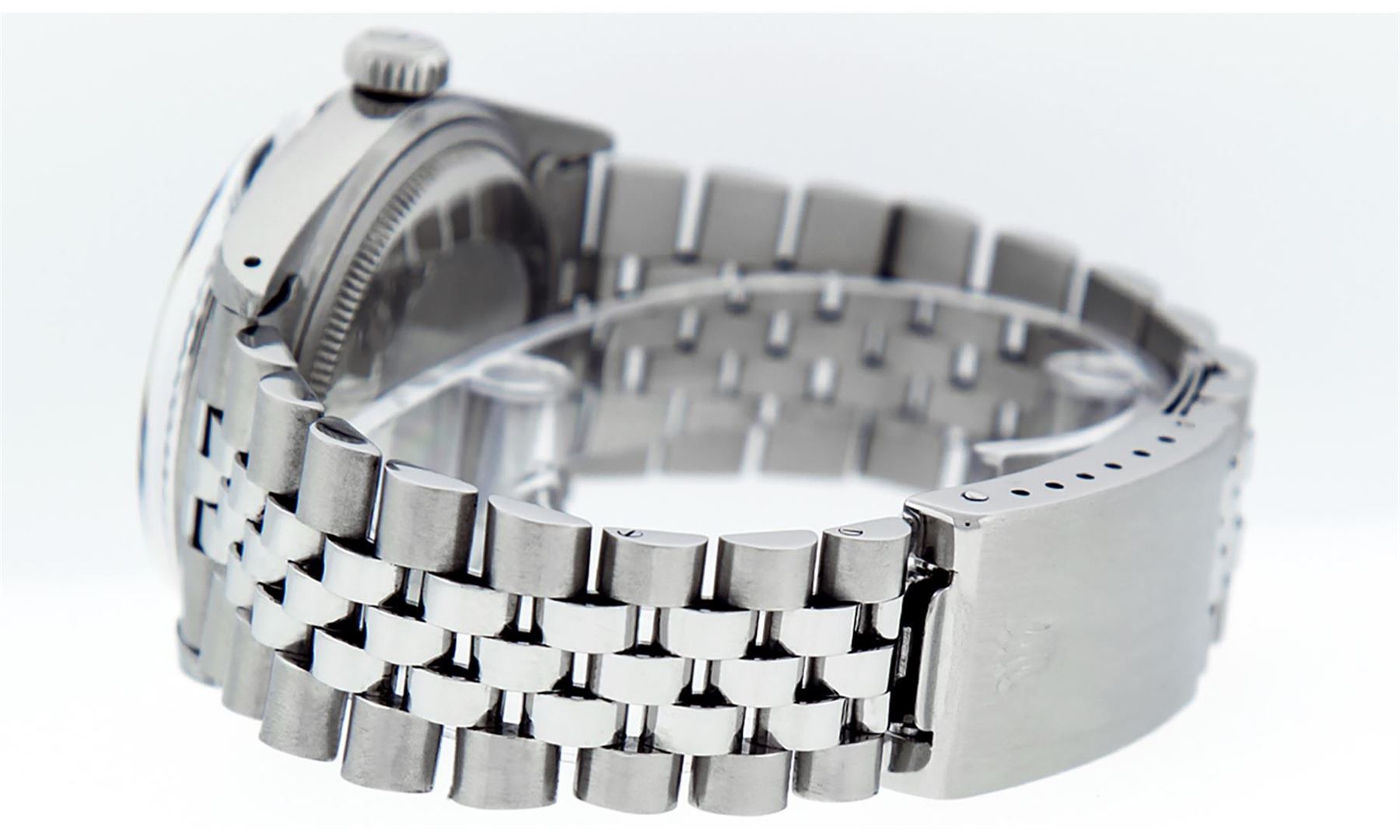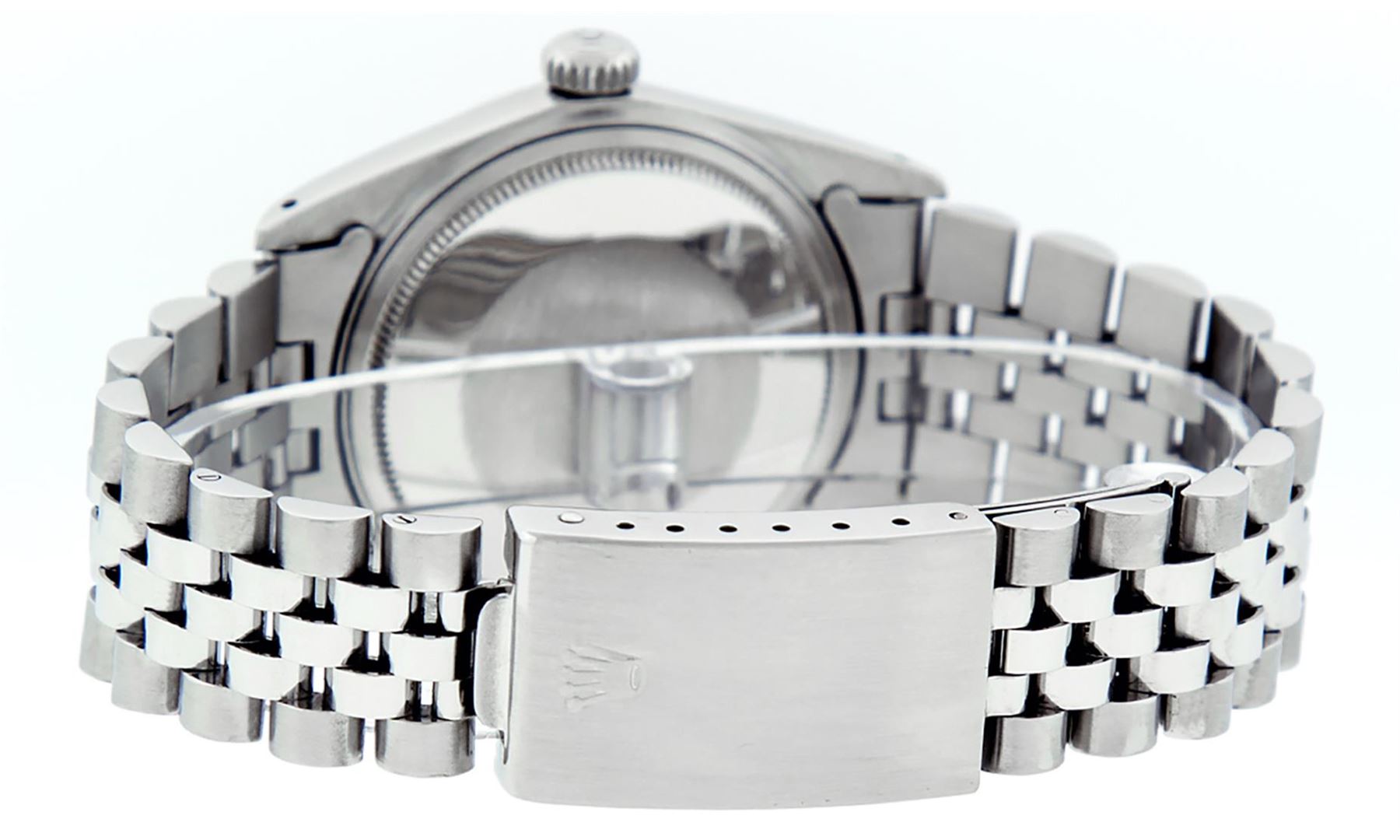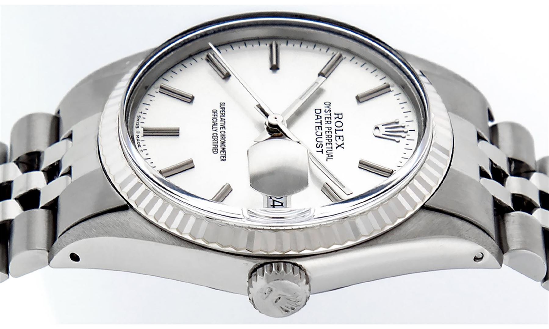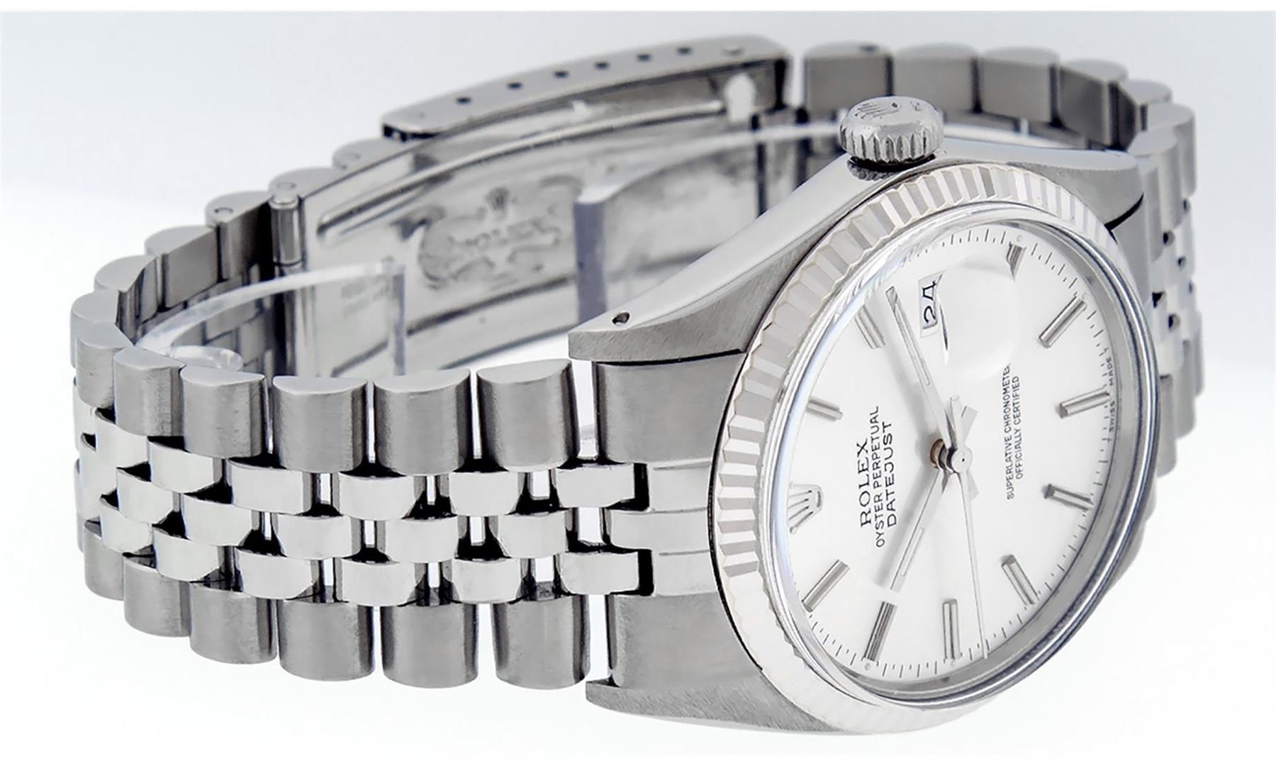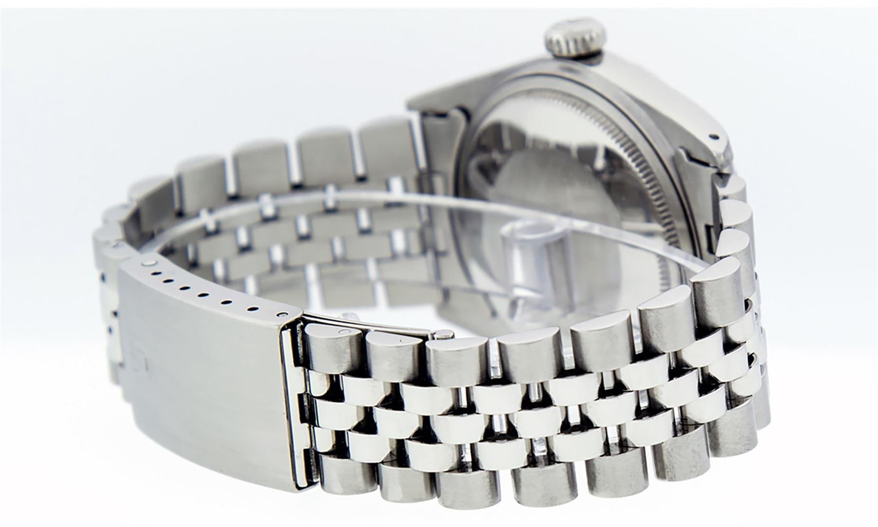 One Mens Stainless Steel Rolex Datejust Polished, Serviced & Electronically Tested, Stainless Steel Case: 36mm, Stainless Steel Crown, Bezel: 14K White Gold Fluted Bezel. Custom Crystal: New Acrylic Cyclops Lens. Custom Hands: New Luminescent Hands. Movement: Automatic Winding Movement Caliber 3035. Custom Dial: Slate Grey Index With Dash Track. Date Window: 3 O'Clock Position Date Display, Quickset, Model: Datejust, Condition: G-6 Extra Fine. Bracelet: Stainless Steel Jubilee Band. Bright Polish & Satin Finish. 7.0 Inch Length, Adjustable. Standard Clasp, With Rolex Logo. This Watch Has Been Serviced Time Tested And Is In Excellent Condition It Is Free Of All Scratches And Dents.
