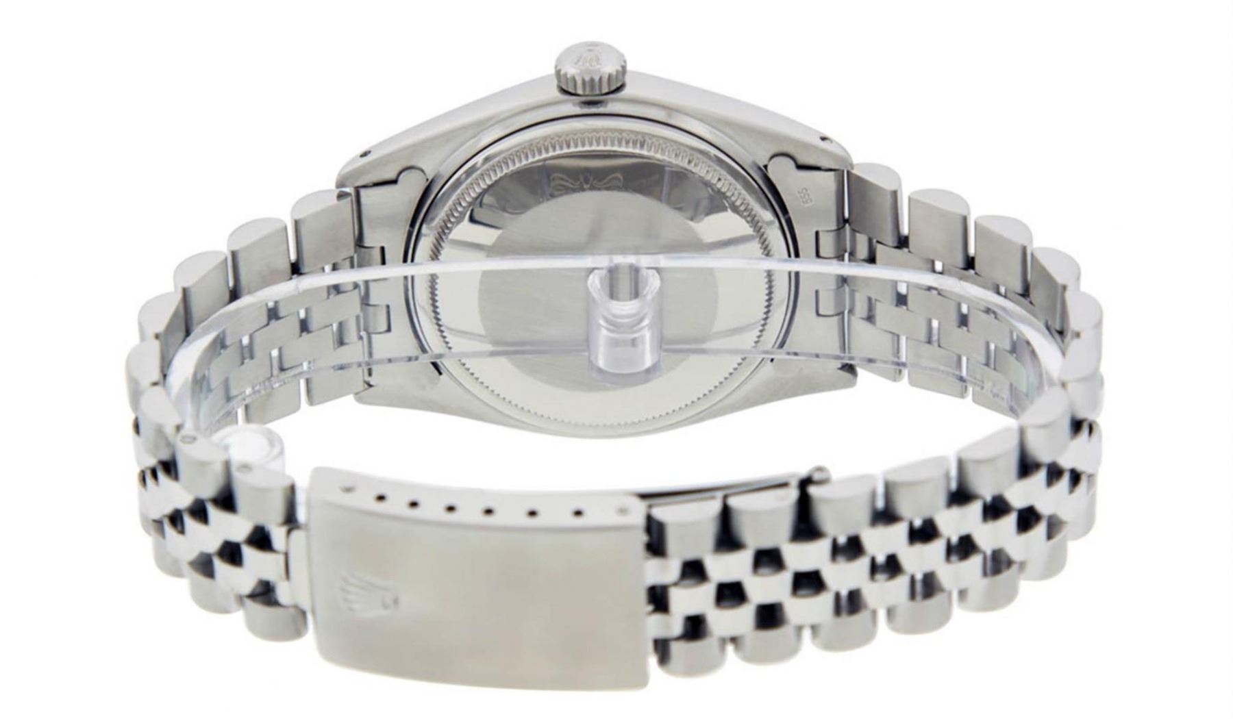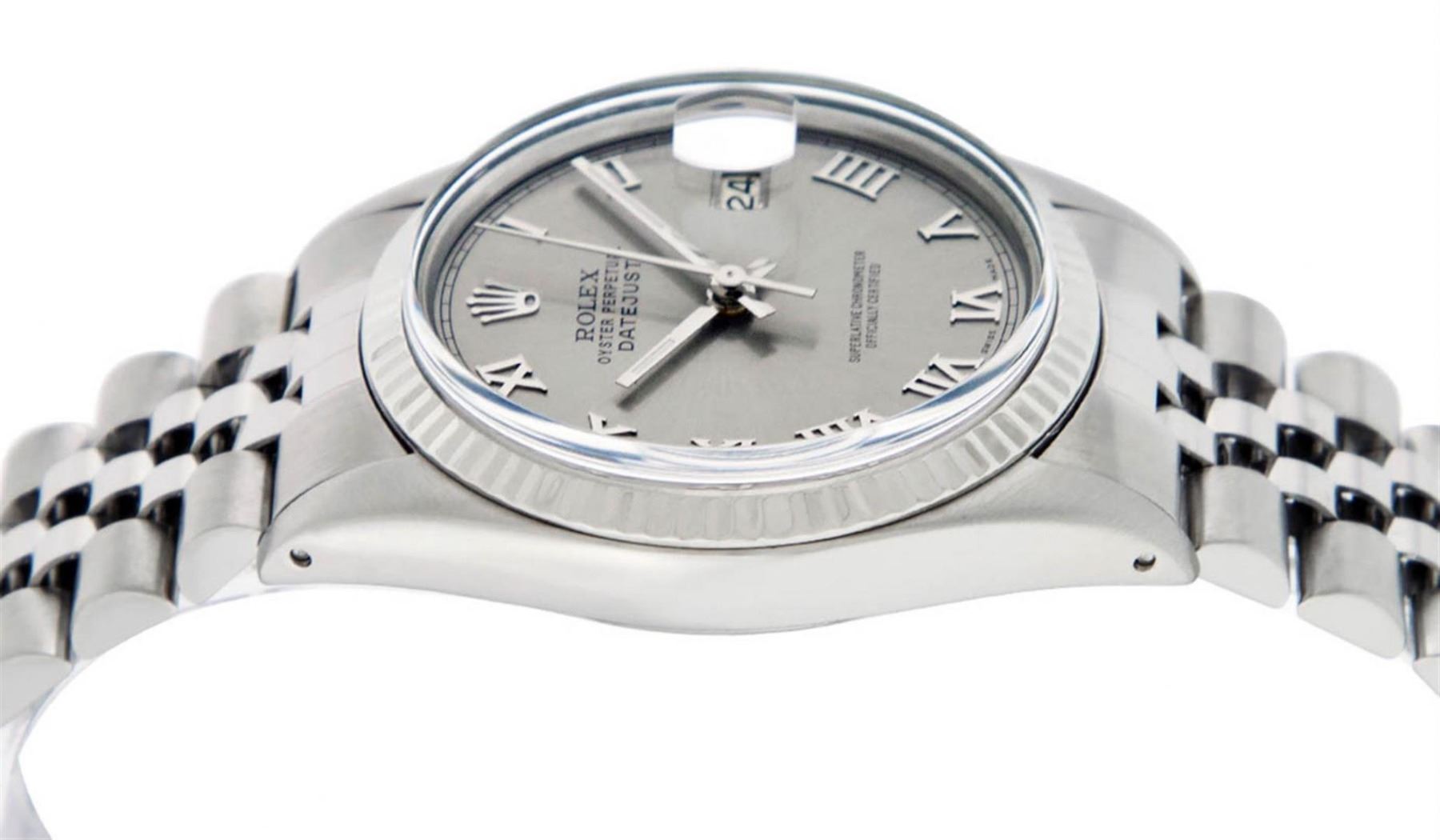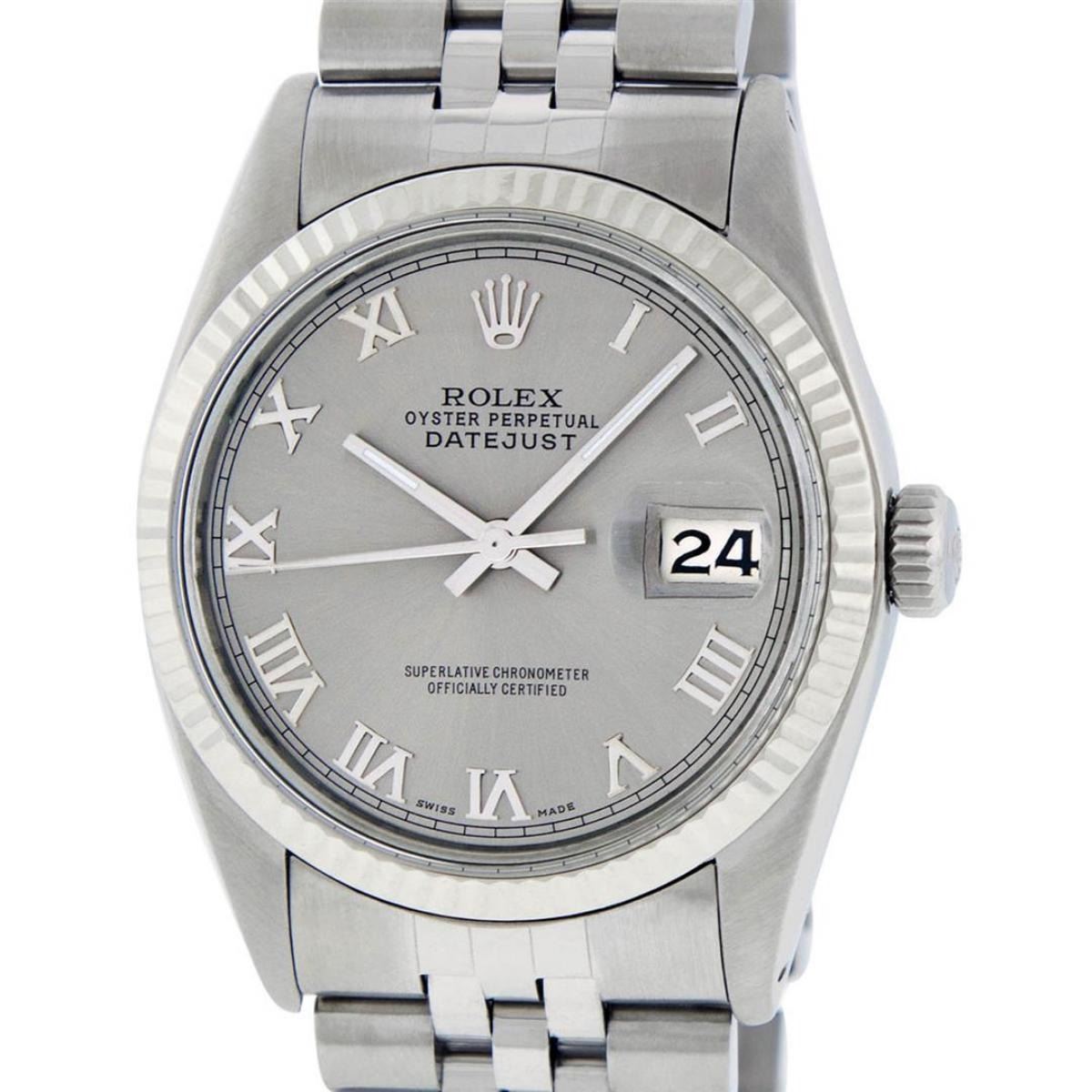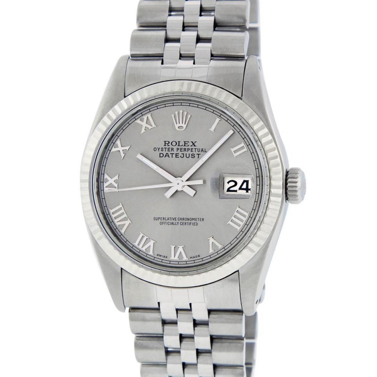 One Mens Stainless Steel Rolex Datejust Polished, Serviced & Electronically Tested, Stainless Steel Case: 36mm, Stainless Steel Crown, Bezel: 14K White Gold Fluted Bezel. Custom Crystal: New Acrylic Cyclops Lens. Custom Hands: New Luminescent Hands. Movement: Automatic Winding Movement Caliber 3035. Custom Dial: Slate Grey Roman With Square Track. Date Window: 3 O'Clock Position Date Display, Quickset, Model: Datejust, Condition: G-6 Extra Fine. Bracelet: Stainless Steel Jubilee. Bright Polish & Satin Finish. 7.0 Inch Length, Adjustable. Standard Clasp, With Rolex Logo. This Watch Has Been Serviced Time Tested And Is In Excellent Condition It Is Free Of All Scratches And Dents