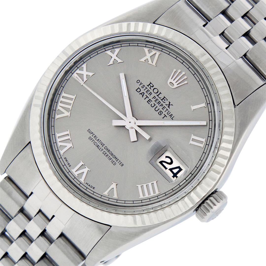 One Mens Pre Owned Stainless Steel Rolex Datejust Polished, Serviced & Electronically Tested, Rolex Stainless Steel Case: 36mm, Rolex Stainless Steel Crown, Rolex Bezel: 14K White Gold Fluted Bezel. Custom Crystal: New Plastic With Date Window. Custom Hands: New Luminescent Hands. Rolex Movement: Automatic Winding Movement 3035. Custom Dial: Refinished To Slate Grey Roman With Square Track. Date Window: 3 O'Clock Position Date Display, Quickset, Model: Datejust, Condition: G-6 Extra Fine. Rolex Bracelet: Stainless Steel Jubilee Band. Bright Polish & Satin Finish. 7.0 Inch Length, Adjustable. Standard Clasp, With Rolex Logo. This Watch Has Been Serviced Time Tested And Is In Excellent Condition It Is Free Of All Scratches And Dents.