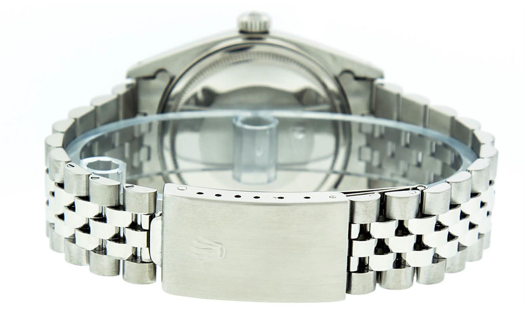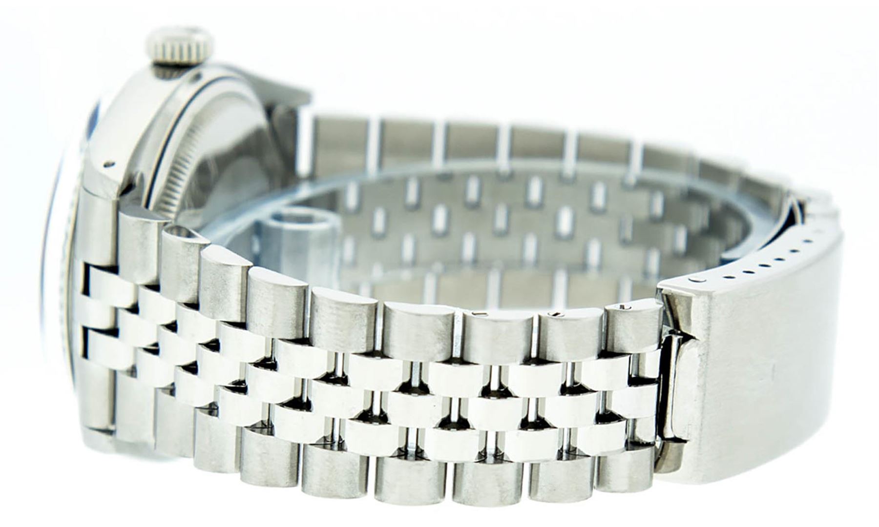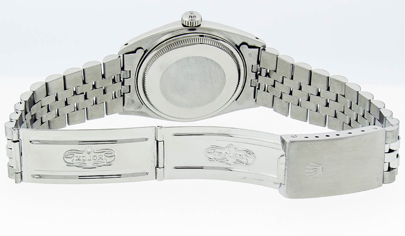 One Mens Stainless Steel Rolex Datejust Polished Bright with Satin Finish, Serviced & Electronically Tested, Stainless Steel Case: 36mm, Stainless Steel Crown, Bezel: 14K White Gold Fluted Bezel. Custom Crystal: New Acrylic Cyclops Lens. Custom Hands: New Luminescent Hands. Movement: Automatic Winding Movement Caliber 3035. Custom Dial: Black Baguette Diamond 8 + 2 Synthetic Ruby Dial, Stone Count: 8 Baguette Diamonds in Dial + 2 Synthetic Ruby Baguettes, G To H In Color, SI-VS Clarity. Date Window: 3 O'Clock Position Date Display, Quickset, Model: Datejust, Condition: G-6 Extra Fine. Bracelet: Stainless Steel Jubilee. Bright Polish & Satin Finish. 7.0 Inch Length, Adjustable. Standard Clasp, With Rolex Logo. Watch Has Been Serviced And Polished It Is Free Of All Scratches And Dents.