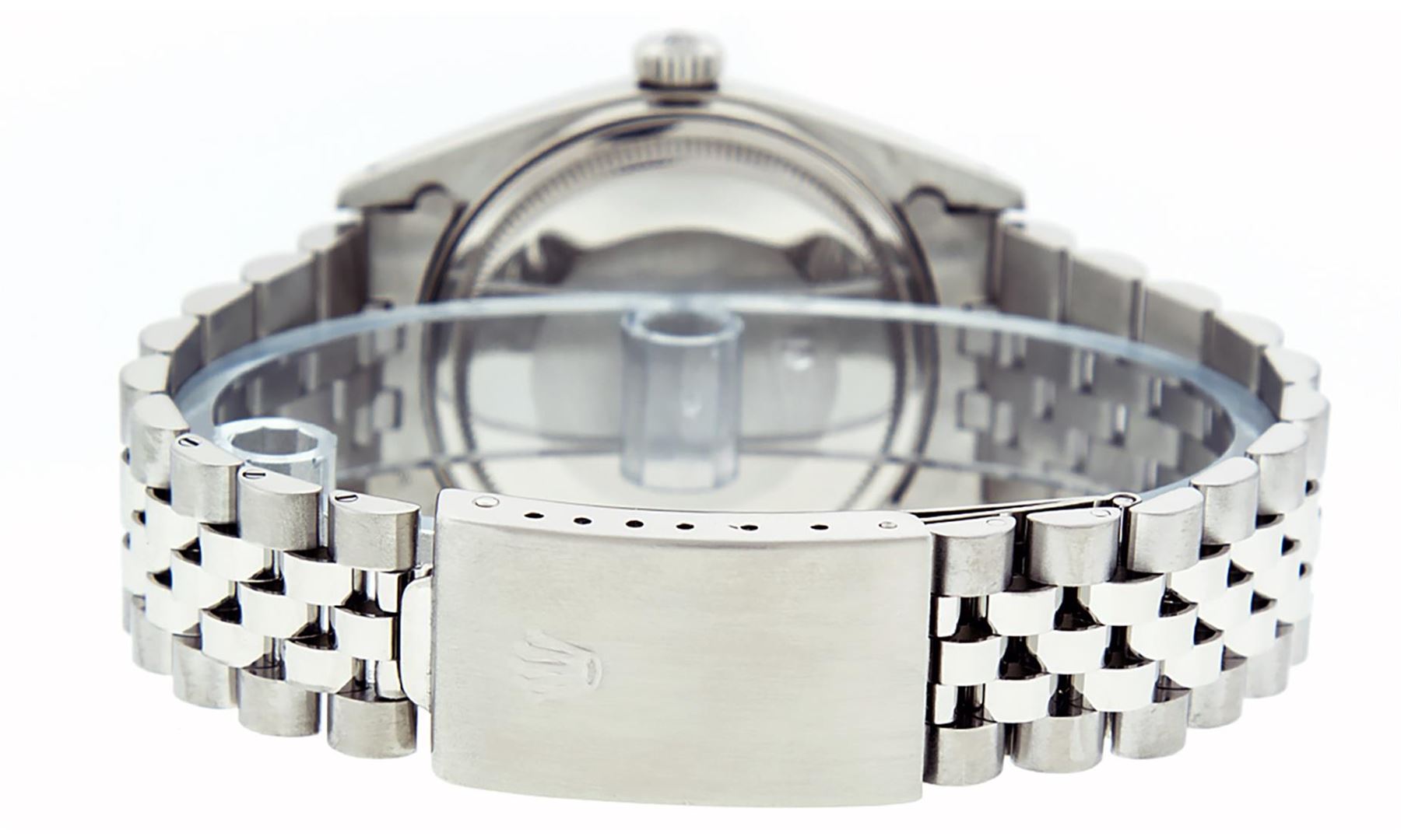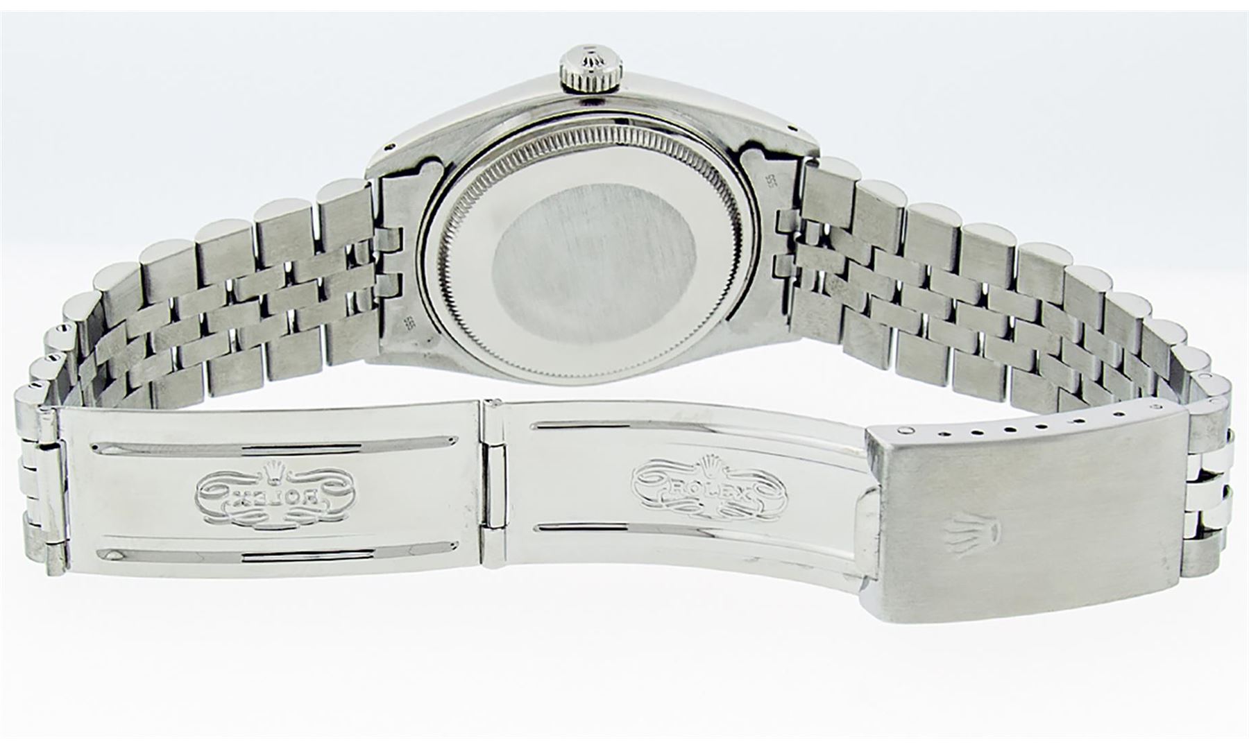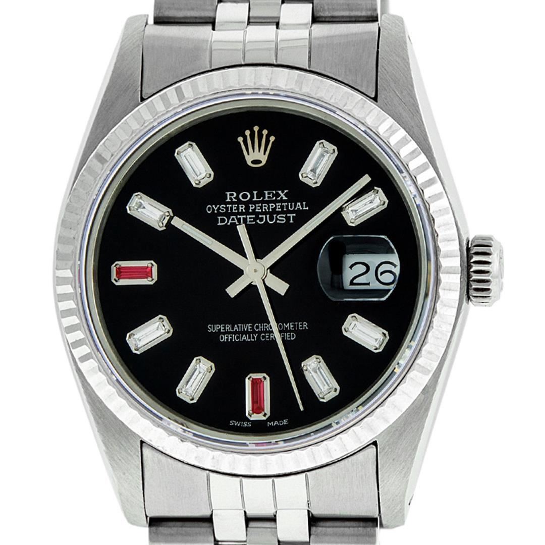 One Mens Stainless Steel Rolex Datejust Polished Bright with Satin Finish, Serviced & Electronically Tested, Stainless Steel Case: 36mm, Stainless Steel Crown, Bezel: White Gold Fluted Bezel. Custom Crystal: New Acrylic Cyclops Lens. Custom Hands: New Luminescent Hands. Movement: Automatic Winding Movement.. Custom Dial: Black Baguette Diamond 8 + 2 Synthetic Ruby Dial, Stone Count: 8 Baguette Diamonds in Dial + 2 Synthetic Ruby Baguettes, G To H In Color, SI-VS Clarity. Date Window: 3 O'Clock Position Date Display, Quickset, Model: Datejust, Condition: G-6 Extra Fine. Bracelet: Stainless Steel Jubilee. Bright Polish & Satin Finish. 7.0 Inch Length, Adjustable. Standard Clasp, With Rolex Logo. Watch Has Been Serviced And Polished It Is Free Of All Scratches And Dents.