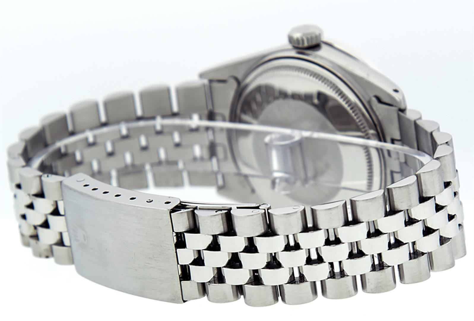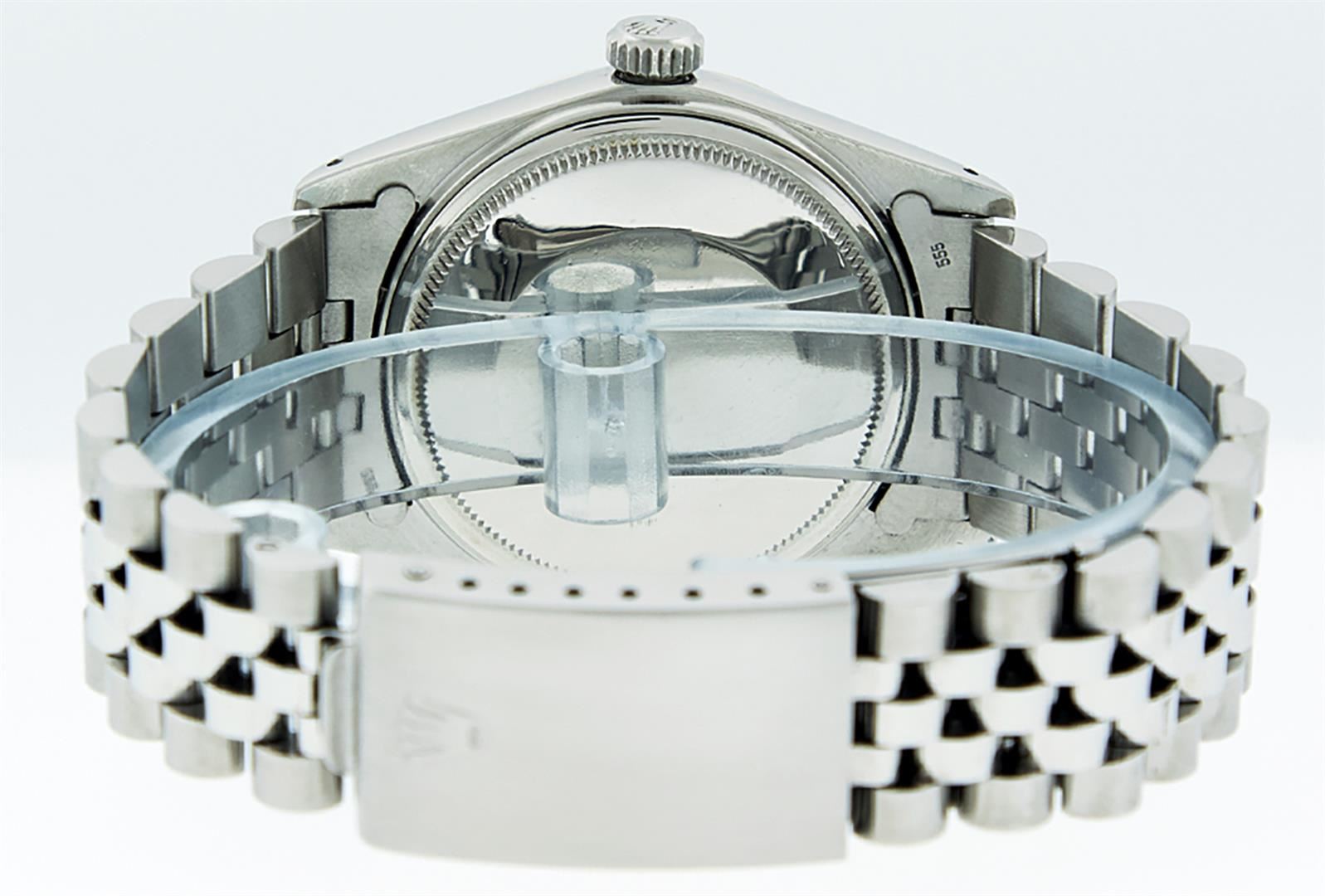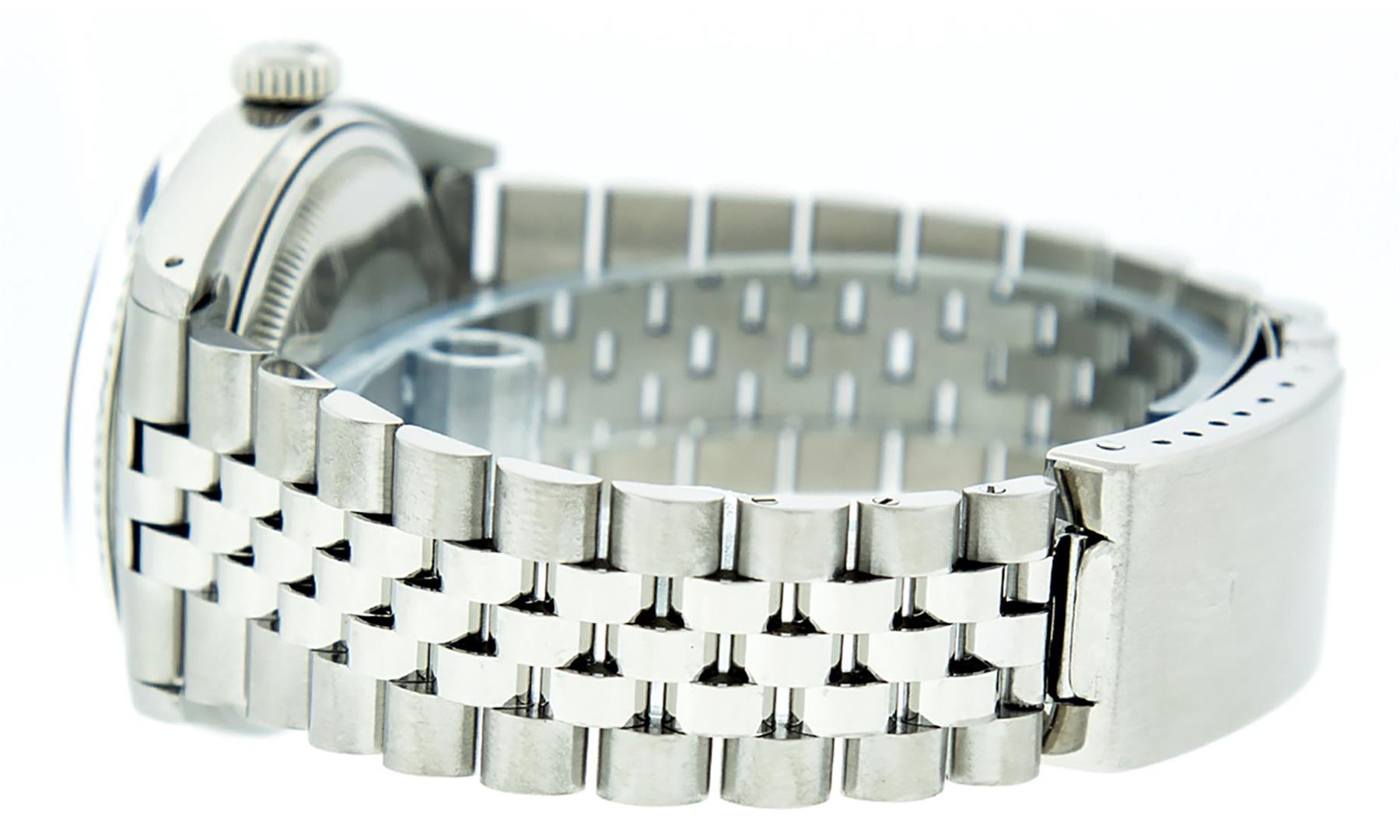 One Mens Stainless Steel Rolex Datejust Polished Bright with Satin Finish, Serviced & Electronically Tested, Stainless Steel Case: 36mm, Stainless Steel Crown, Bezel: White Gold Fluted Bezel. Custom Crystal: New Acrylic Cyclops Lens. Custom Hands: New Luminescent Hands. Movement: Automatic Winding Movement.. Custom Dial: Black Baguette Diamond 8 + 2 Synthetic Ruby Dial, Stone Count: 8 Baguette Diamonds in Dial + 2 Synthetic Ruby Baguettes, G To H In Color, SI-VS Clarity. Date Window: 3 O'Clock Position Date Display, Quickset, Model: Datejust, Condition: G-6 Extra Fine. Bracelet: Stainless Steel Jubilee. Bright Polish & Satin Finish. 7.0 Inch Length, Adjustable. Standard Clasp, With Rolex Logo. Watch Has Been Serviced And Polished It Is Free Of All Scratches And Dents.